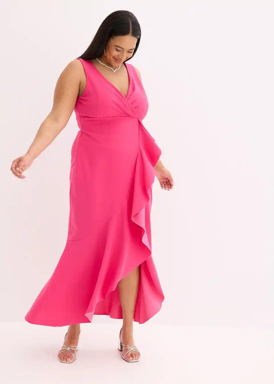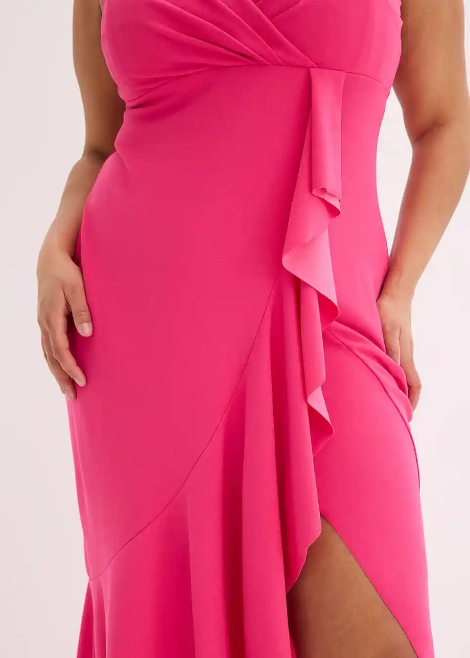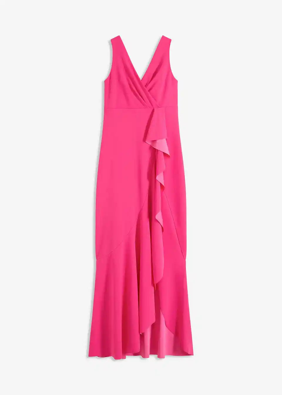 Moderna in ženstvena: večerna obleka iz strukturiranega krep materiala z volančki