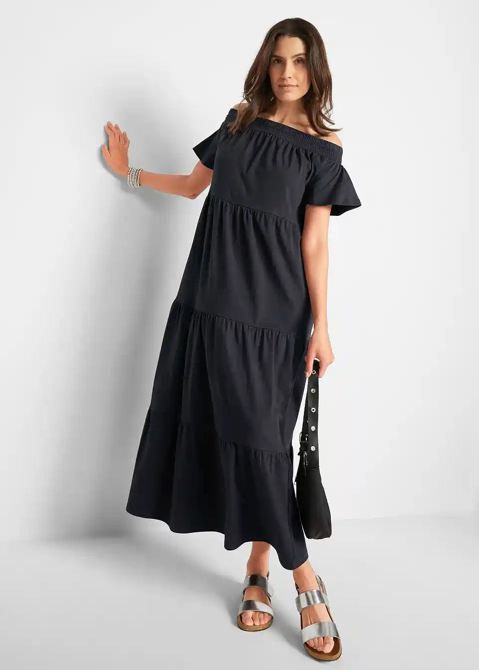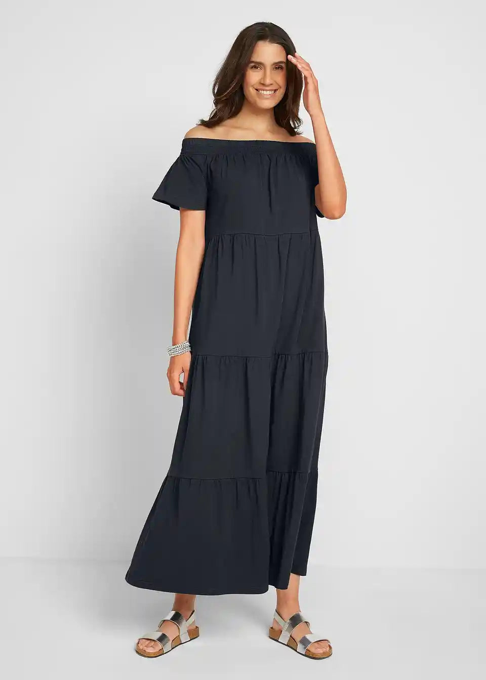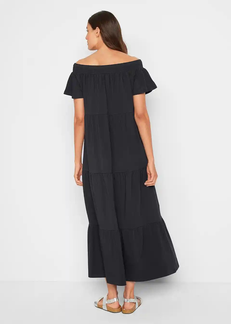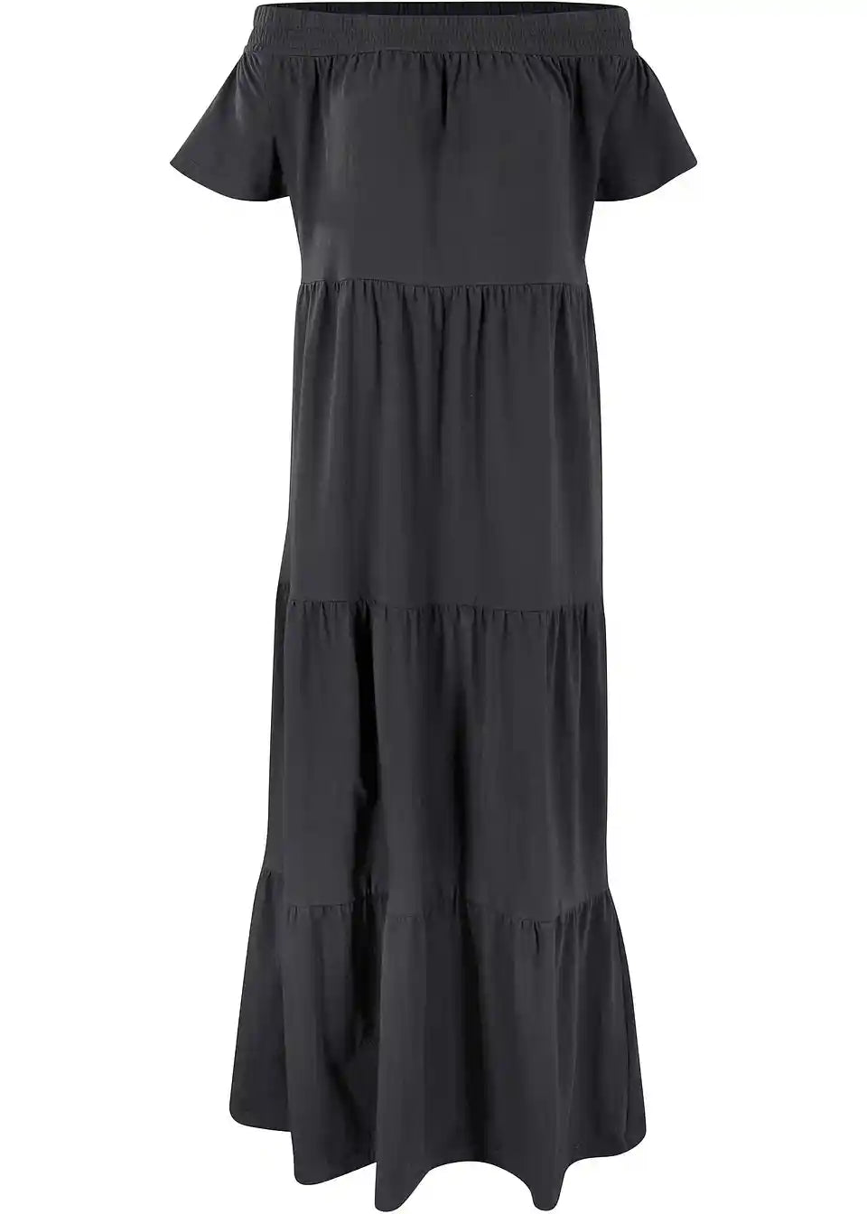 Dolga obleka z volani in carmen izrezom iz bombažnega jerseyja