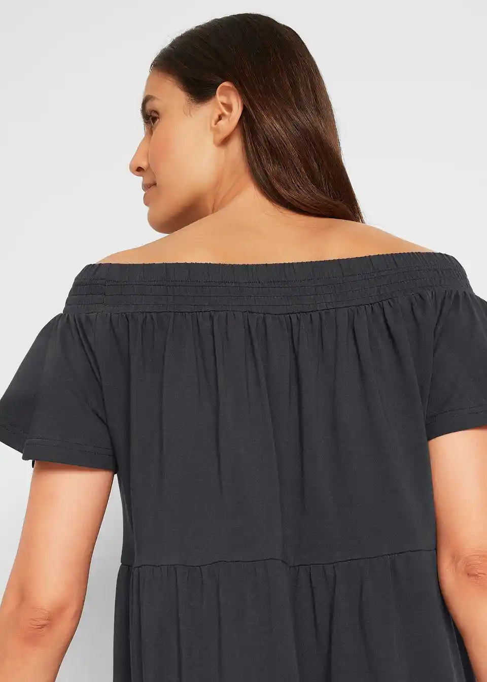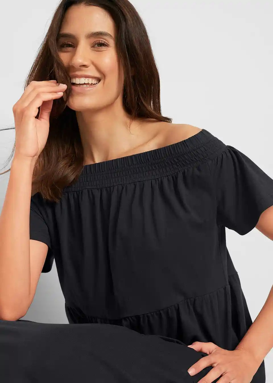 Enobarvna maksija obleka iz jerseyja s simpatičnimi volančki in širokim Carmen izrezom iz bombaža