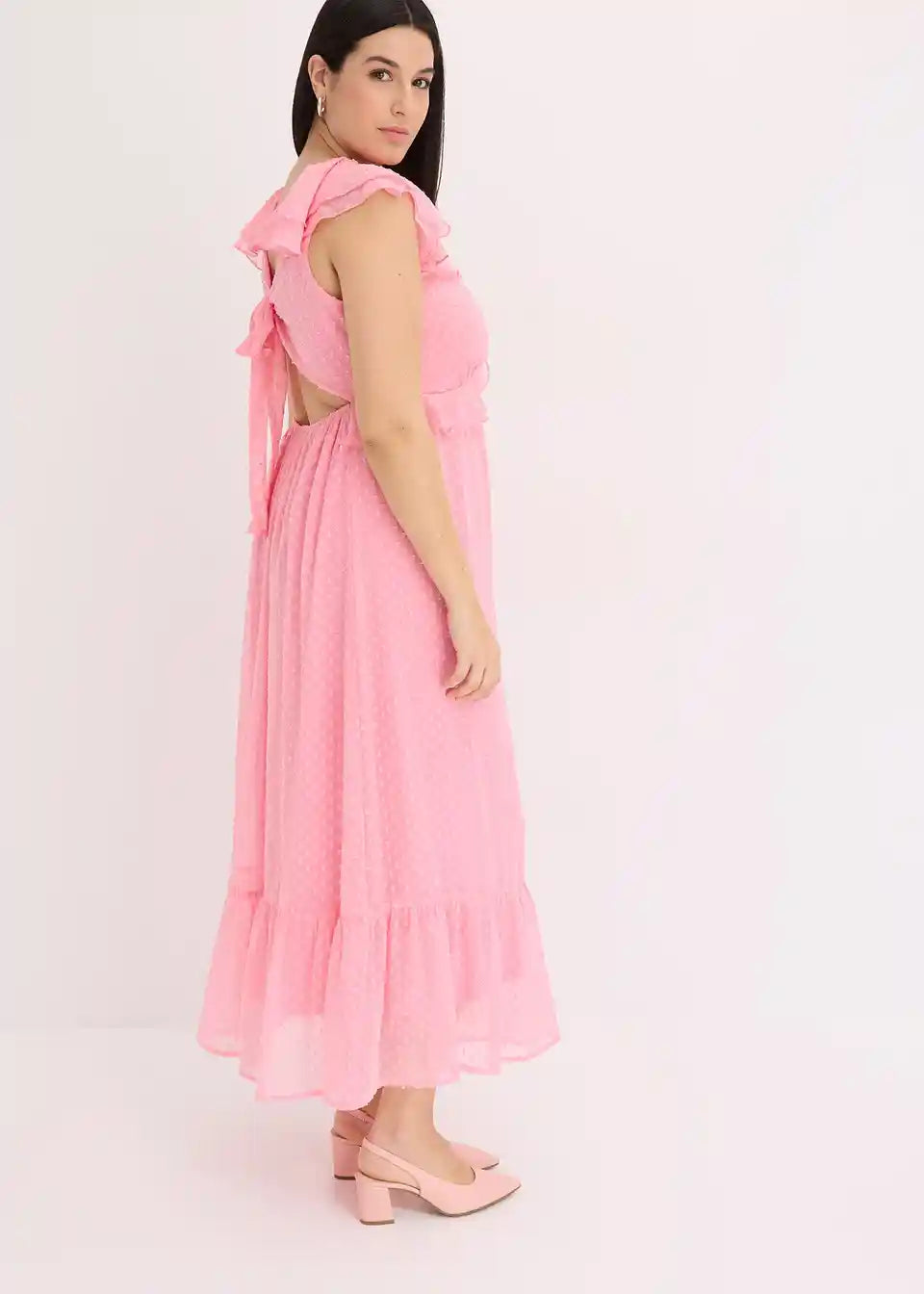 ženstvena maksikratka obleka z izrezom na hrbtu in trakom za zavezovanje zadaj