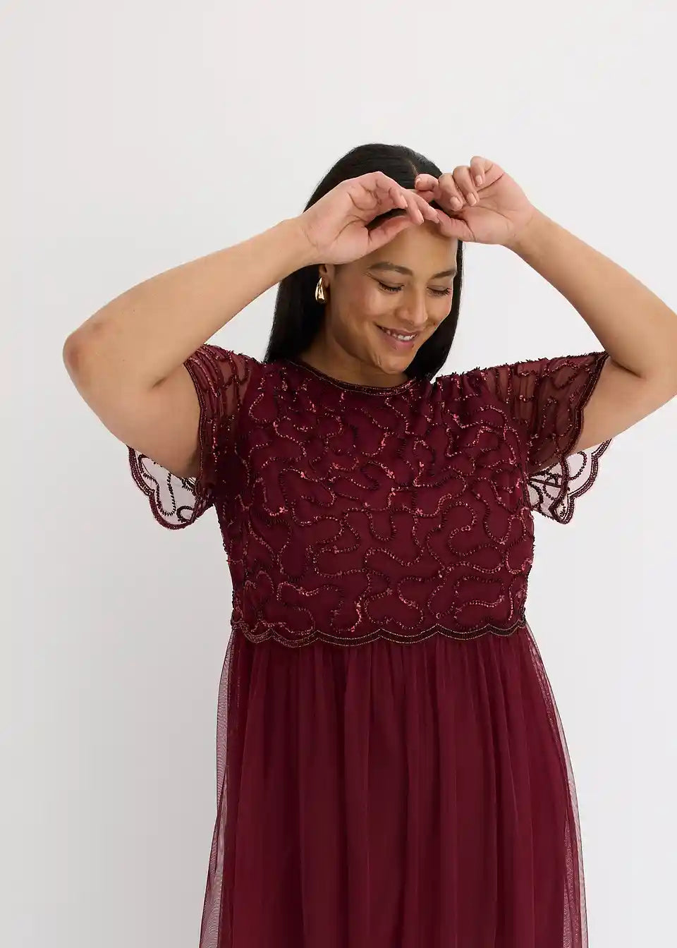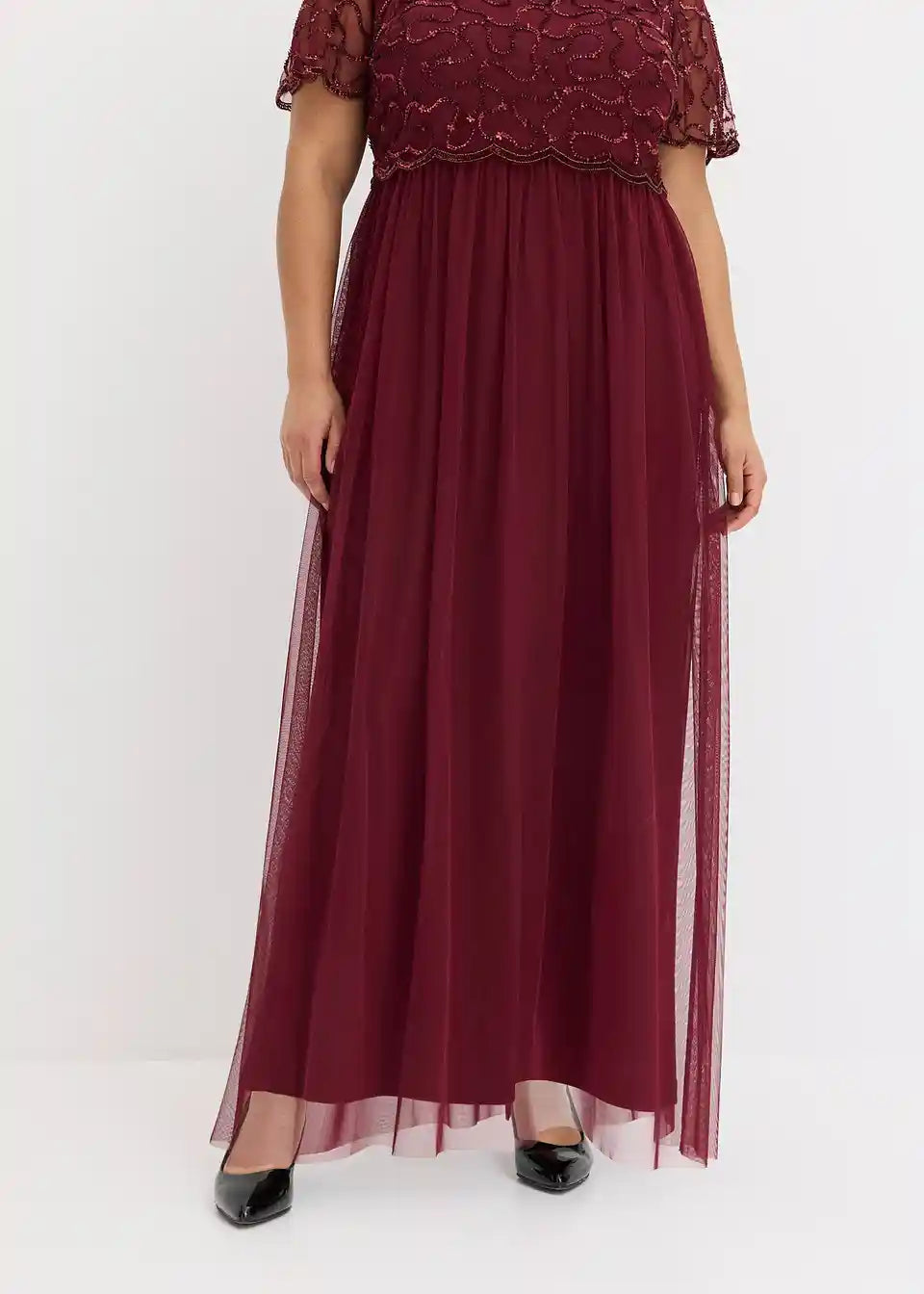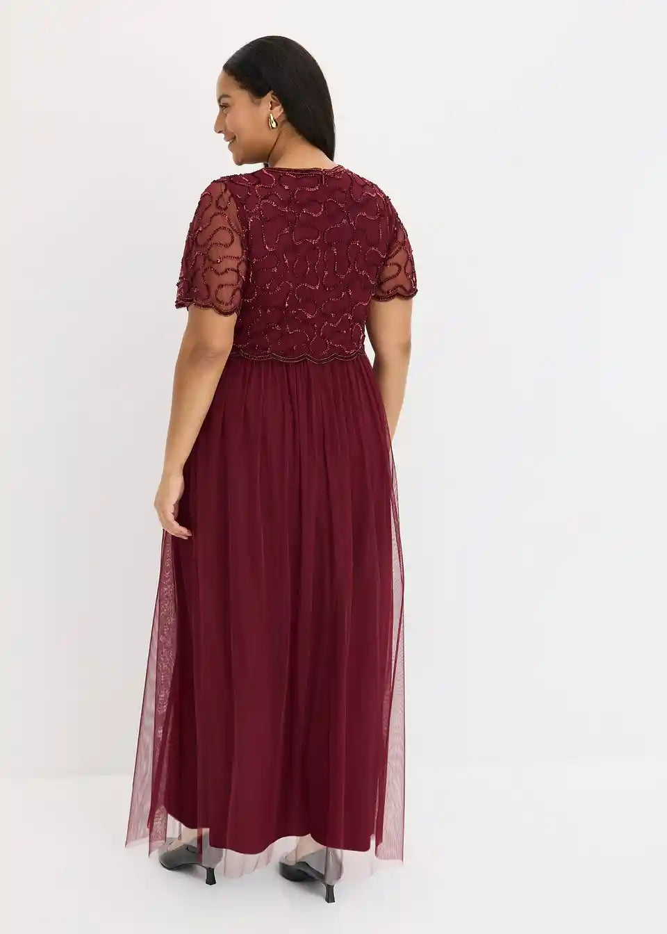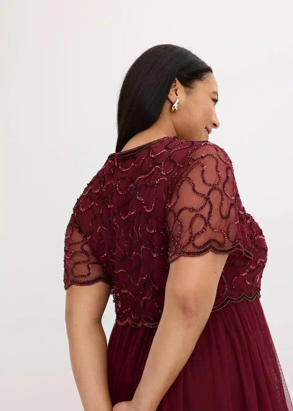 Elegantna in ženstvena: večerna obleka iz finega tila z vezenino iz bleščic na zgornjem delu. Rob v obliki školjke na zgornjem delu in rokavih dajeta obleki posebno eleganco.