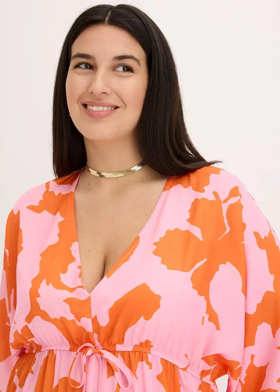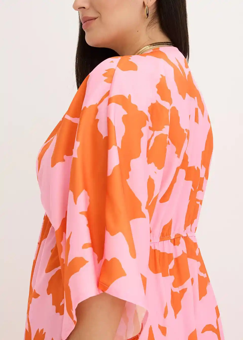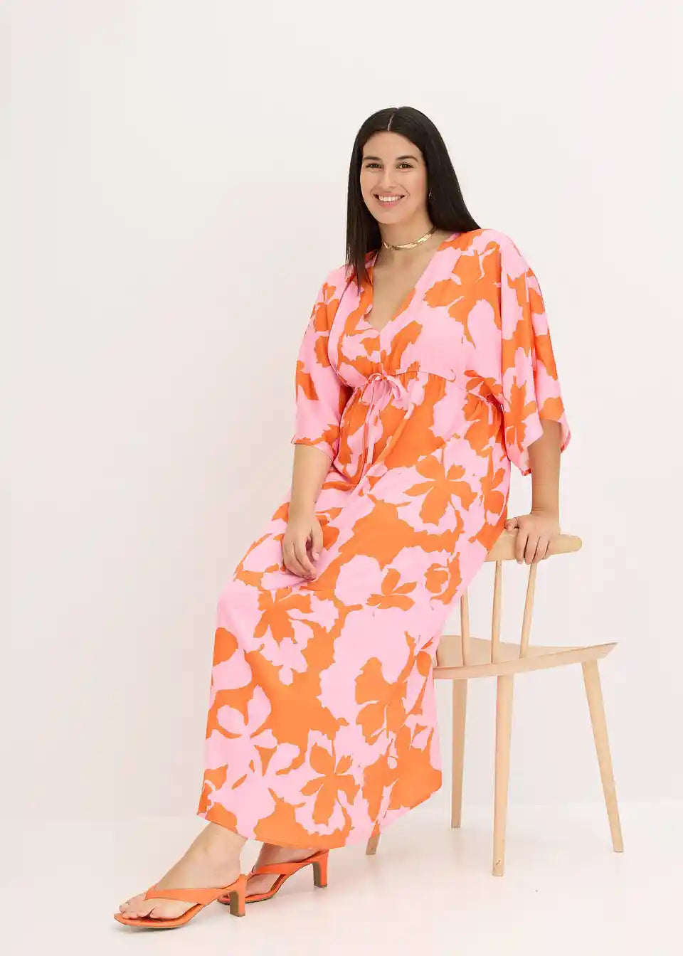 cvetlično potiskana maksimalna obleka iz tekočega satena s široko krojenimi rokavi in zavezovanjem spredaj v pasu