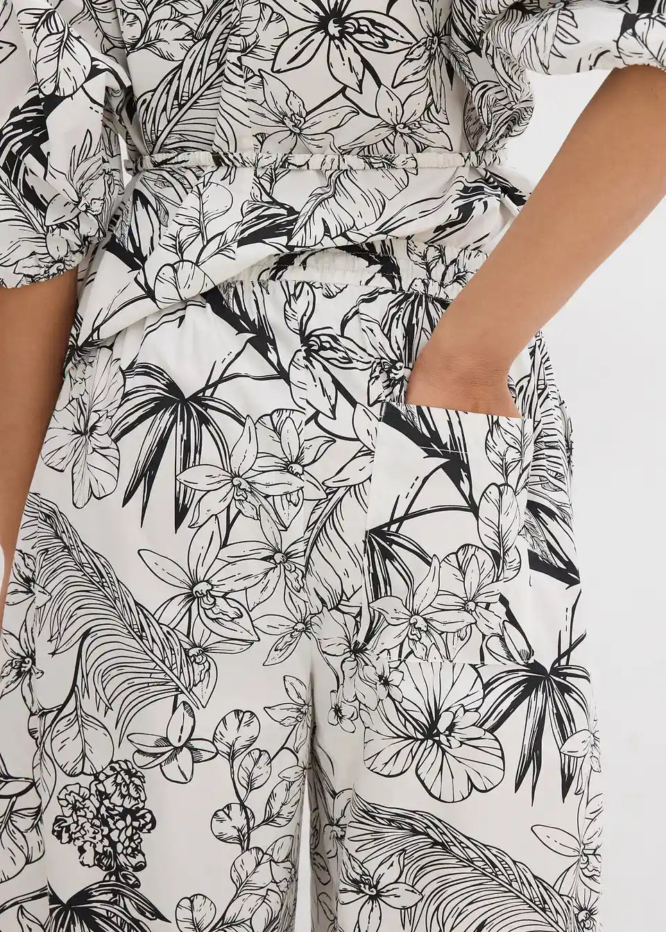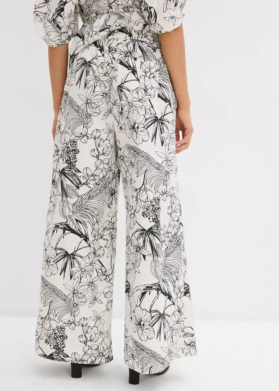 Dolge hlače z ravnim, širokim krojem in visokim pasom, s stranskimi žepi ter našitim zadnjim žepom. Sprednje zapiranje z zadrgo, kovinsko zaponko in gumbom.