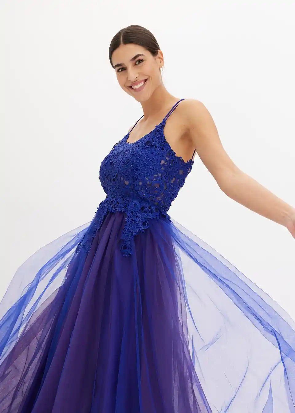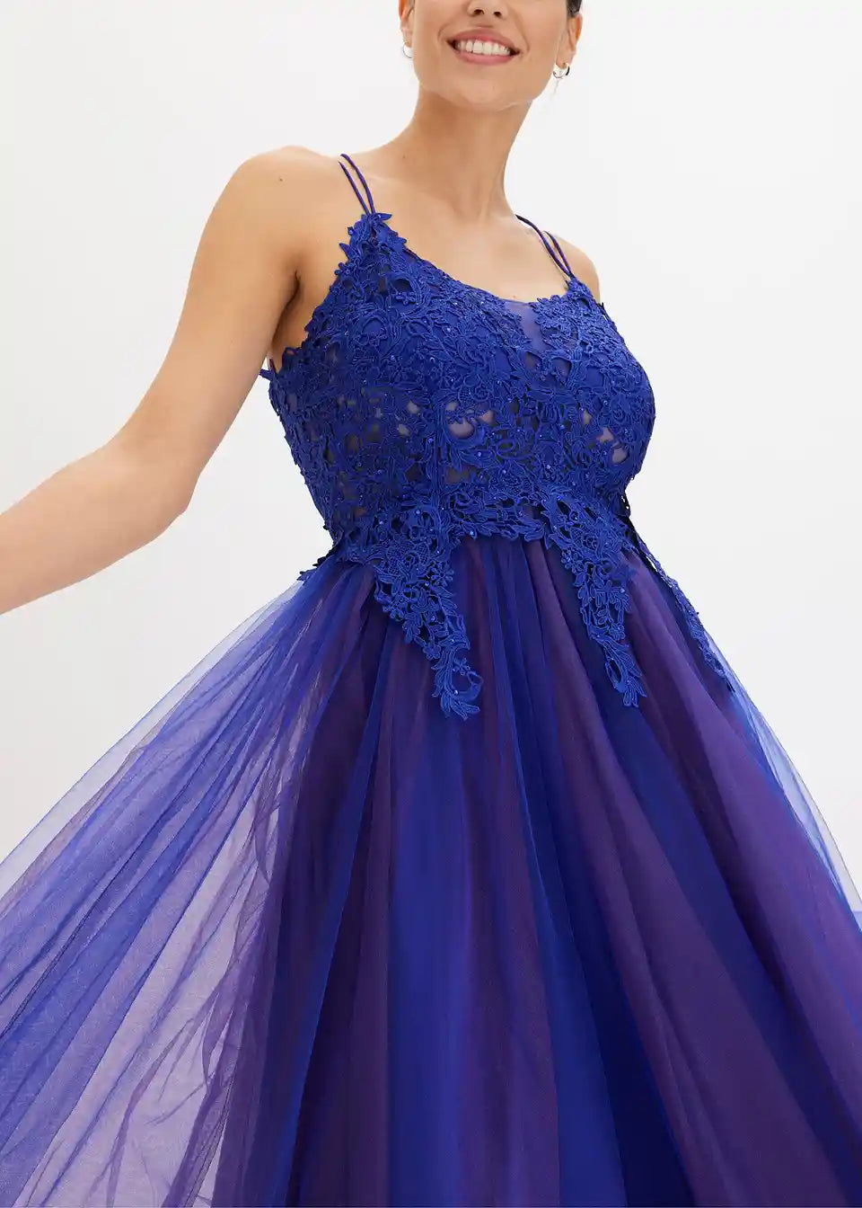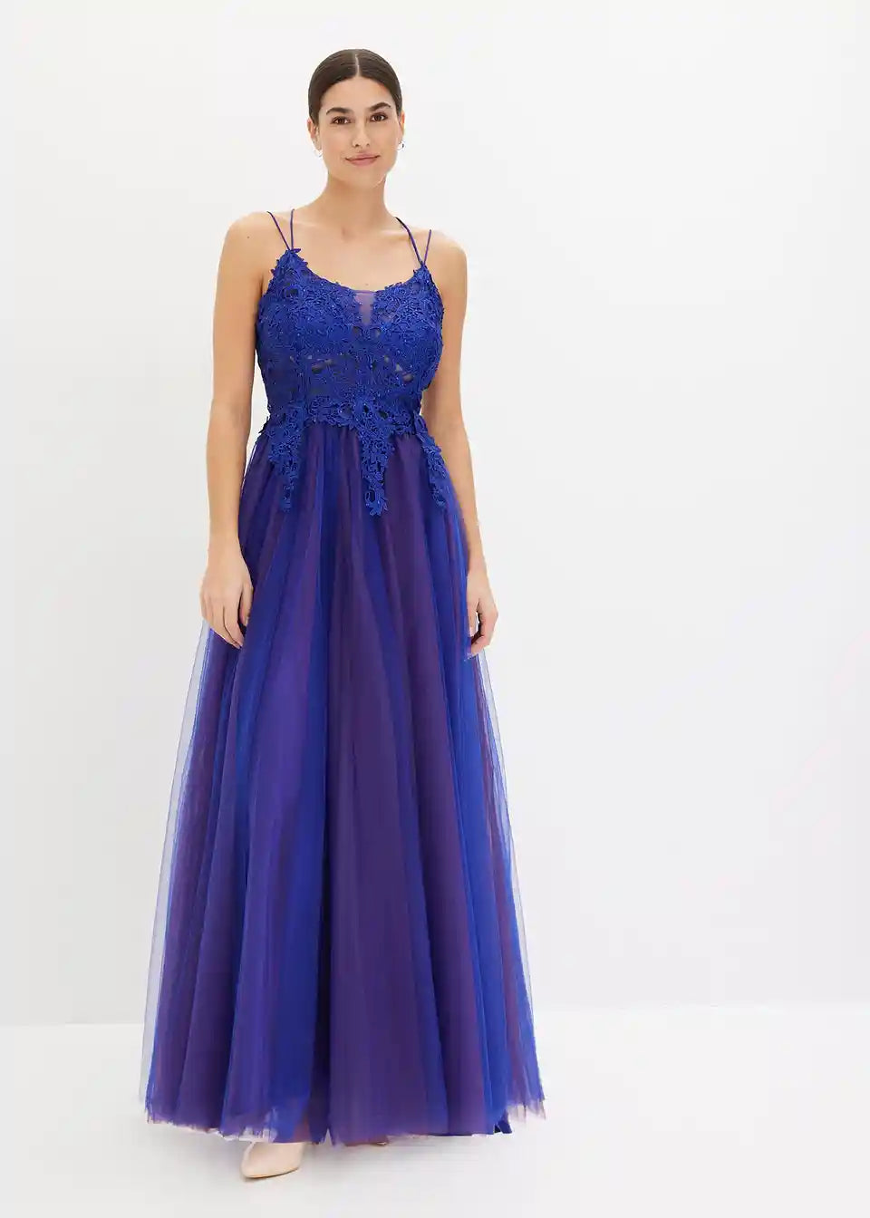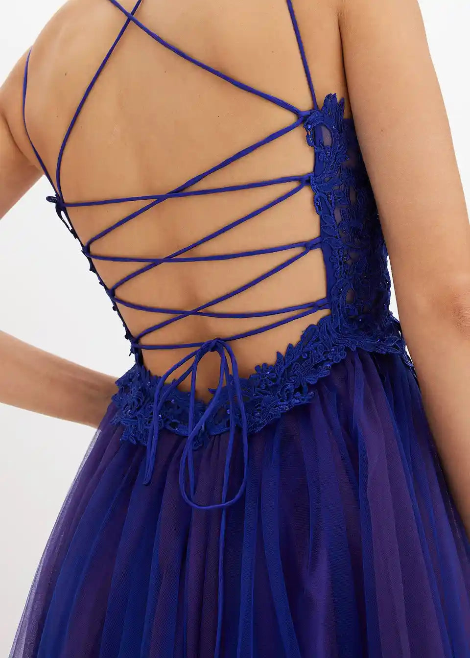 Čudovita večerna obleka s širokim krilom iz nežnega tila. Čipka na zgornjem delu, okrašena s kamenčki, in poseben hrbtni izrez s čipkastim detajlom naredijo to obleko pravi privlačen kos!