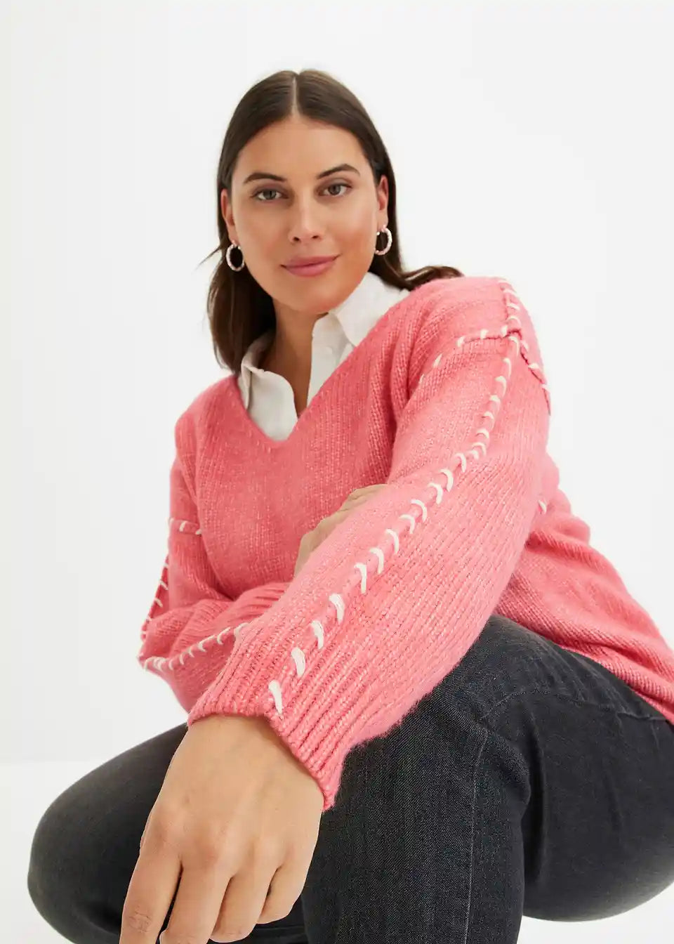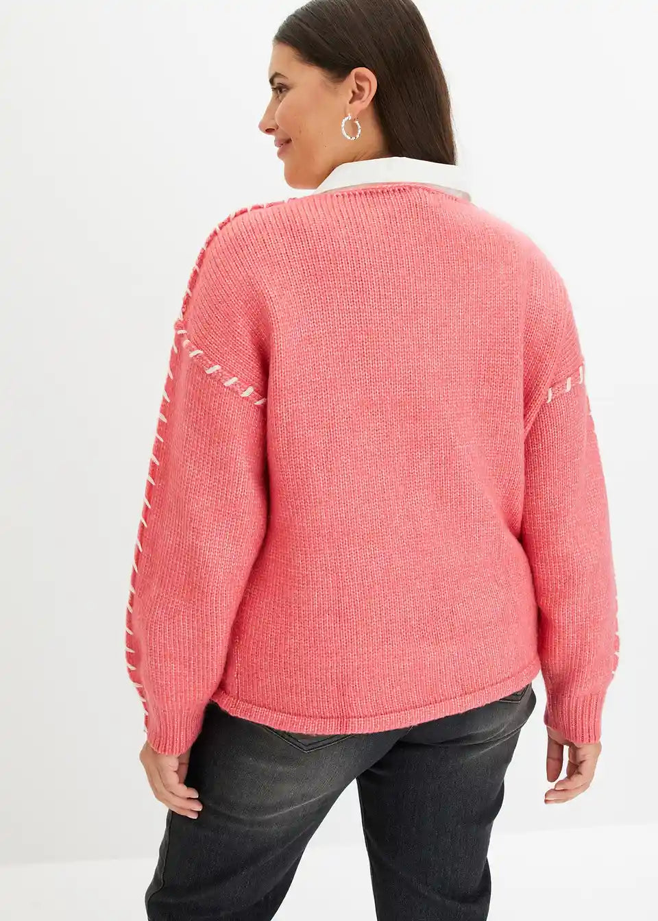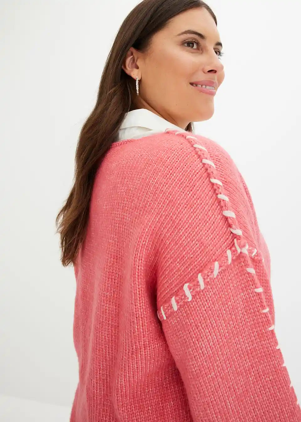 Pulover iz mehke grobe pletenine z izvezenimi kontrastnimi šivi