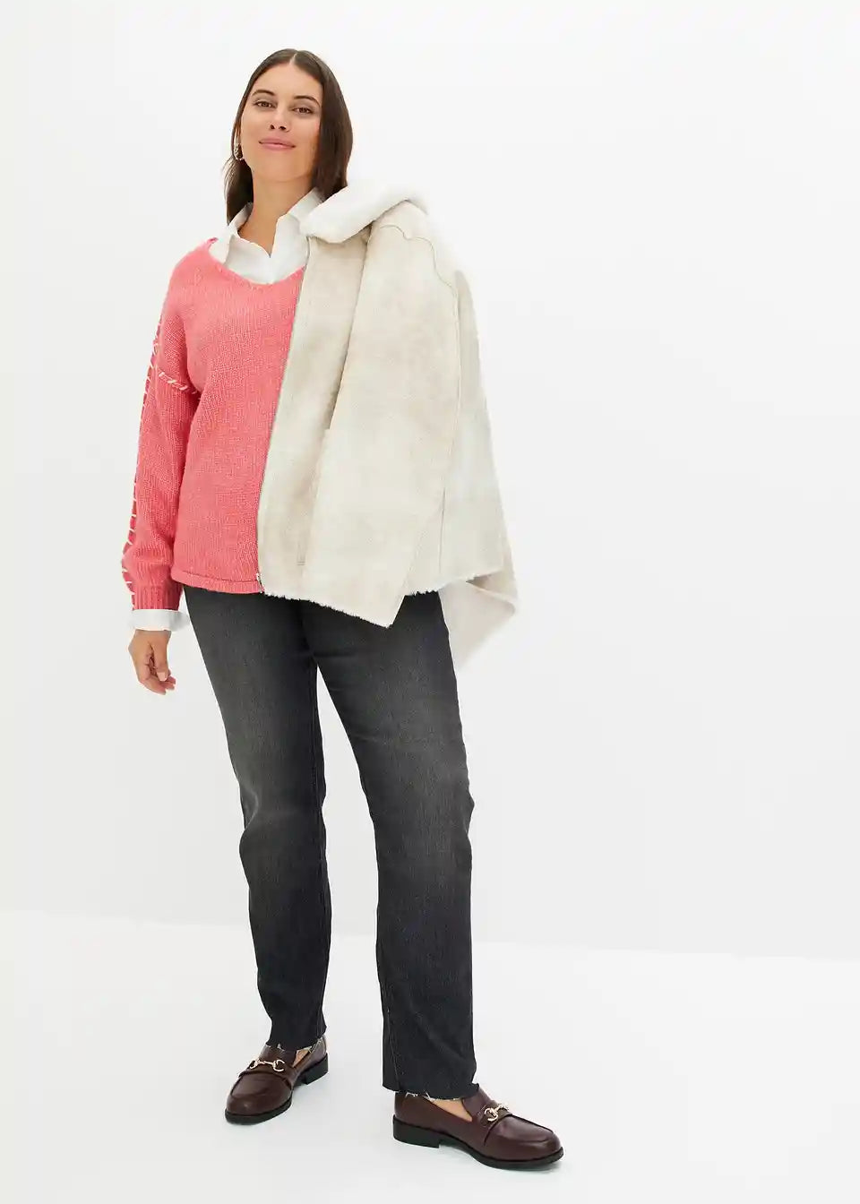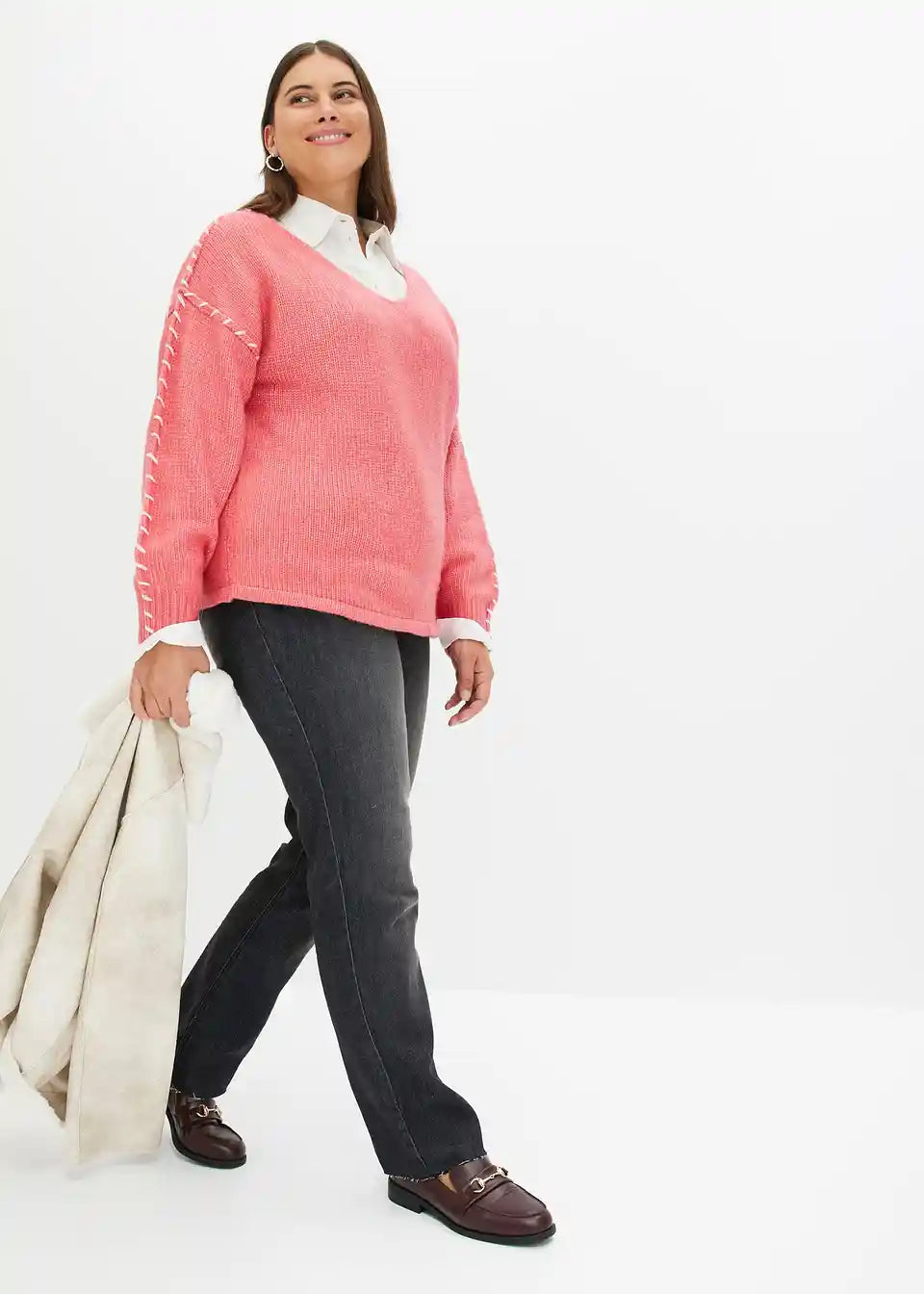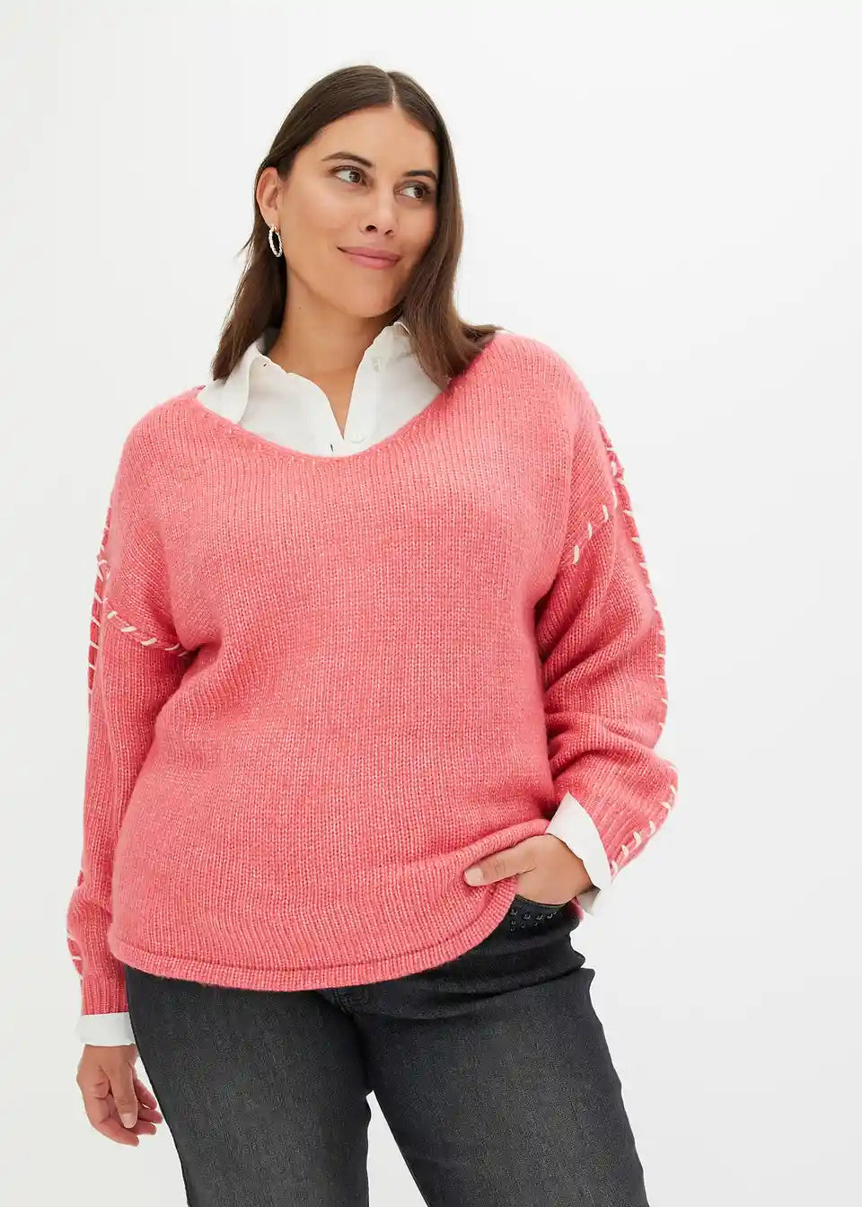 Pulover iz mehke grobe pletenine z izvezenimi kontrastnimi šivi