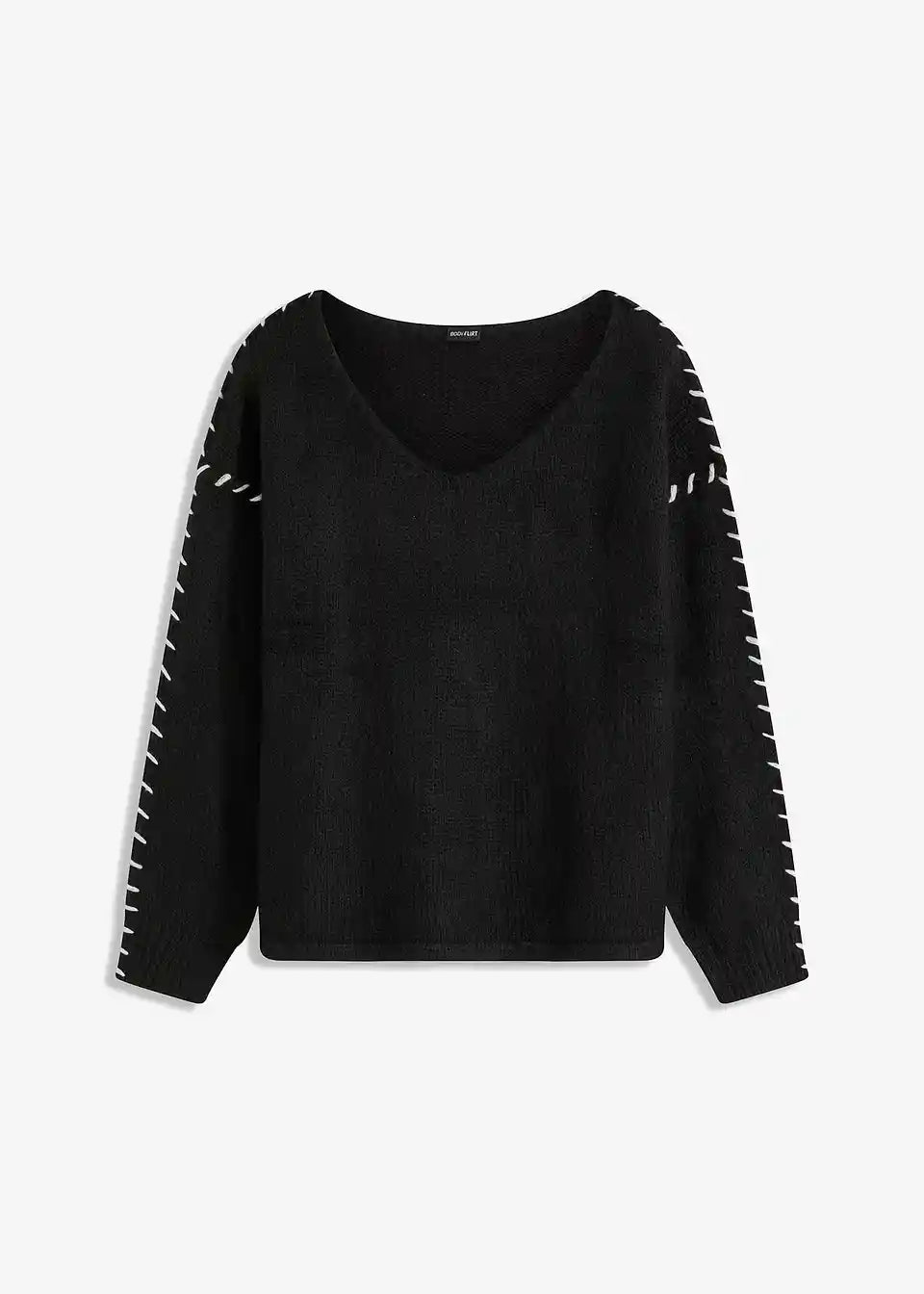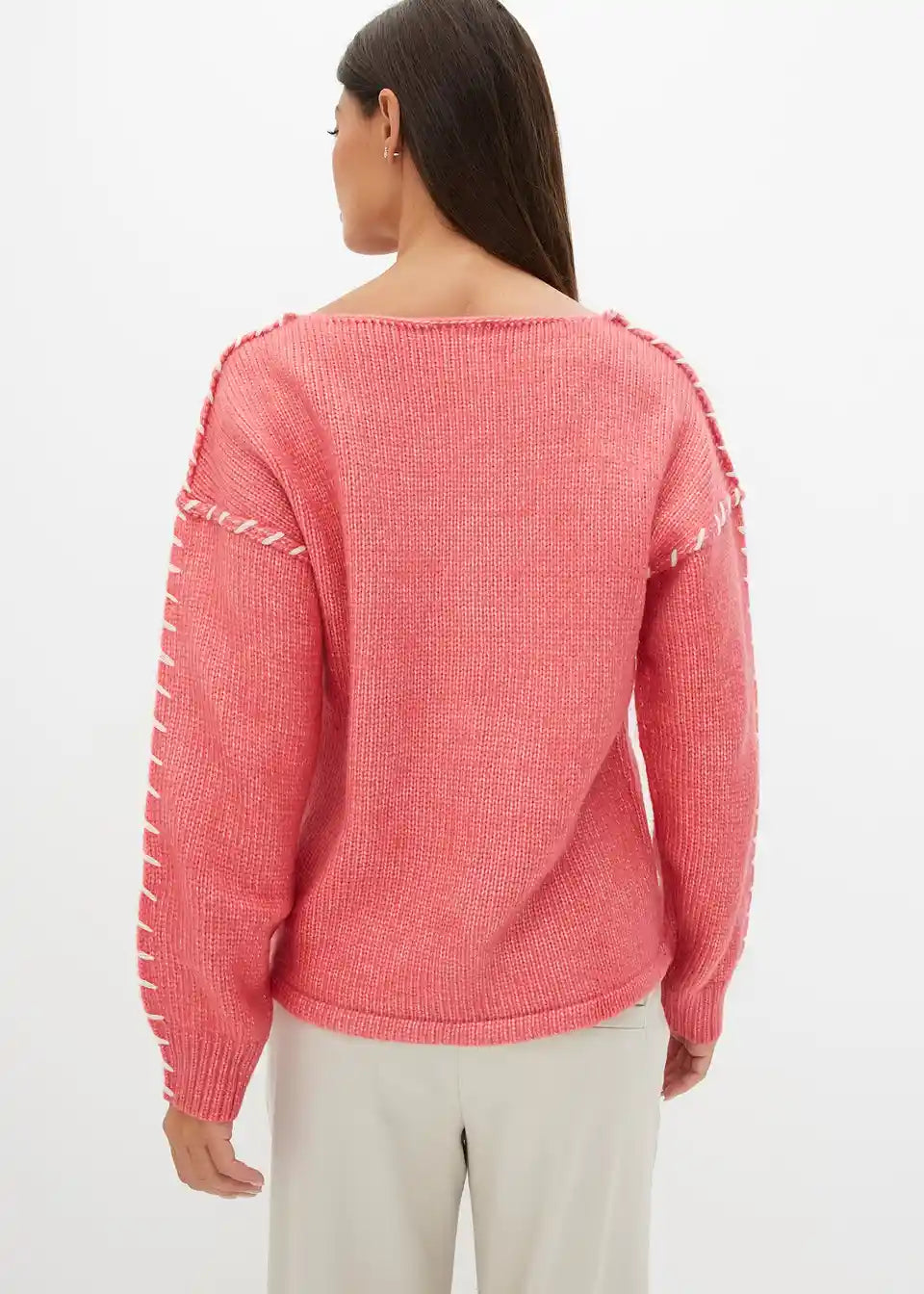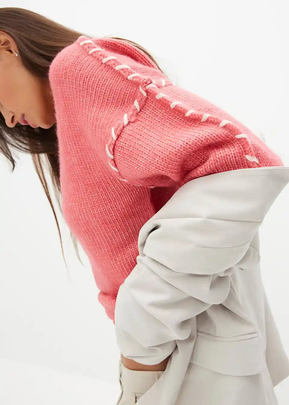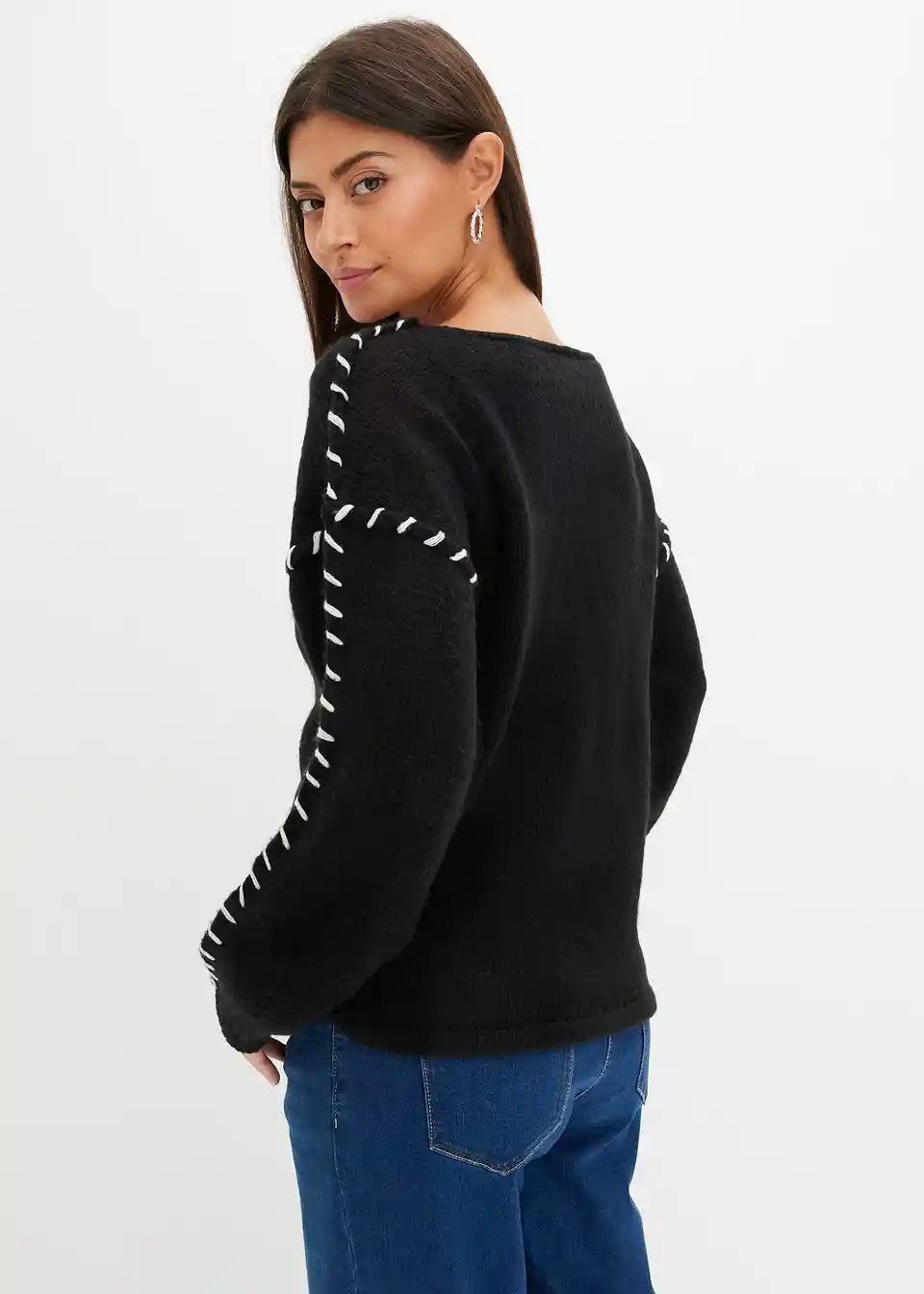 Pulover iz mehke grobe pletenine z izvezenimi kontrastnimi šivi