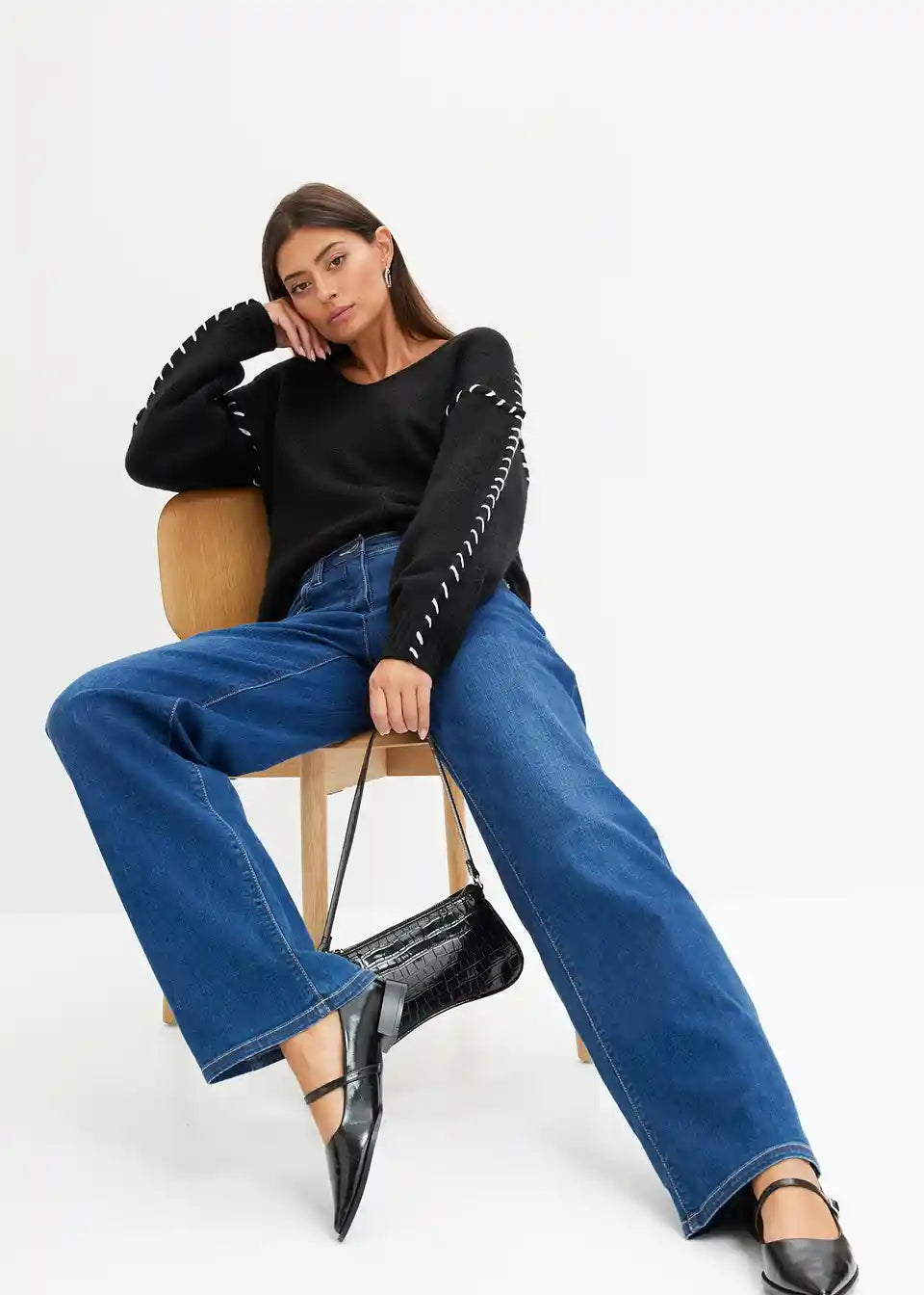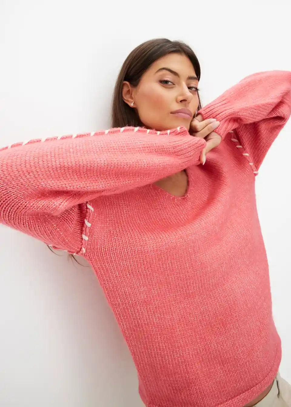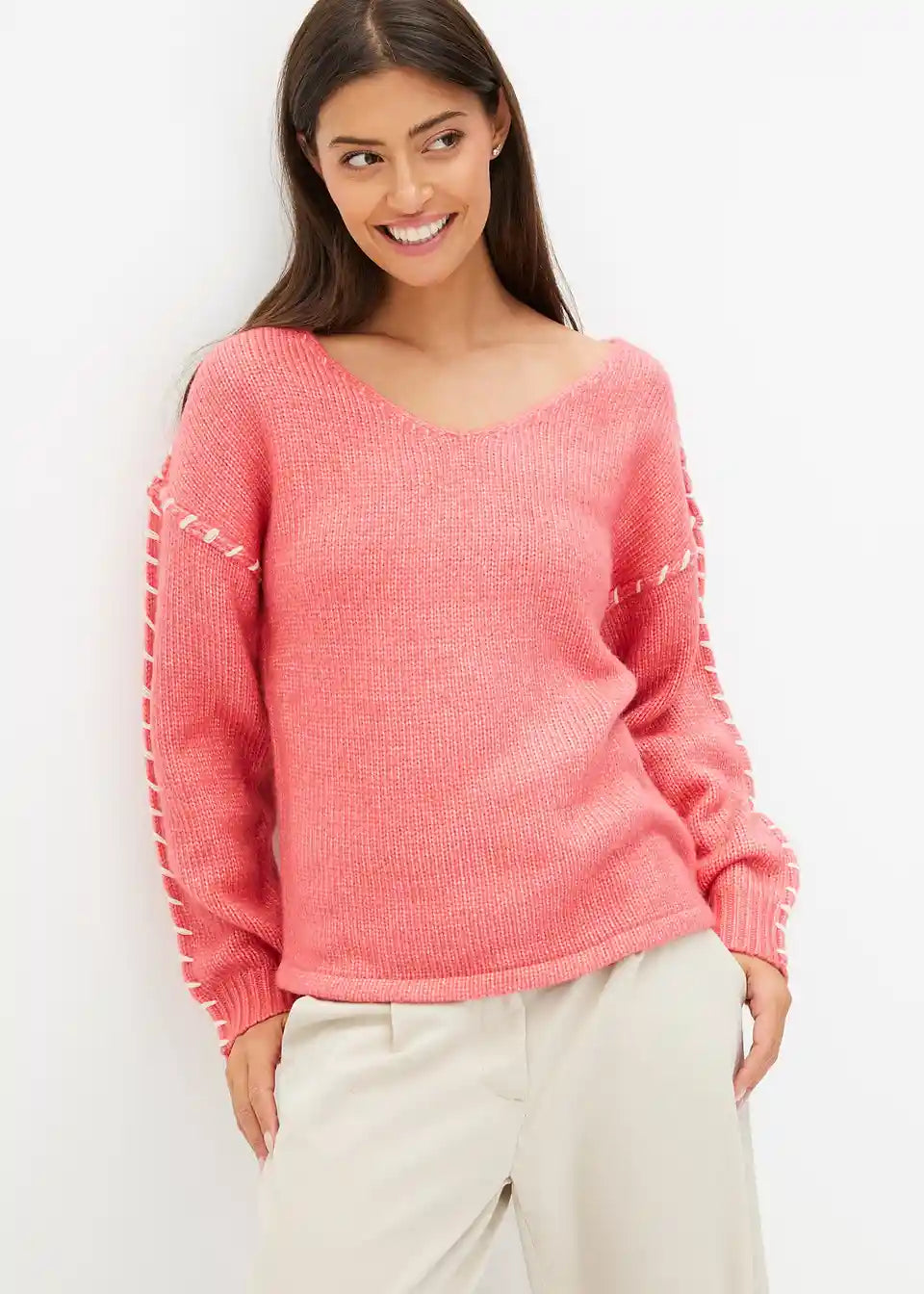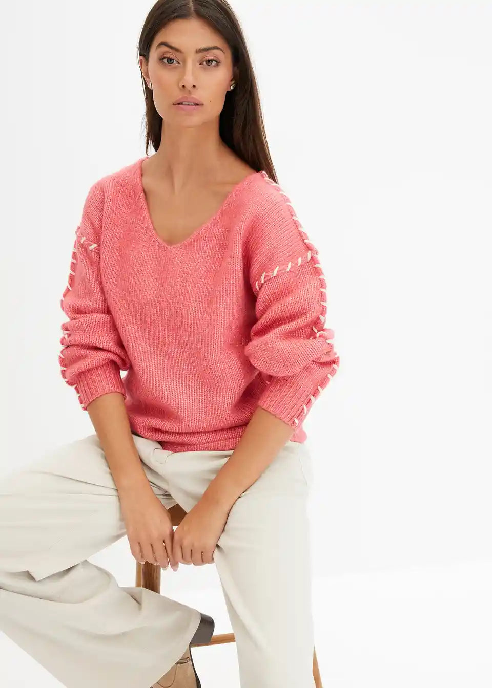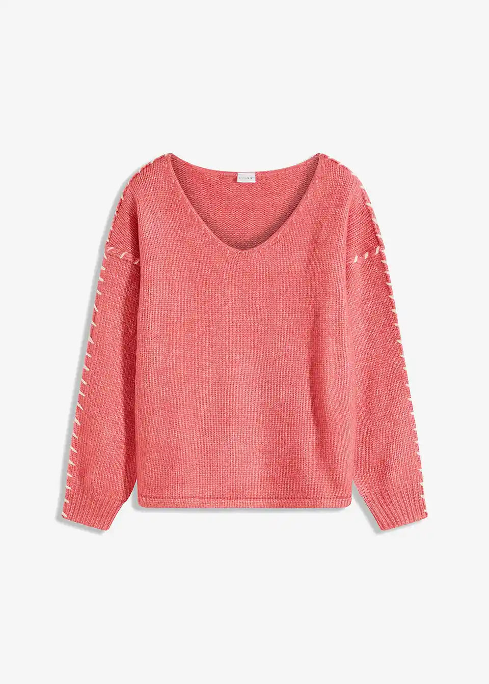 Pulover iz mehke grobe pletenine z izvezenimi kontrastnimi šivi