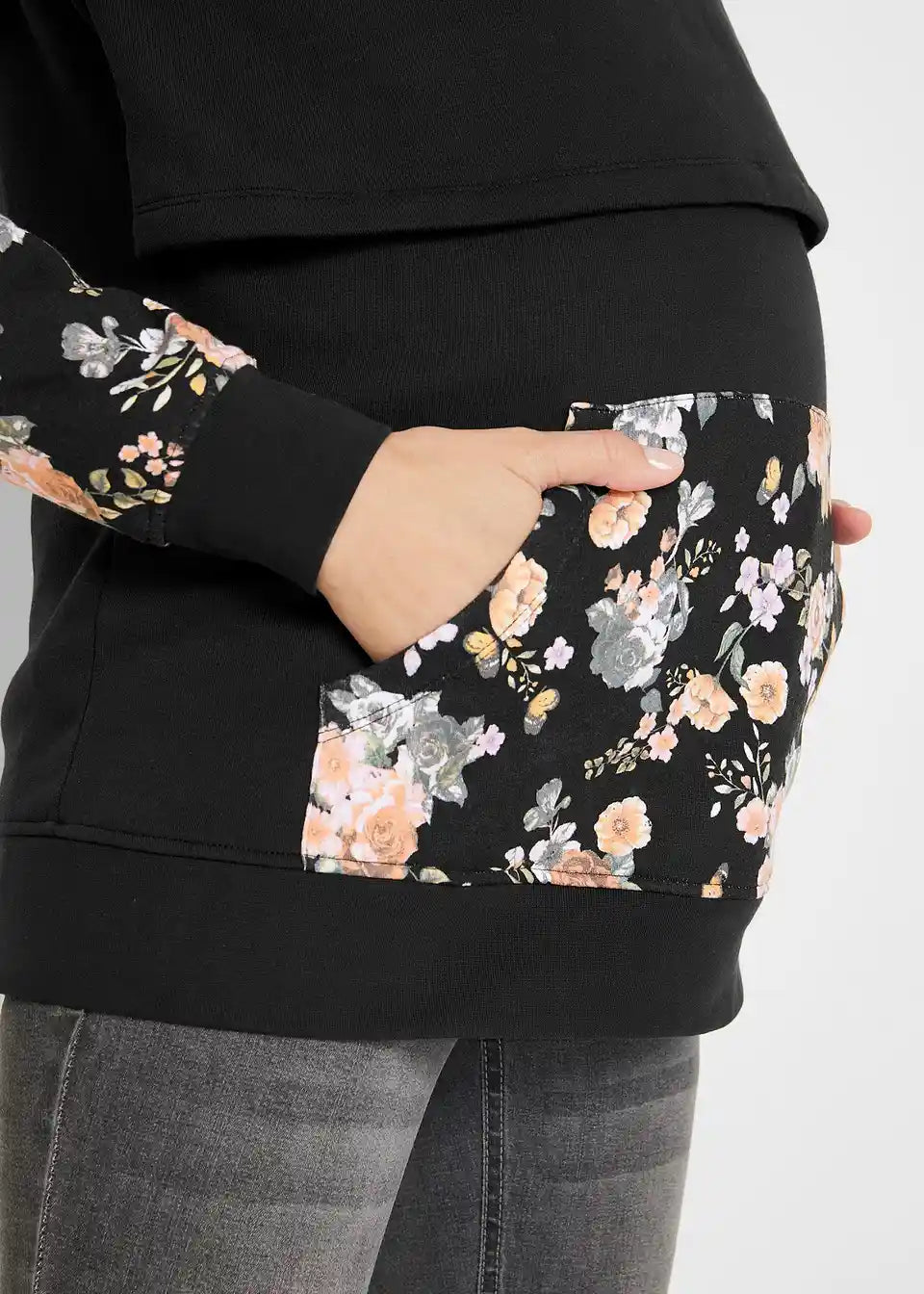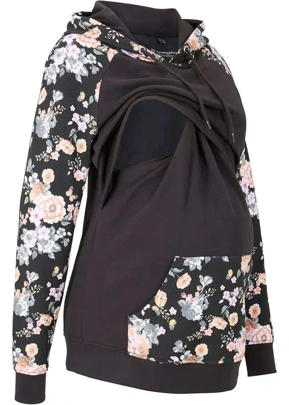 Majica s kapuco za dojenje v mehki, notranje prijetno krtačeni sweatshirt kvaliteti s kenguru žepom in kapuco z vrvicami. Dolgi rokavi in rob so opremljeni z mehkimi rebrastimi patentami. Dizajn z dvojnimi plastmi pomaga preprečiti izgubo toplote in omogoča udobno dojenje za mater in otroka.