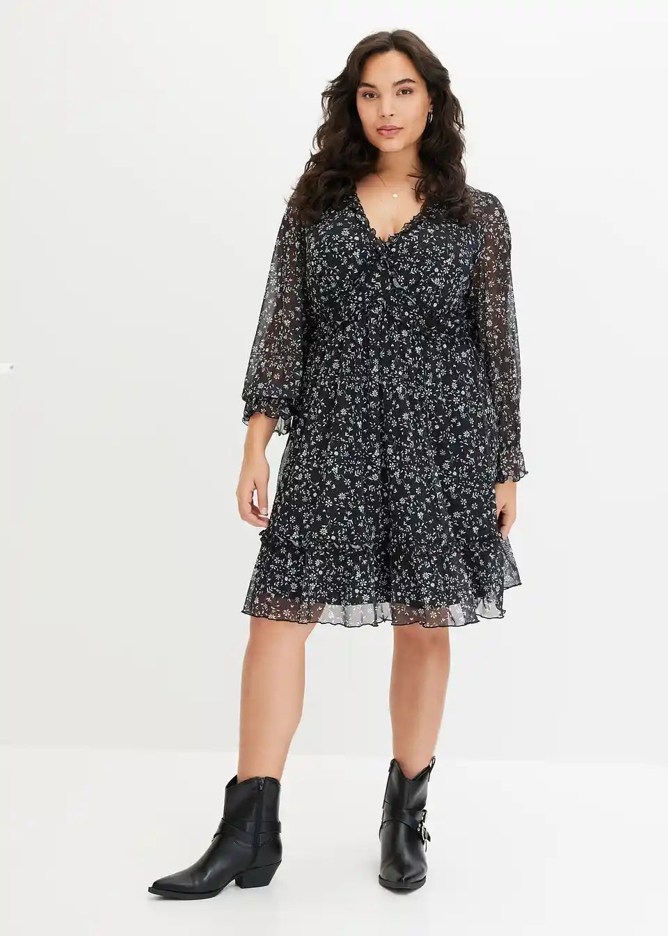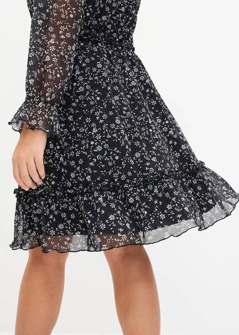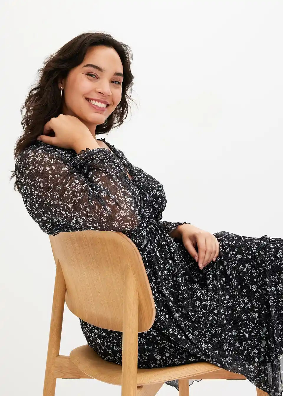 Midi obleka iz Mesh materiala z rožastim potiskom