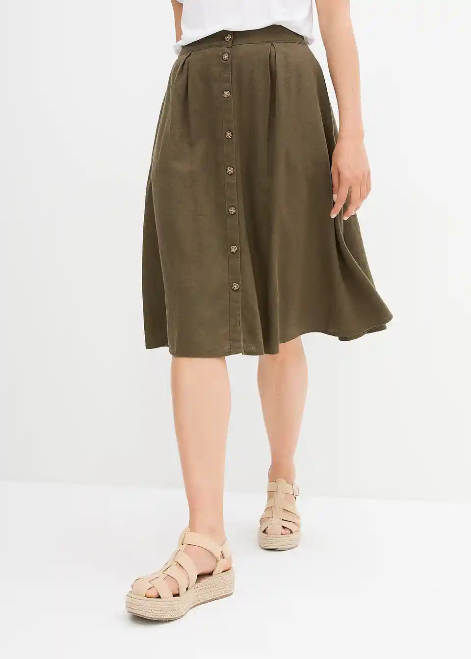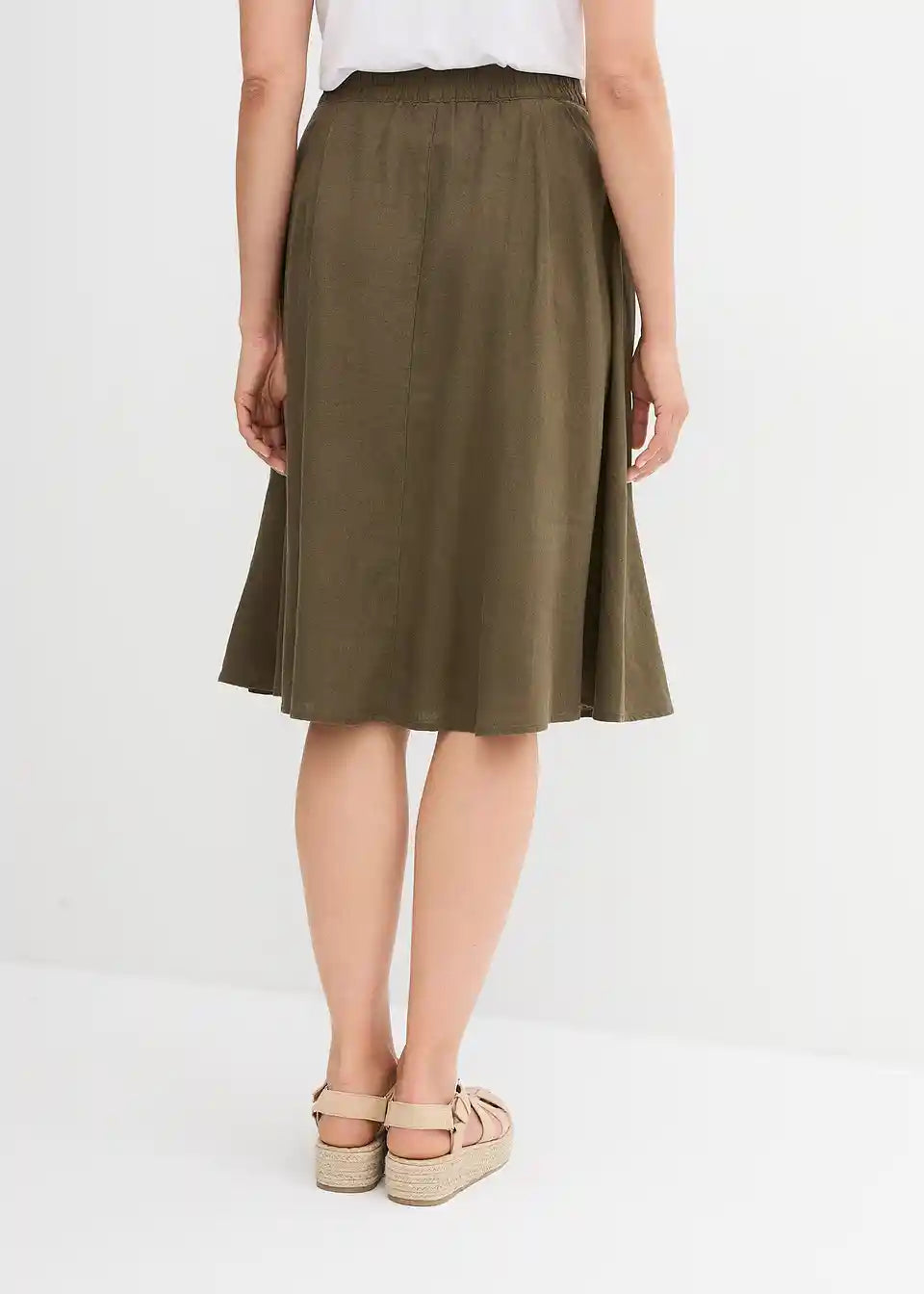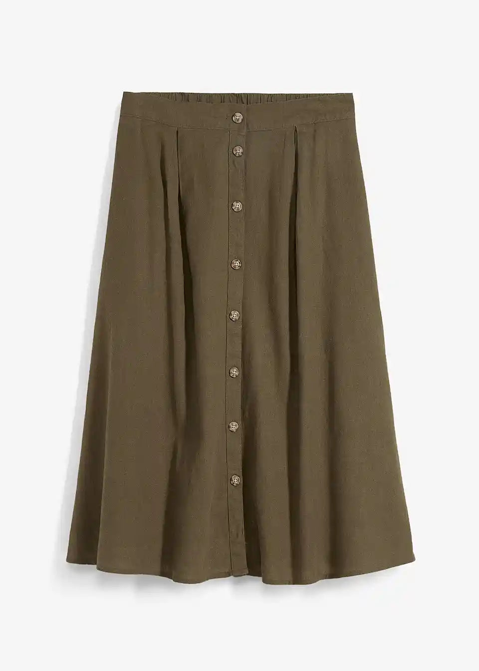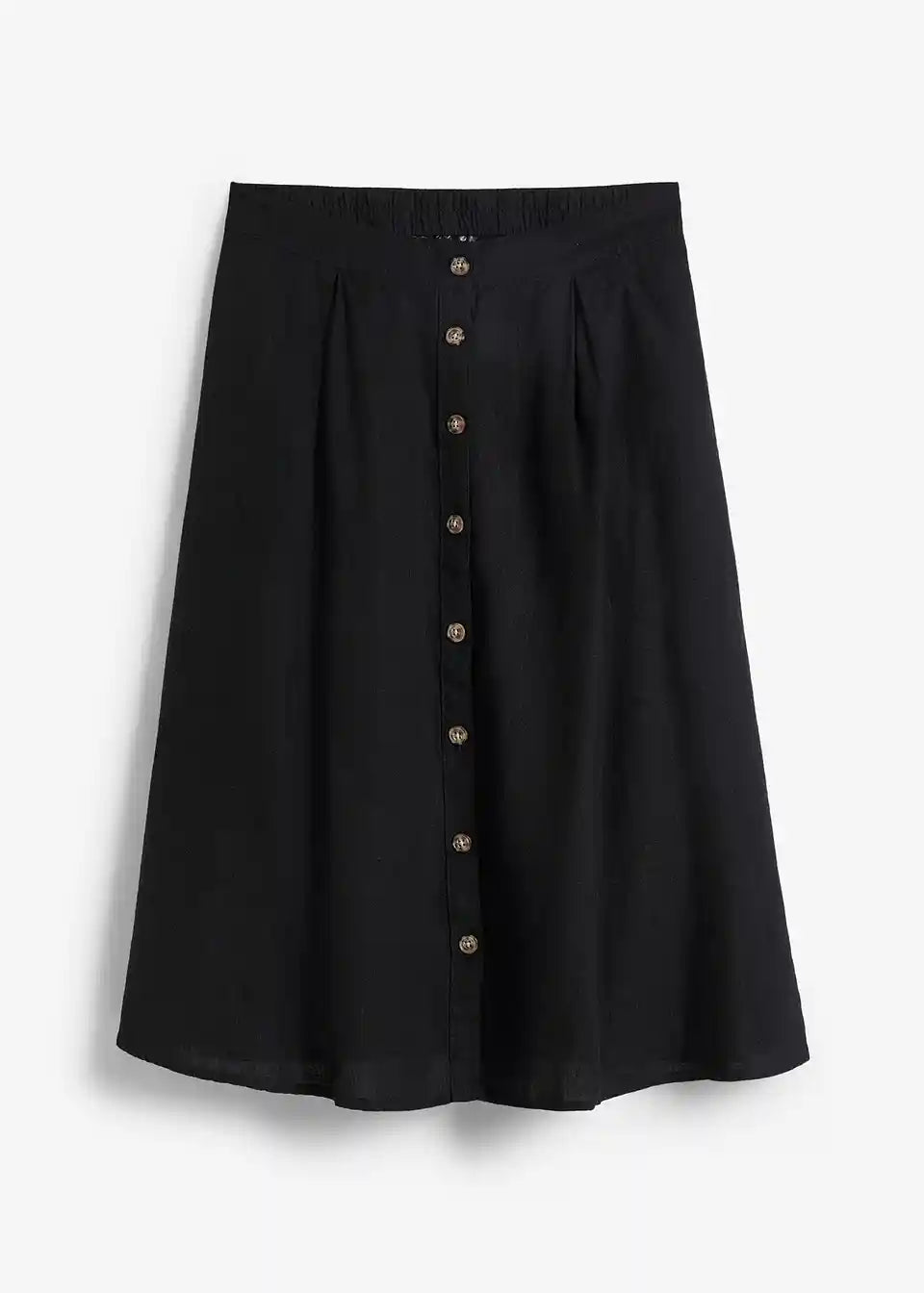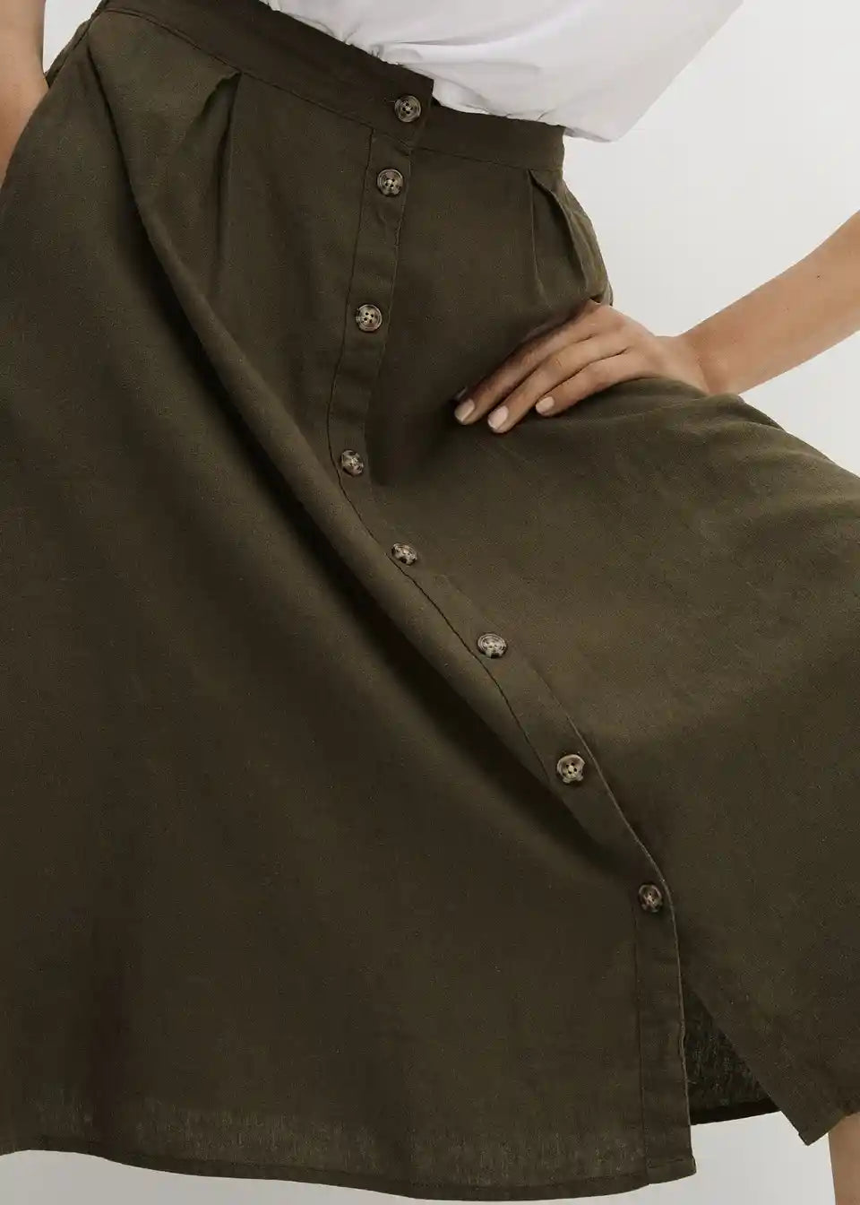 Ohlapno padajoče krilo z gumbi in zadnjim elastičnim pasom. Gumbi lahko zaradi roževinastega videza odstopajo v barvi.