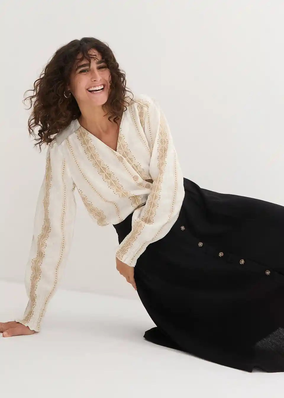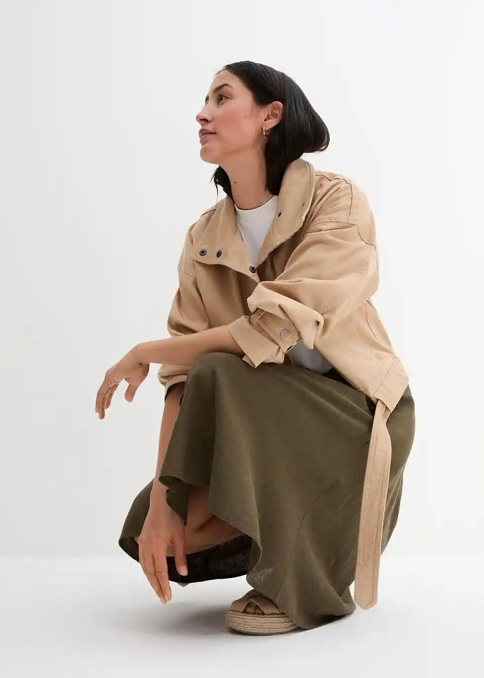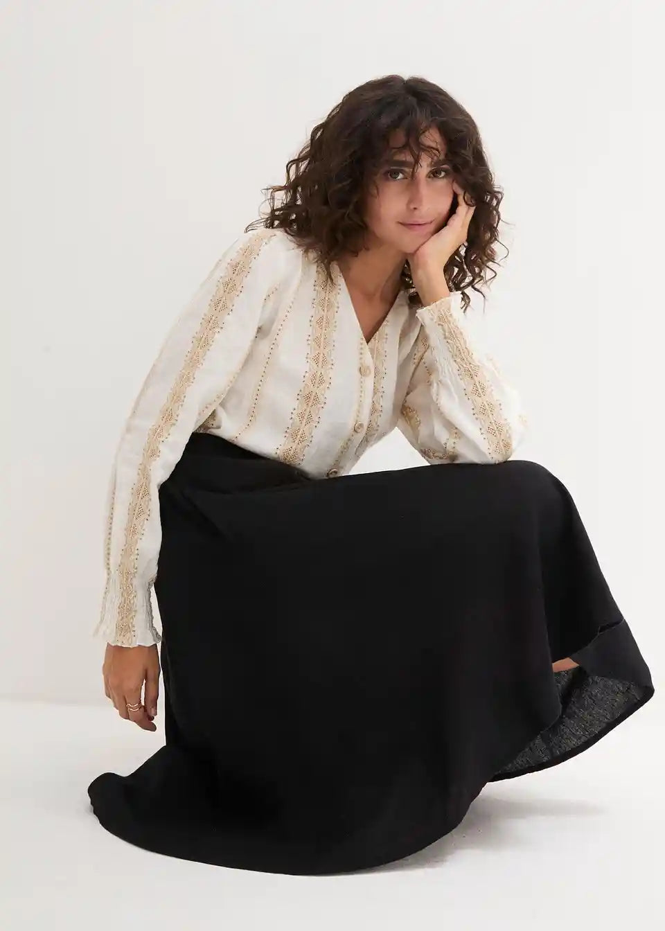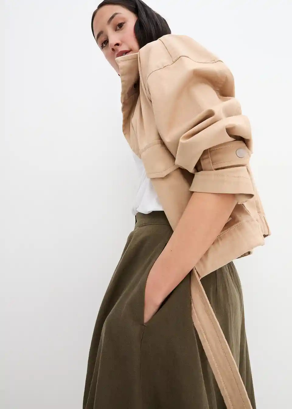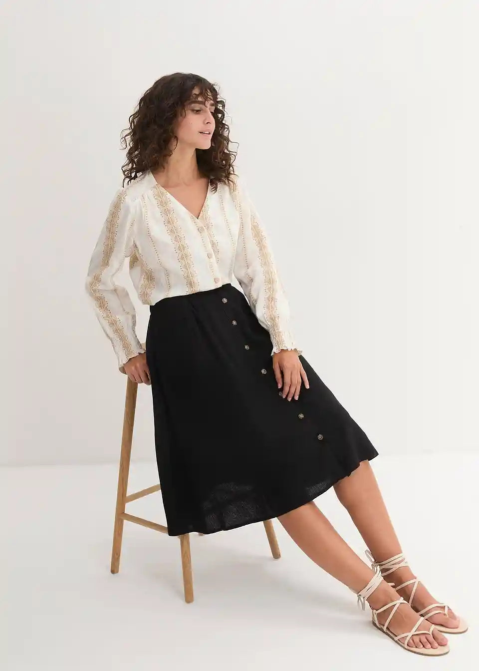 Ohlapno padajoče krilo z gumbi in zadnjim elastičnim pasom. Gumbi lahko zaradi roževinastega videza odstopajo v barvi.