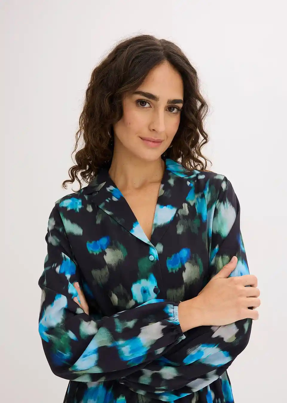 Modno potiskana midi obleka z letvijo za zapenjanje spredaj in poudarjenim pasom