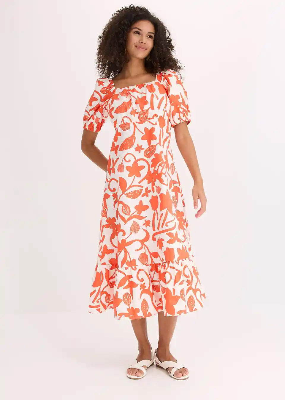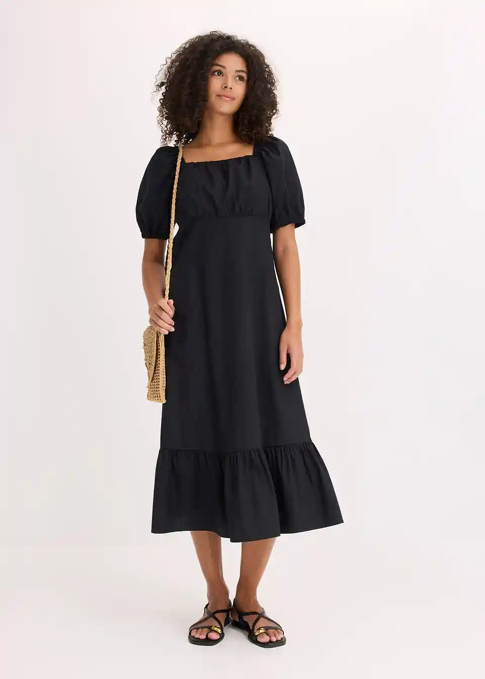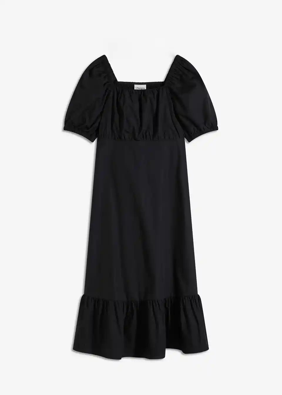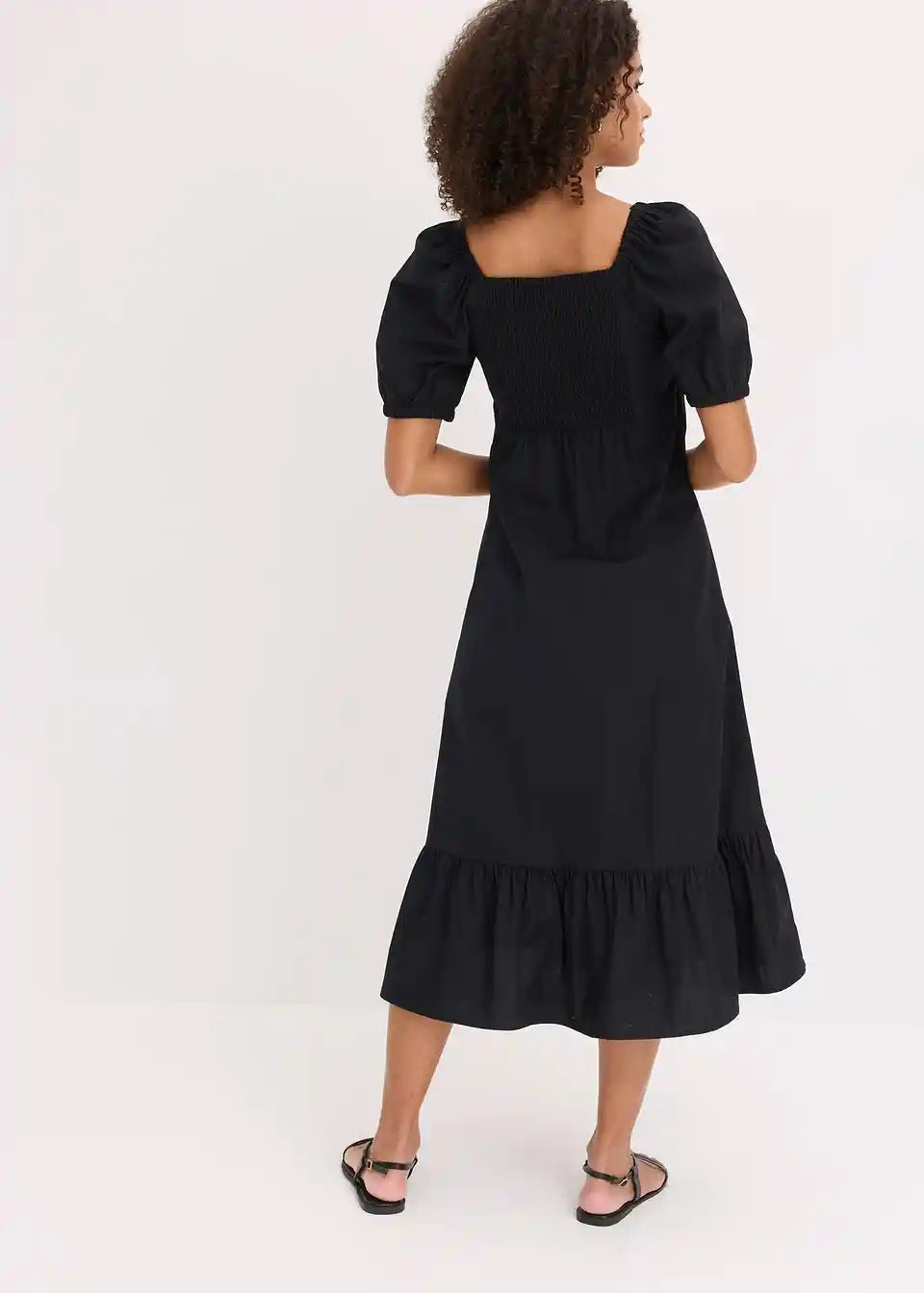 ženska midi obleka iz čiste ekološke bombažne tkanine z napihnjenimi rokavi in nabranim zgornjim delom