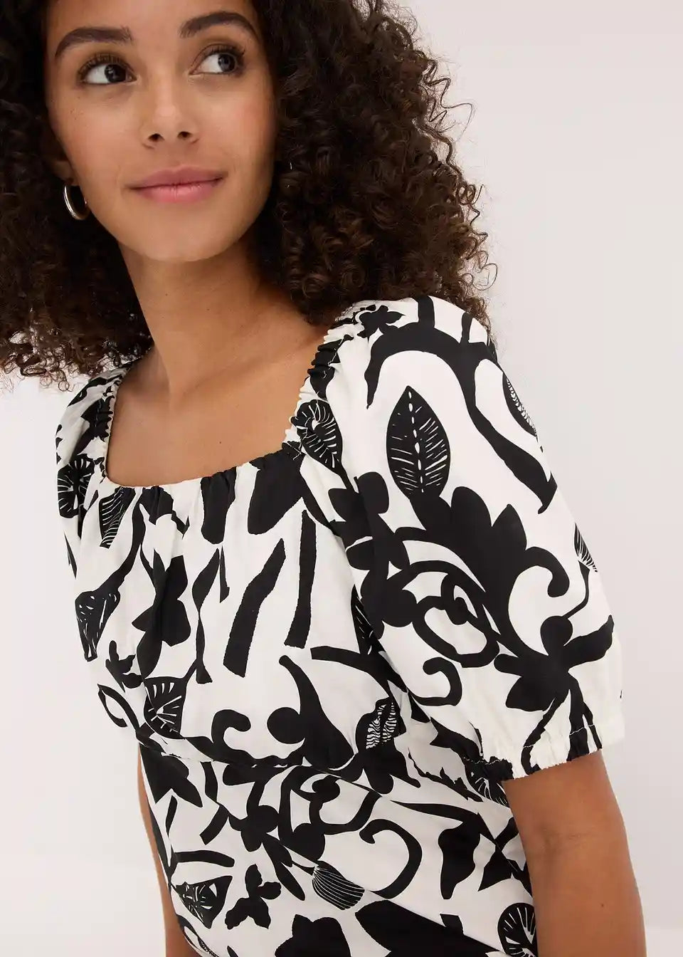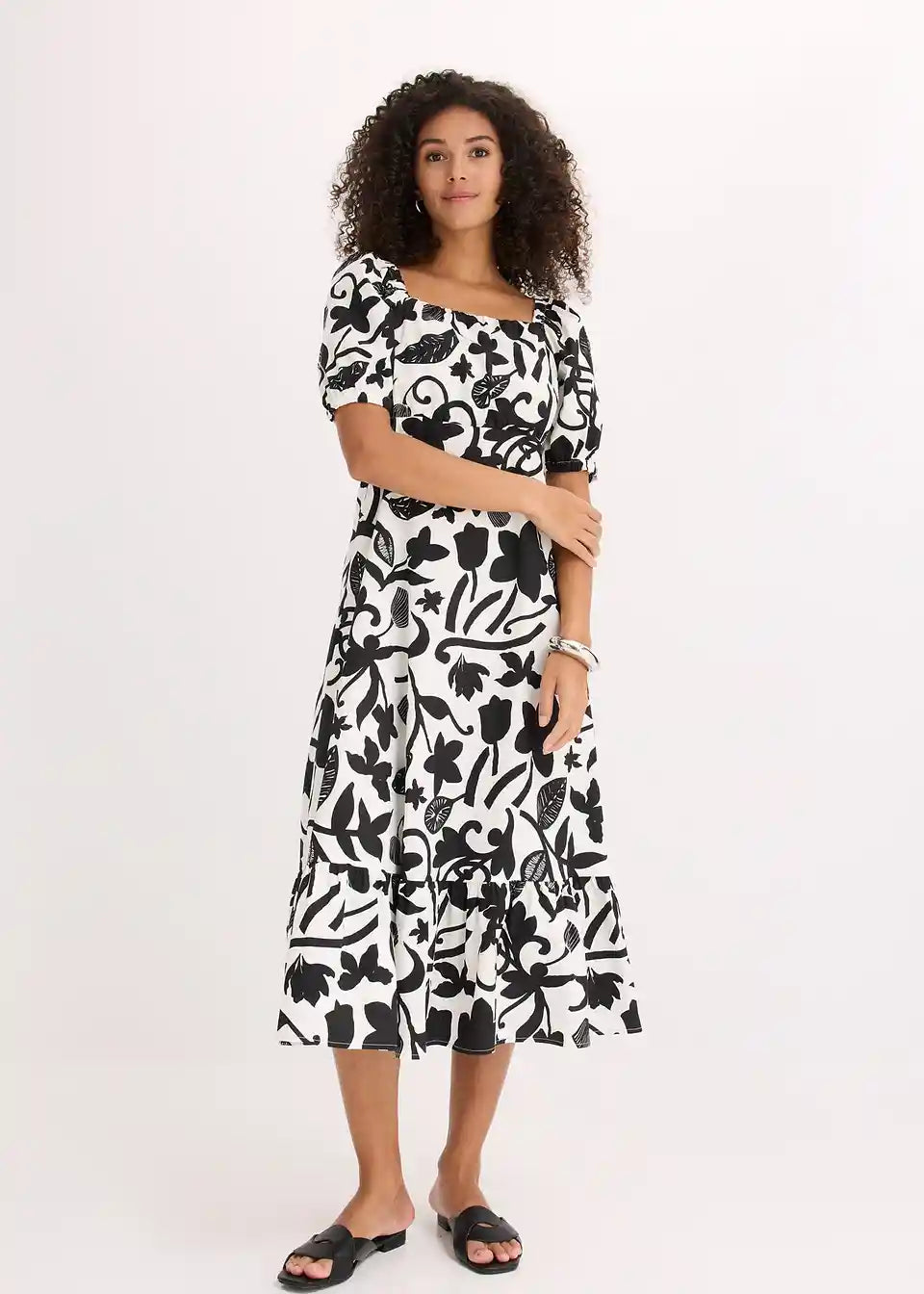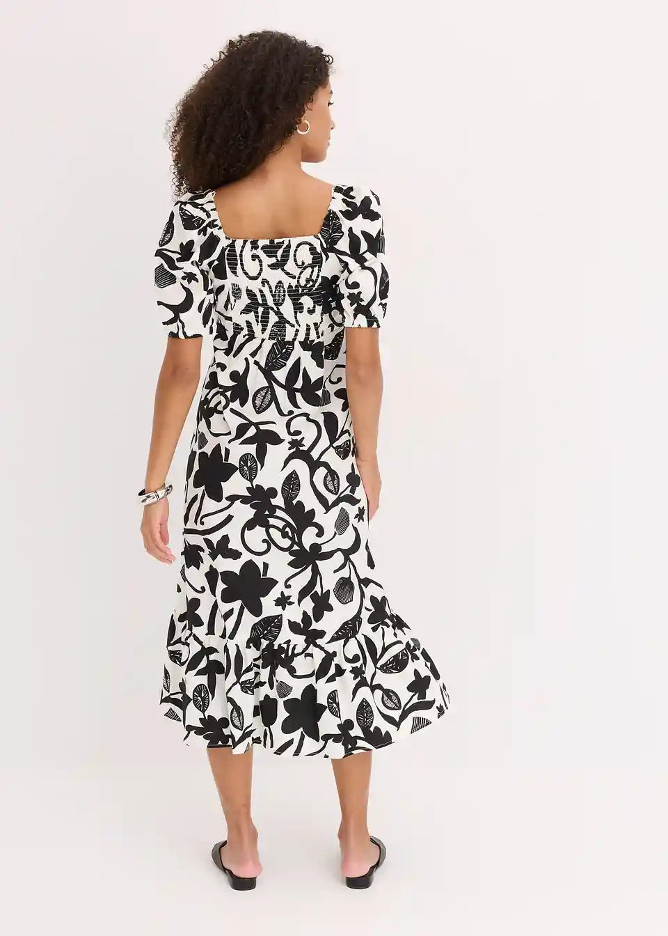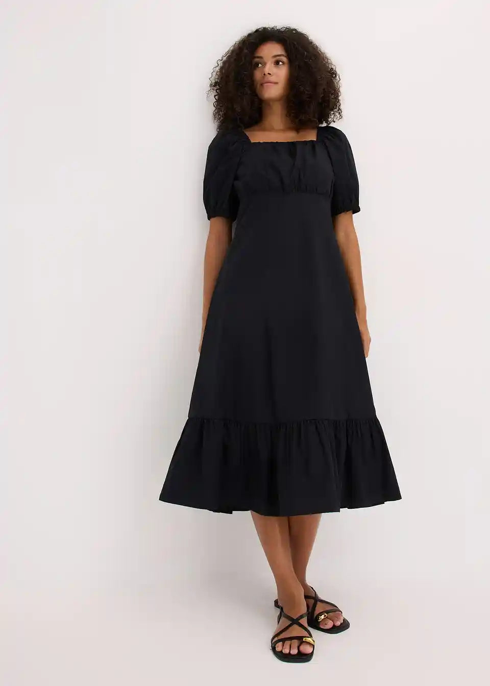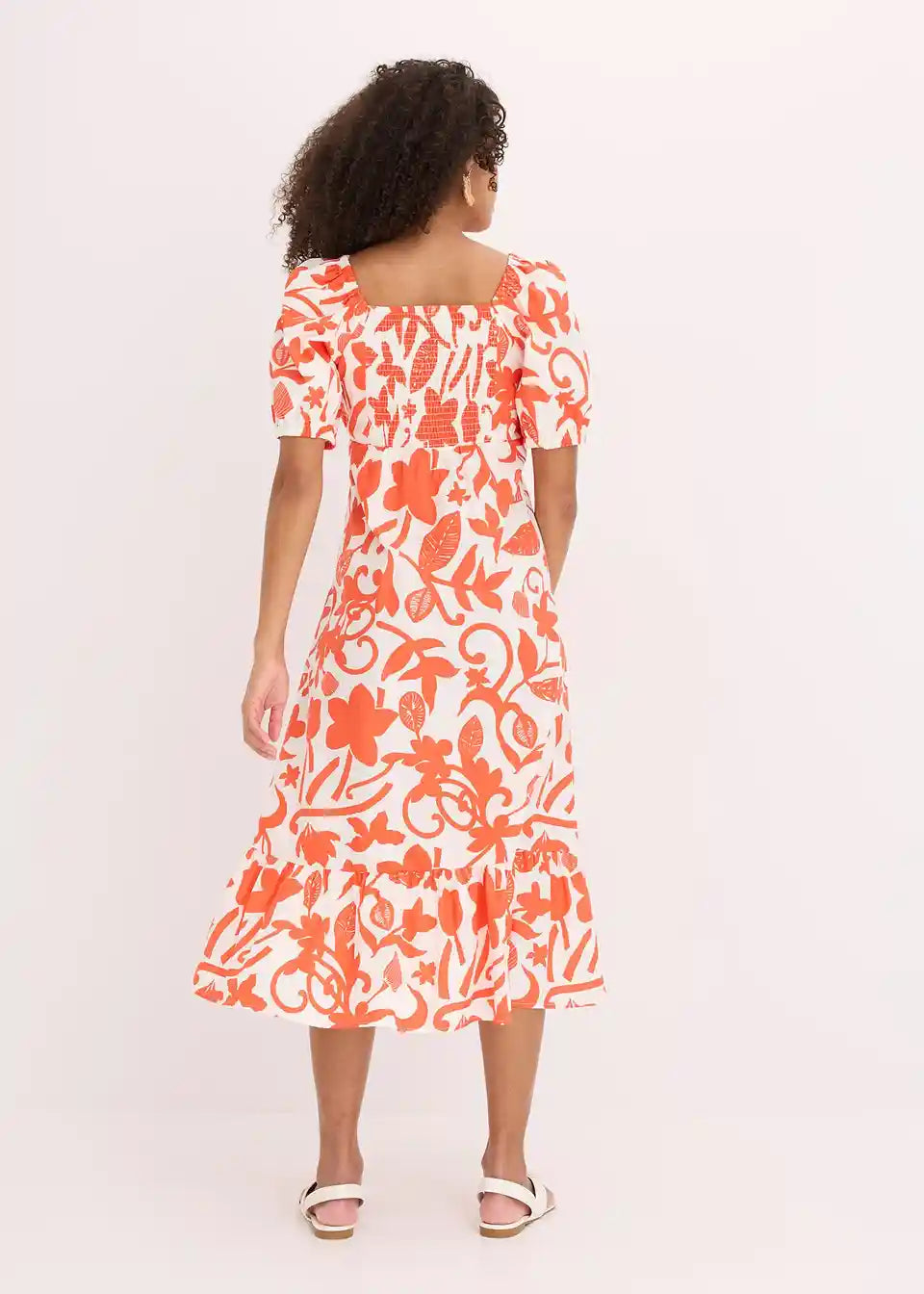 ženska midi obleka iz čiste ekološke bombažne tkanine z napihnjenimi rokavi in nabranim zgornjim delom