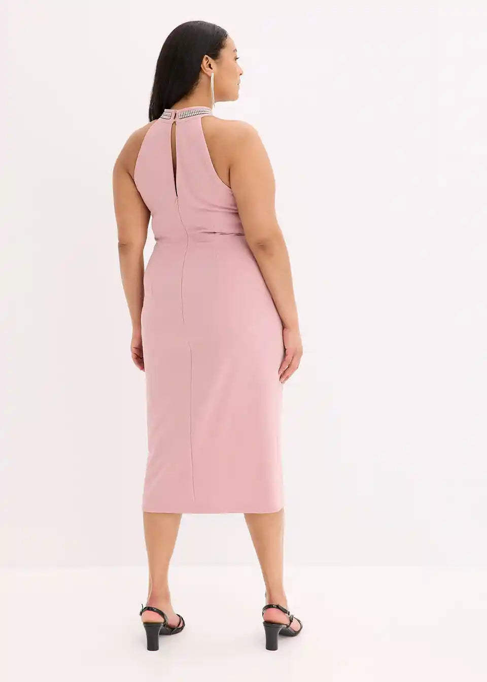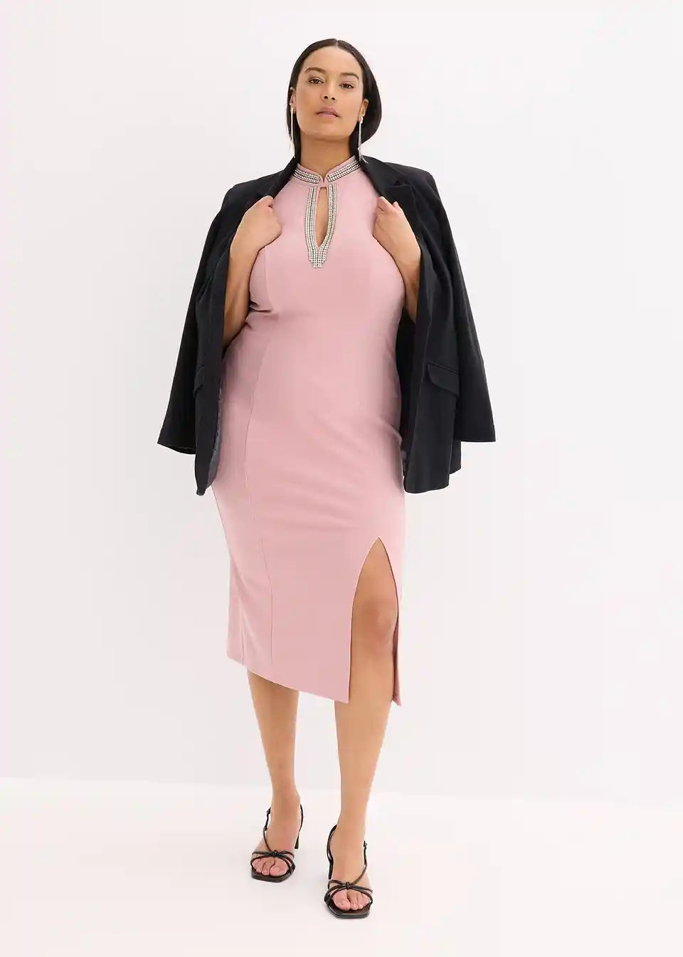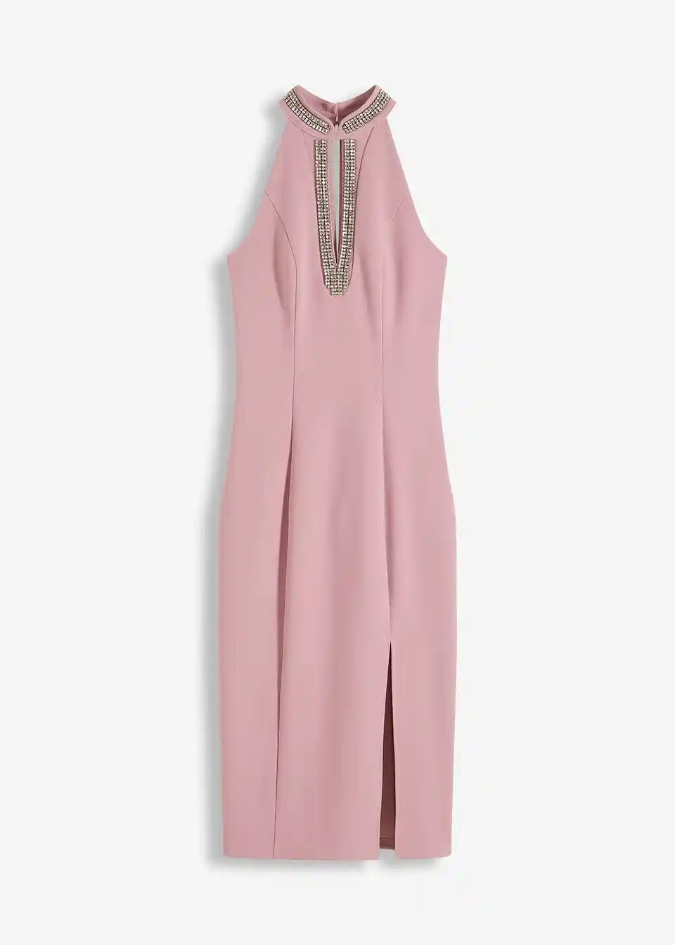 Seksi koktajl obleka iz strukturiranega krep blaga v midi dolžini z razporkom pri izrezu in okrašena s kristalčki