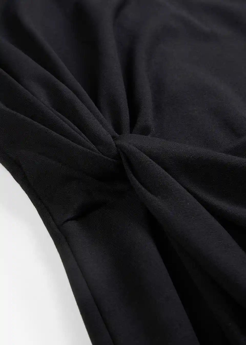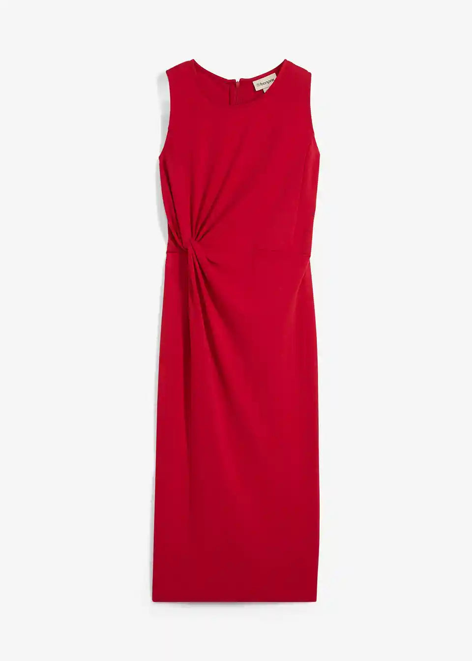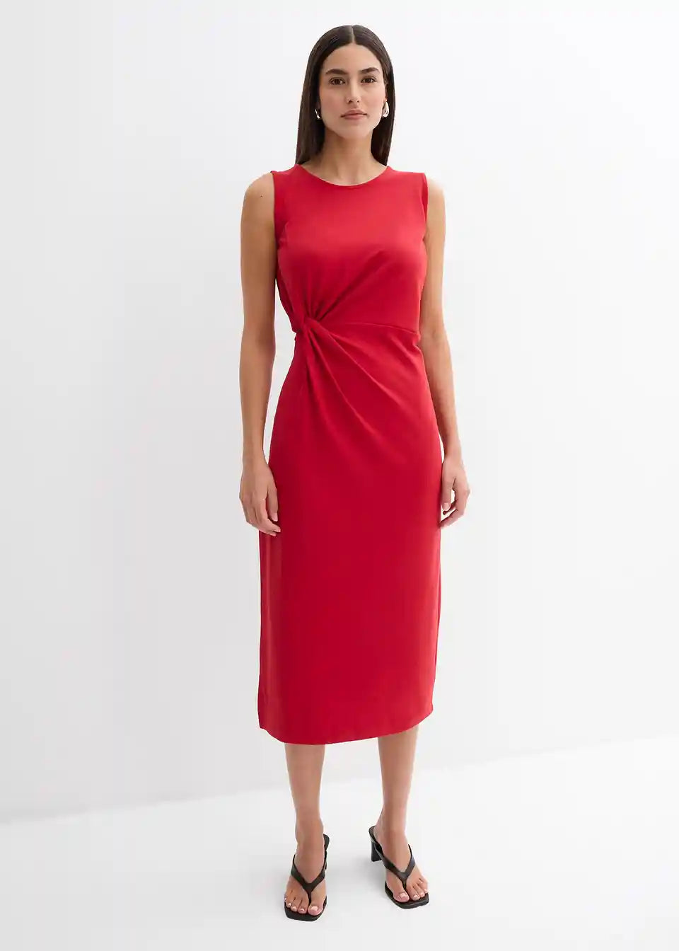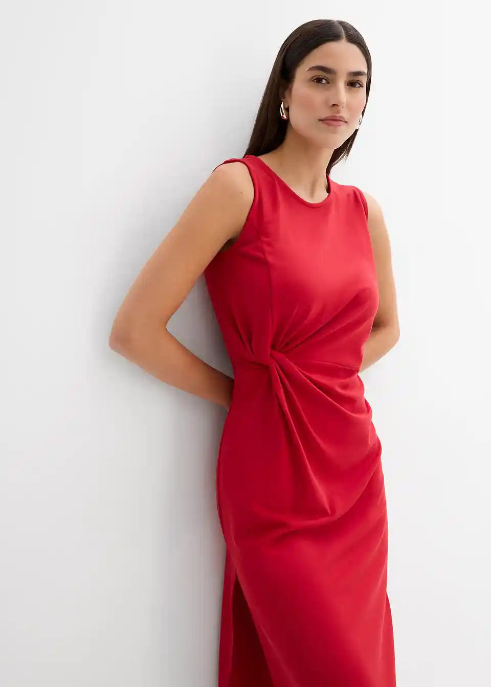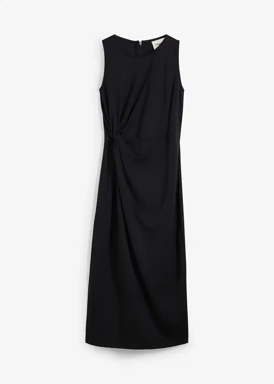 Srednje dolga obleka brez rokavov z okroglim izrezom in detajlom vozla ob strani. Rob z razporkom ob strani in skrit zadrga na hrbtni strani.