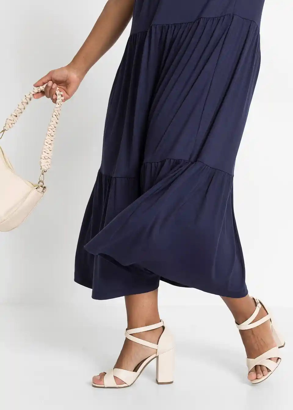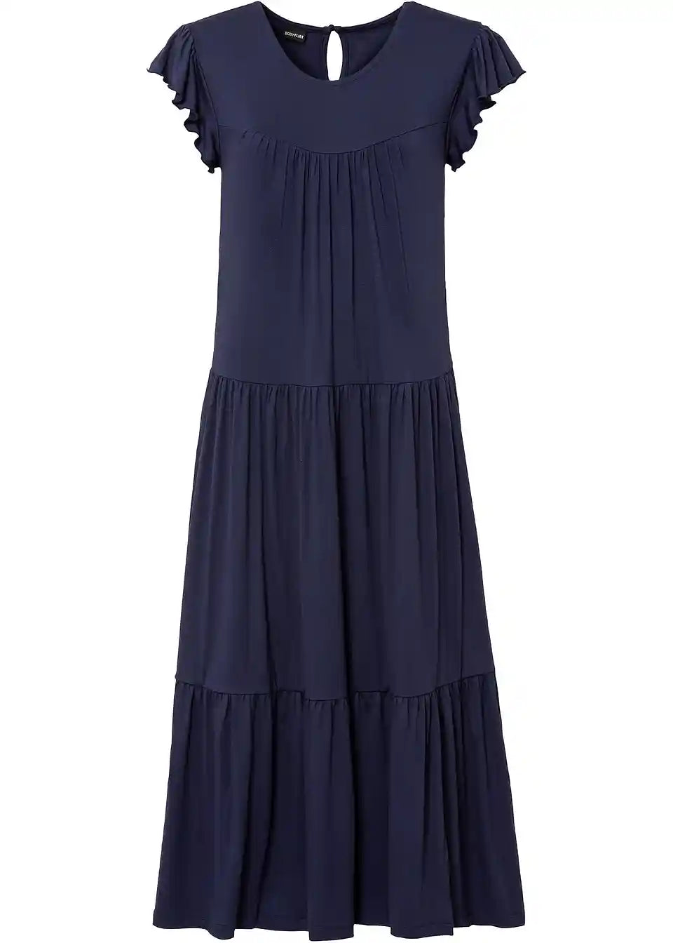 Moderna srednje dolga obleka z zapenjanjem na gumb zadaj pri vratu