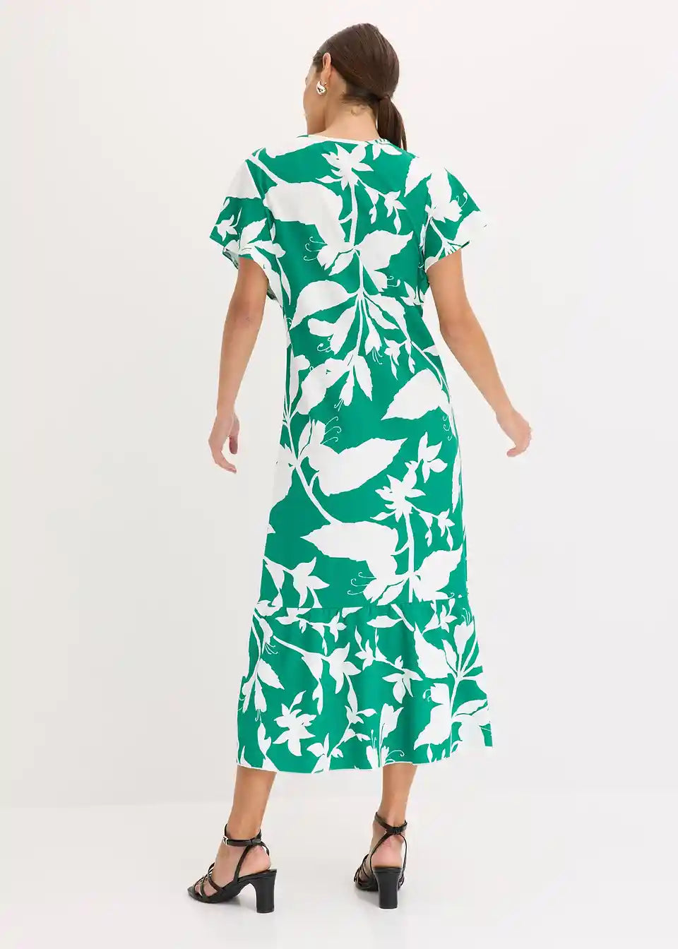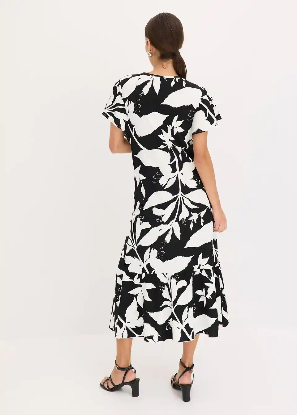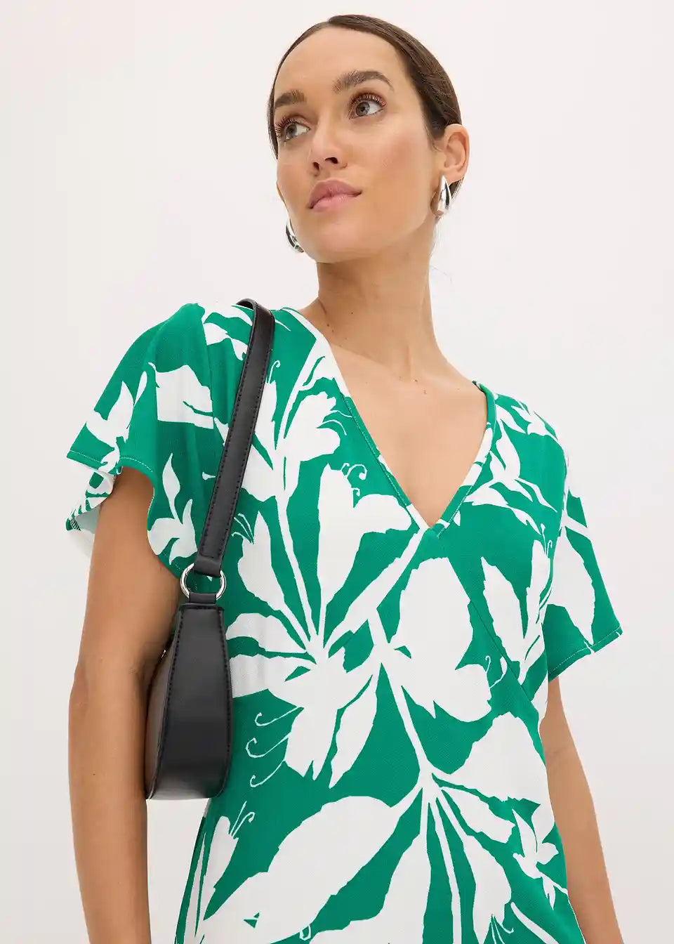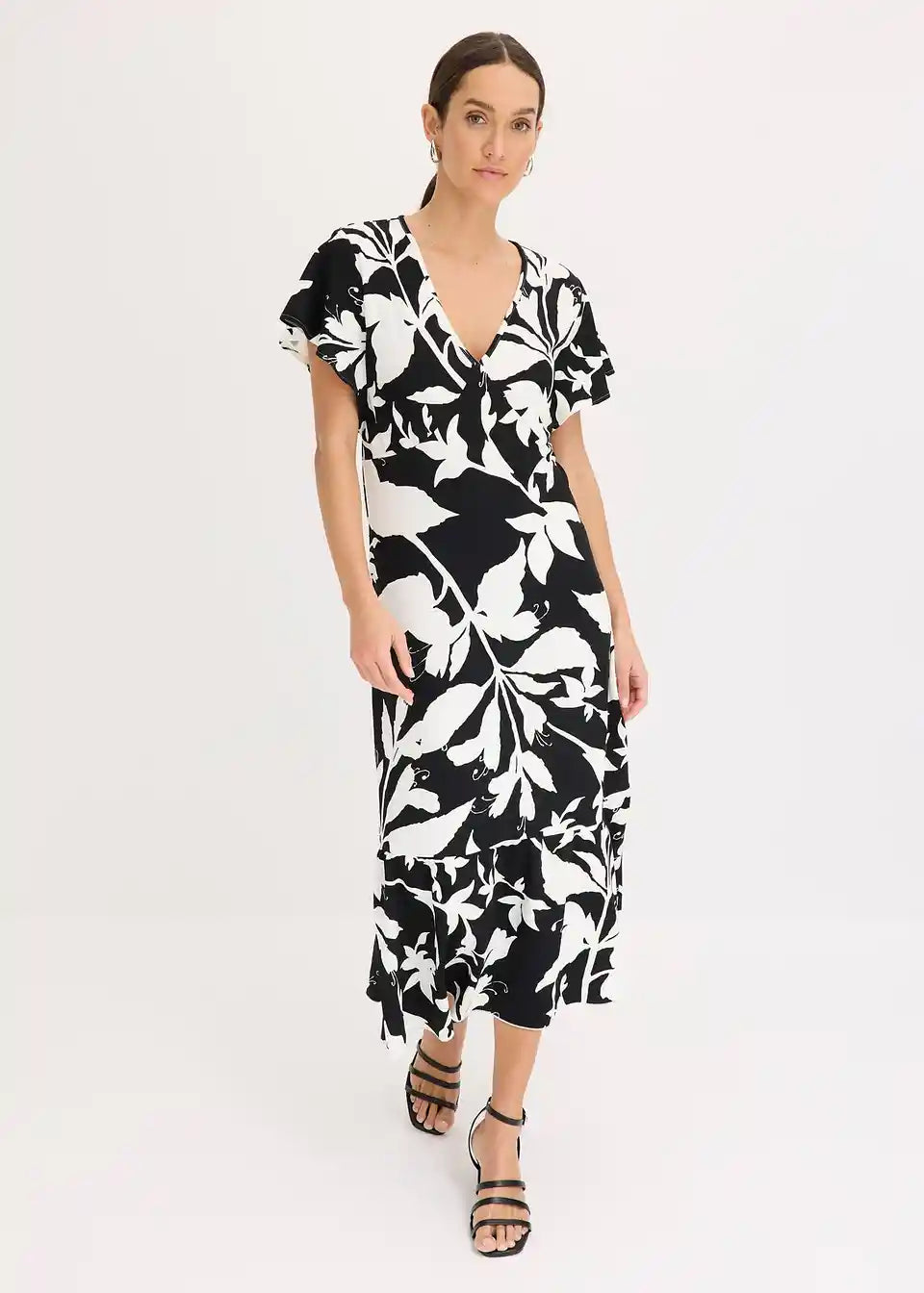 Obleka z volančki s cvetličnim potiskom in V-izrezom