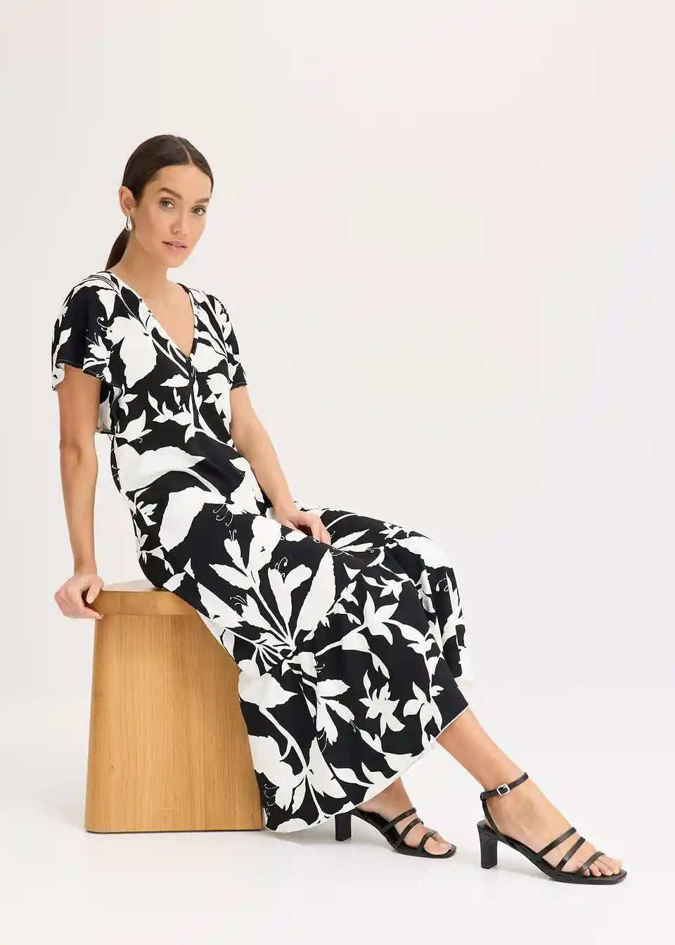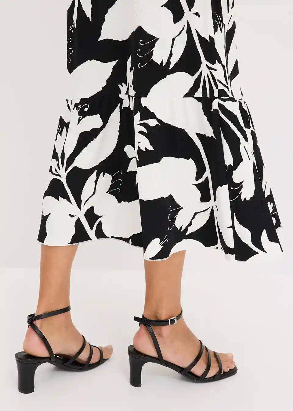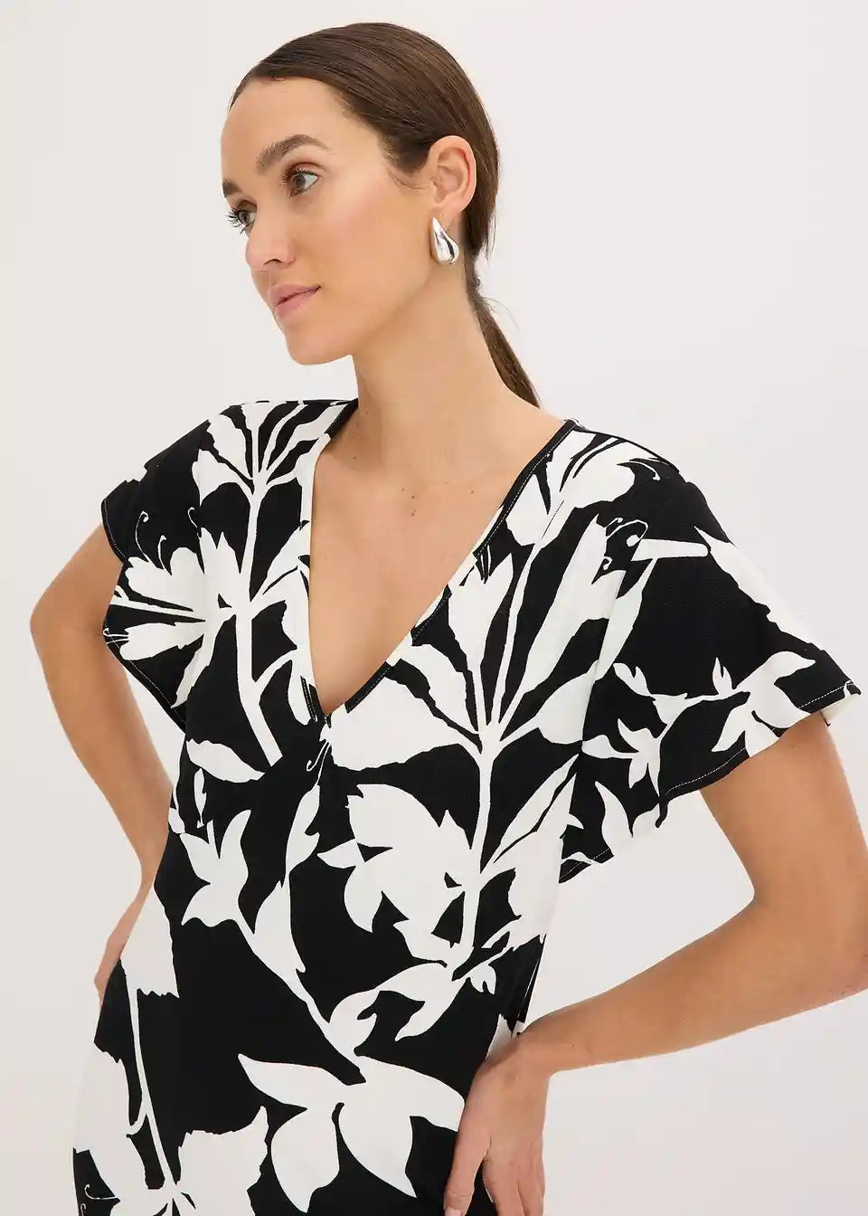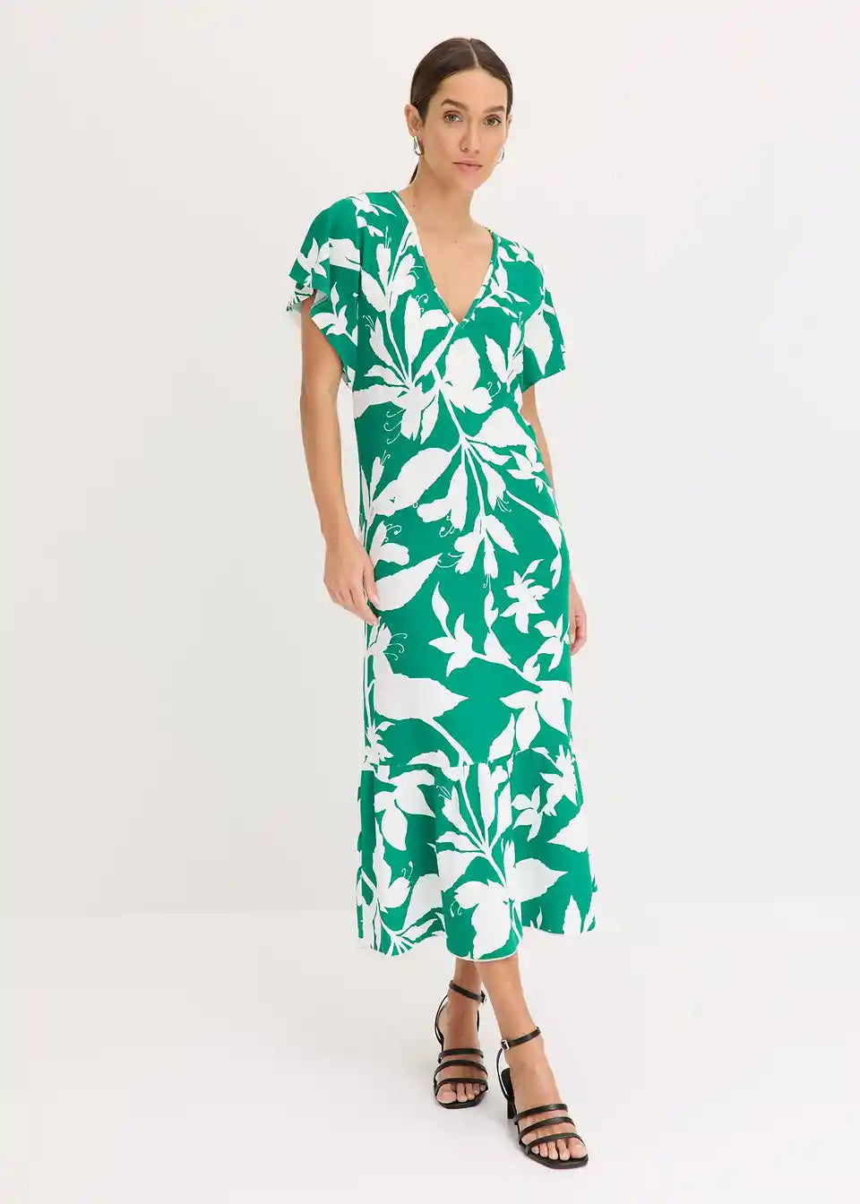 Obleka z volančki s cvetličnim potiskom in V-izrezom