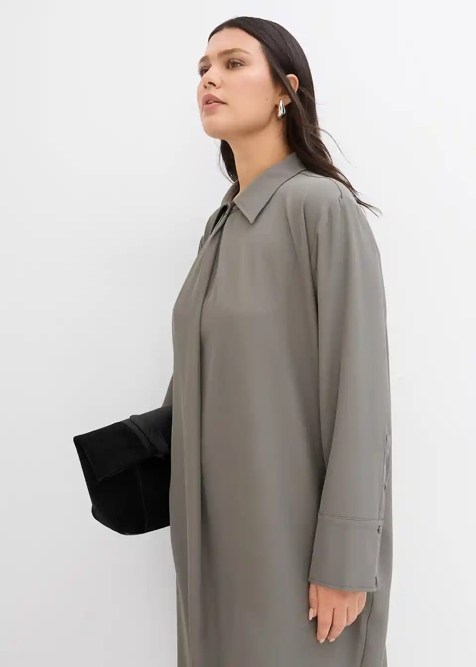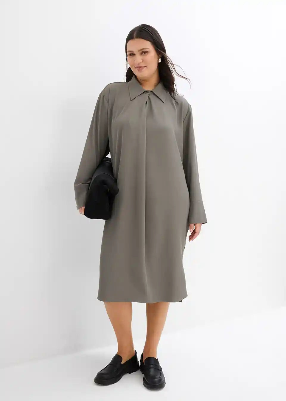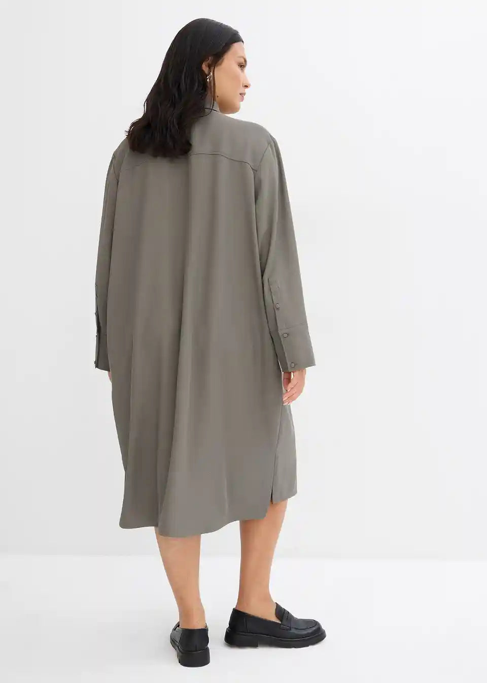 Do meč segajoča srajčna obleka s širokim špičastim ovratnikom in preklopnim delom na izrezu, ki ga je mogoče zapreti z vidnim gumbom