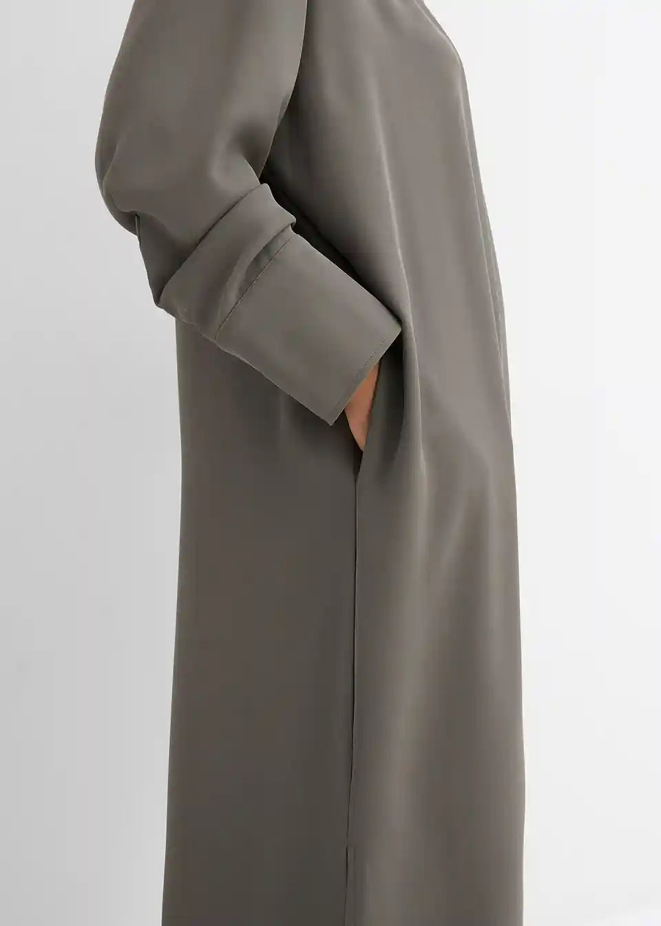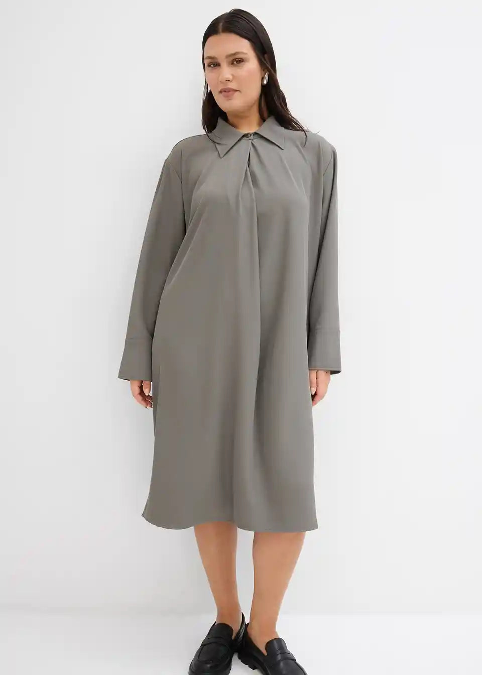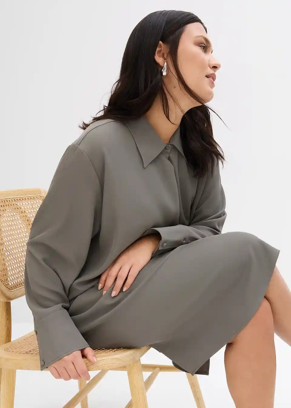 Do meč segajoča srajčna obleka s širokim špičastim ovratnikom in preklopnim delom na izrezu, ki ga je mogoče zapreti z vidnim gumbom
