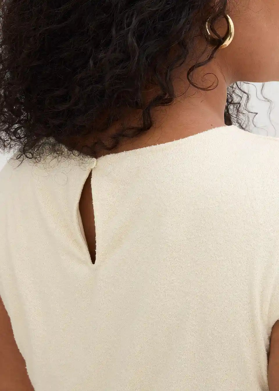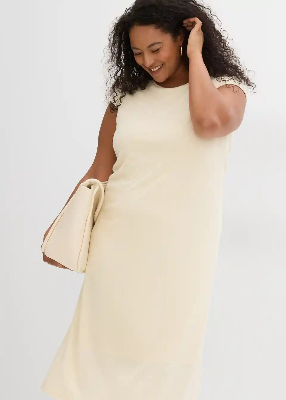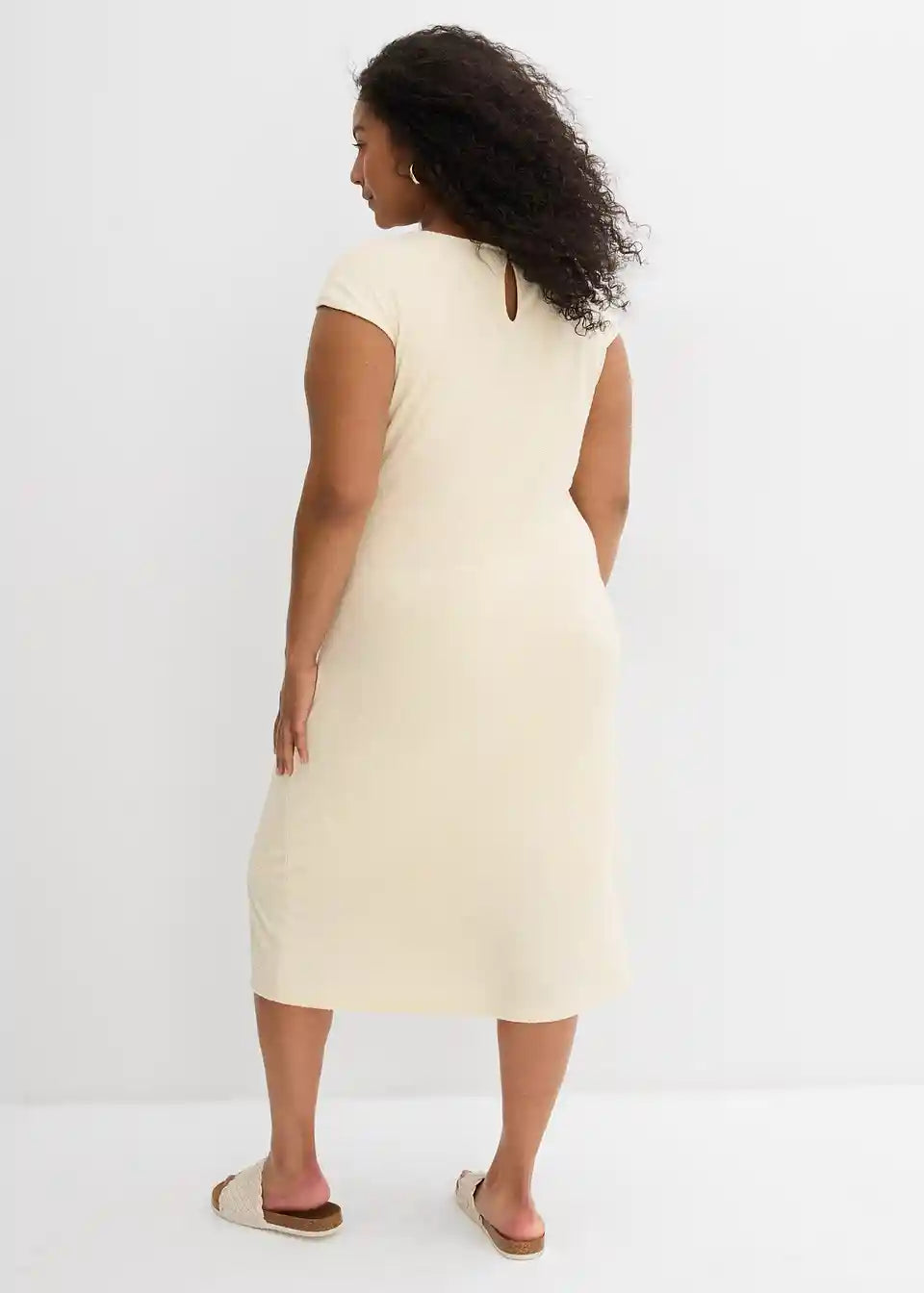 Midi obleka s skrajšano podlogo iz mehke viskoze. Ključavnična odprtina in zapiranje z gumbom na sredini vratu zadaj.
