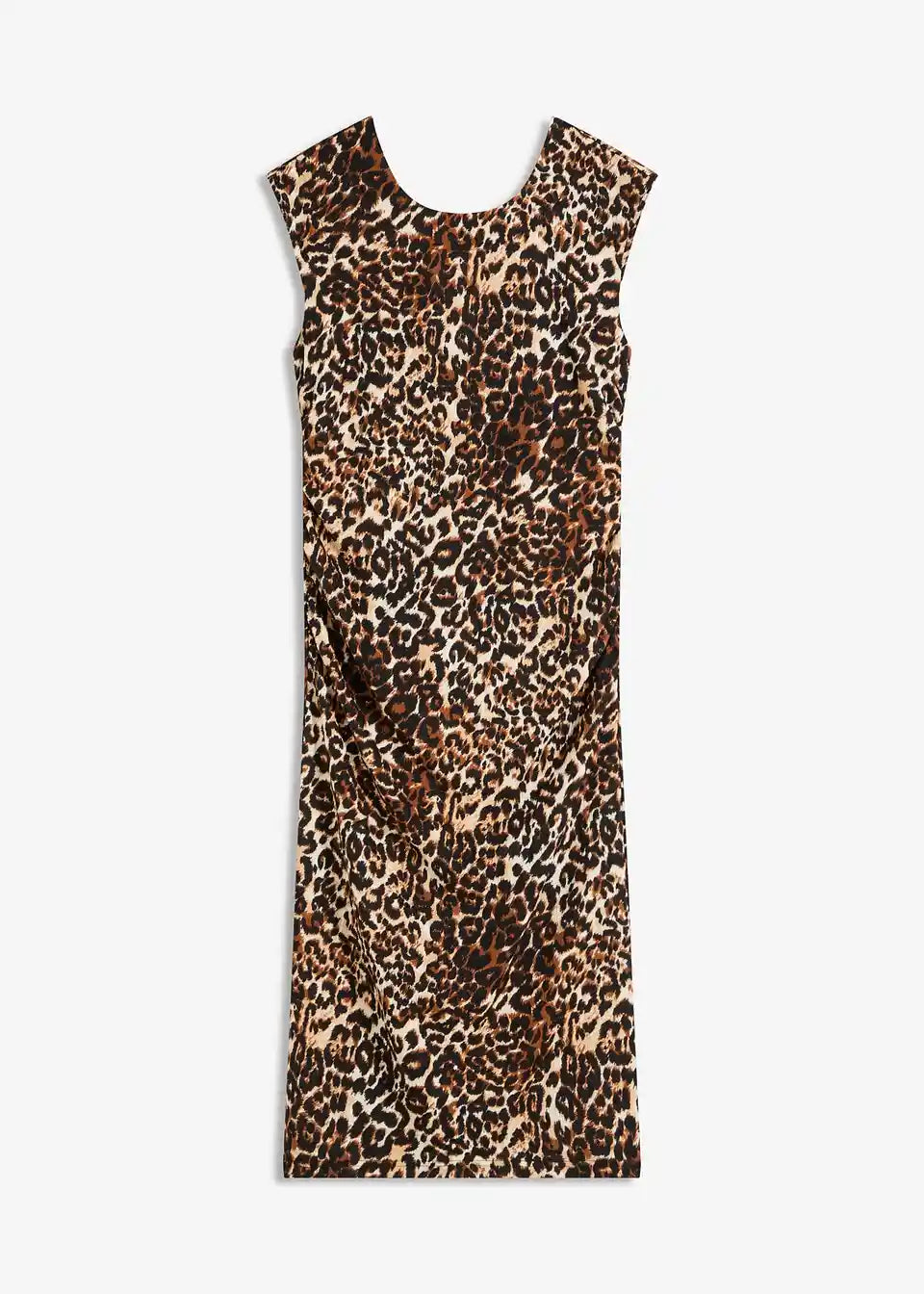 Stilna obleka z odlično prileganjem in globokim V-izrezom na hrbtni strani