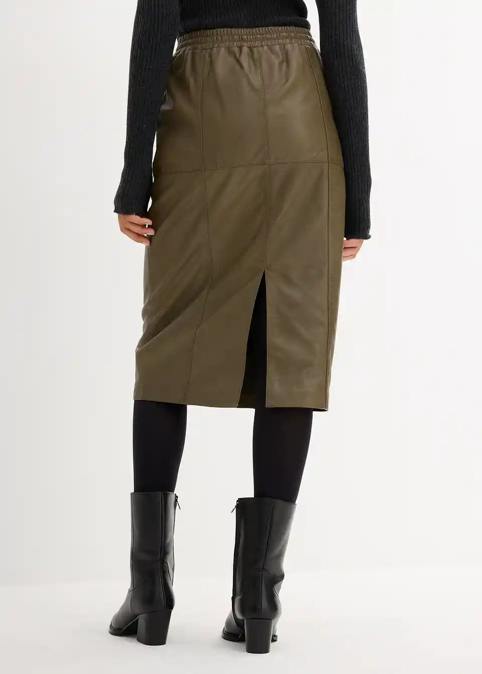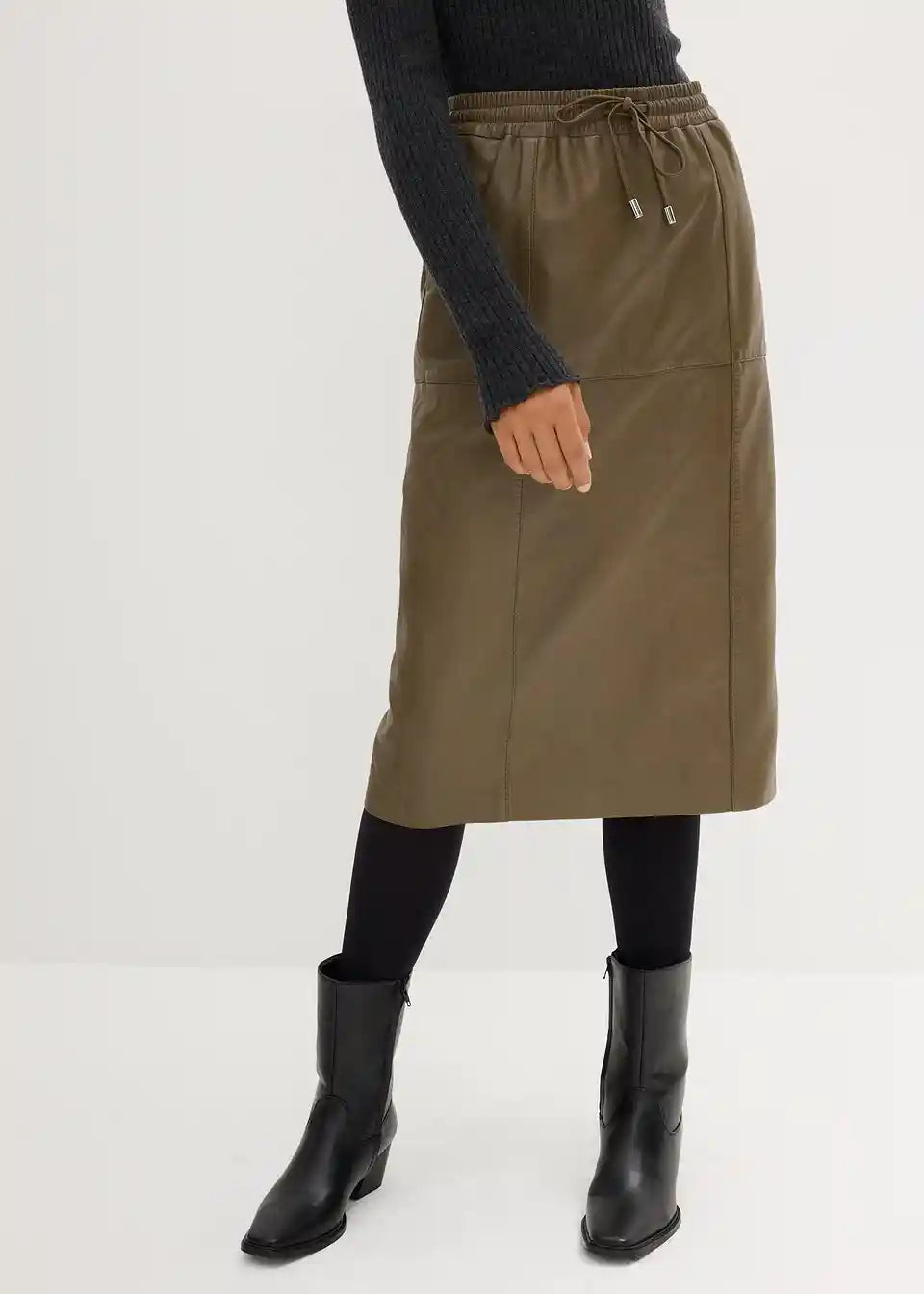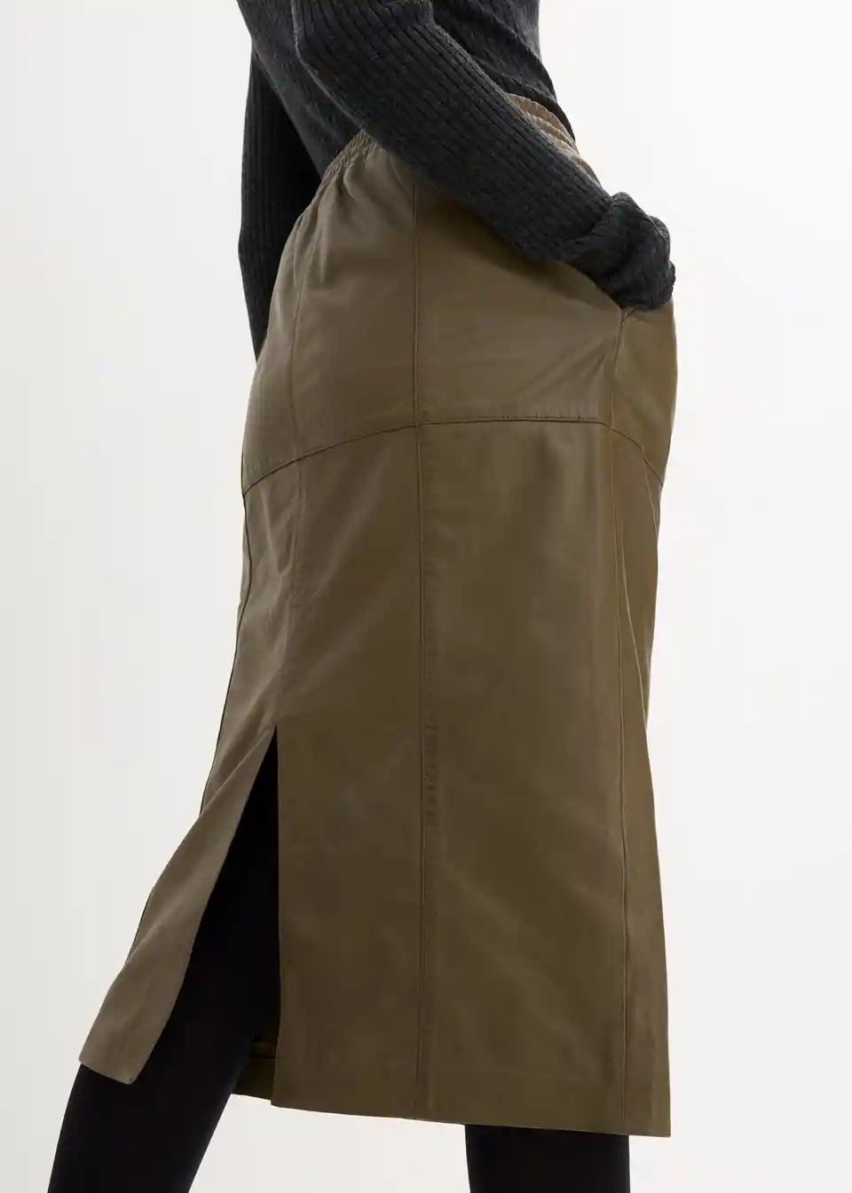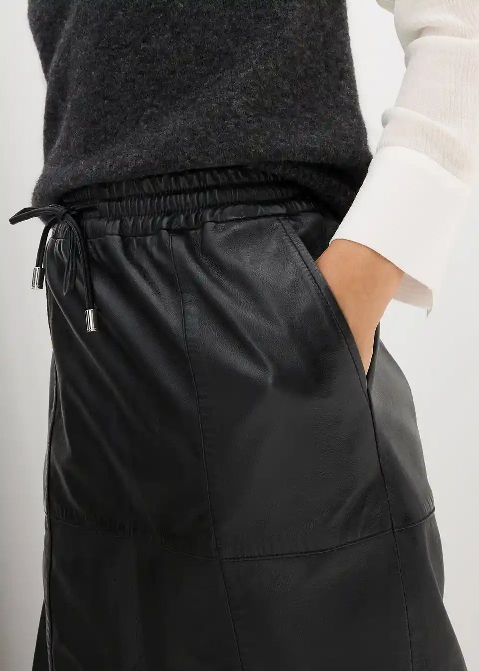 Mehko usnjeno krilo v midi dolžini z vezalnim pasom, v celoti podloženo