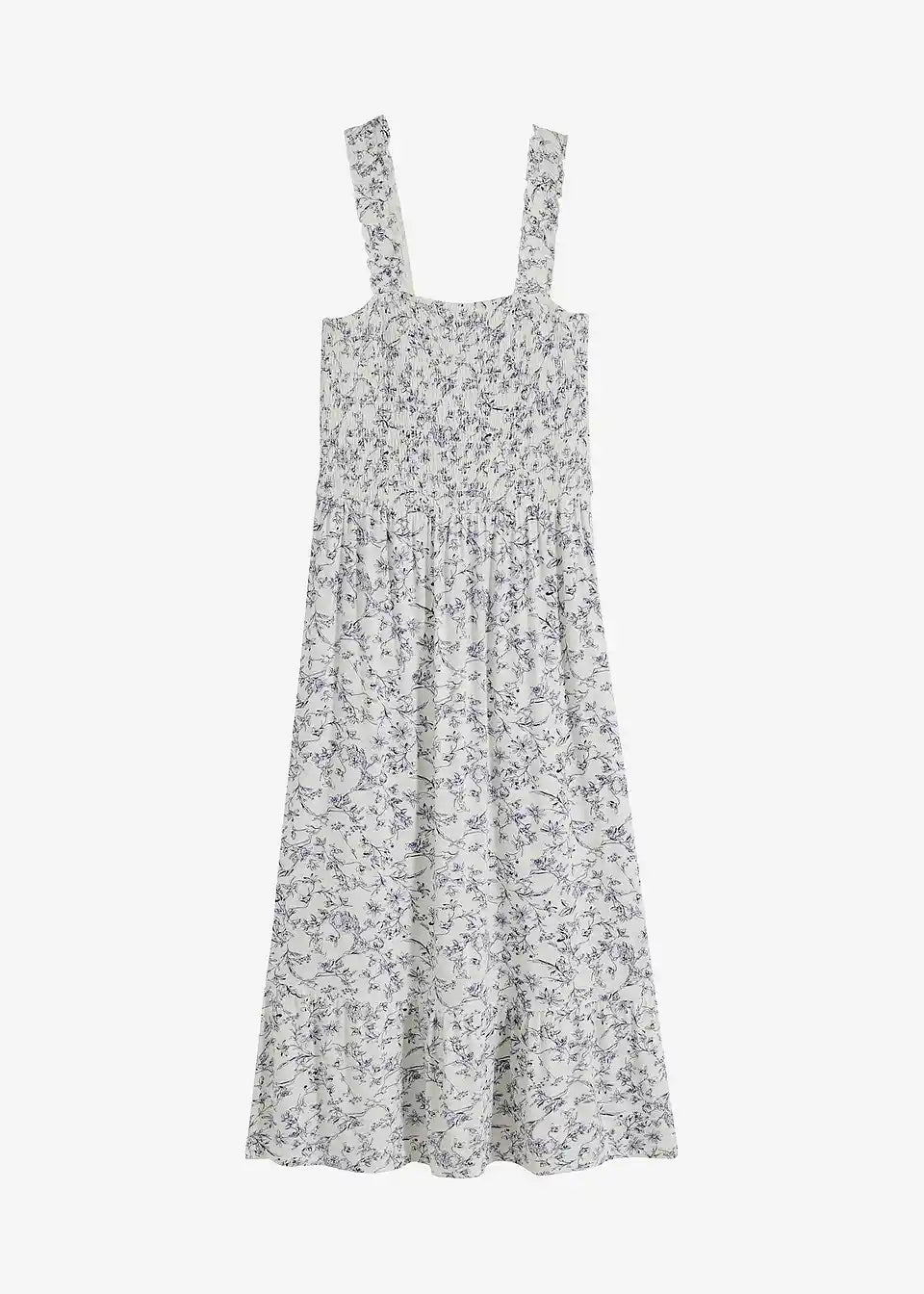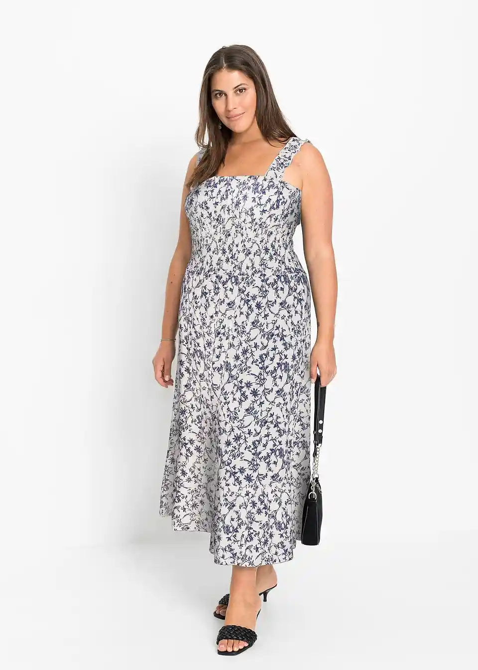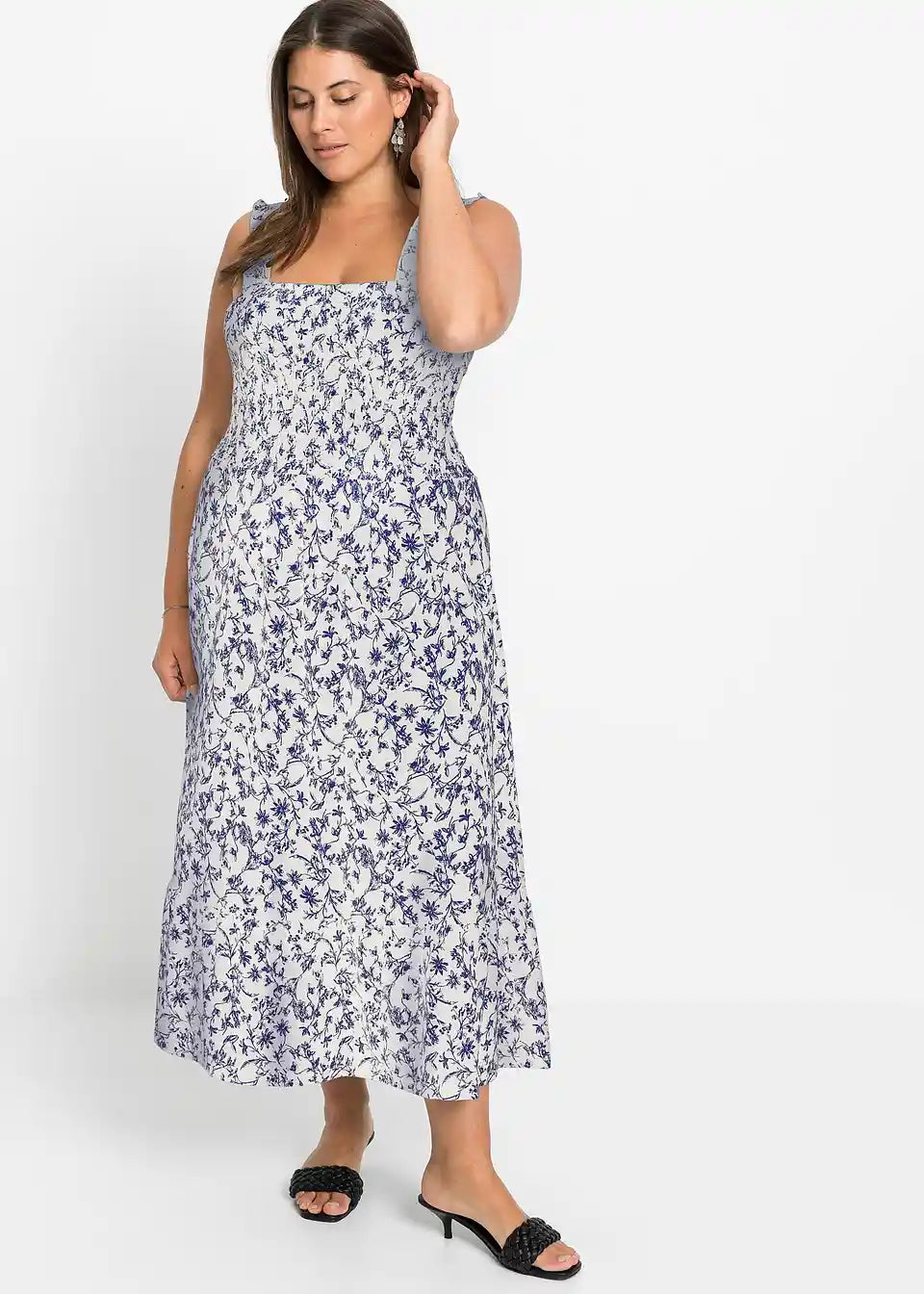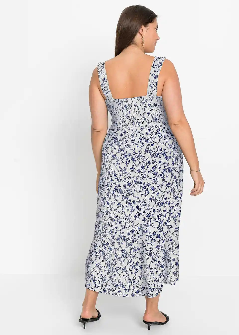 Moderna srednje dolga obleka s shirring detajli in volančki