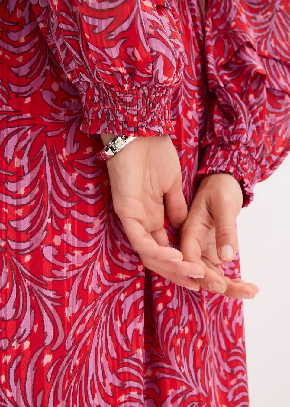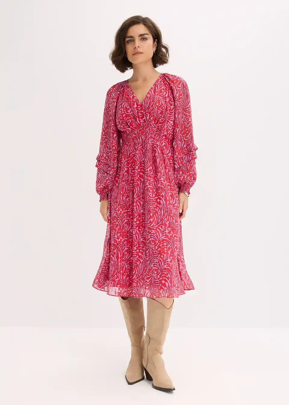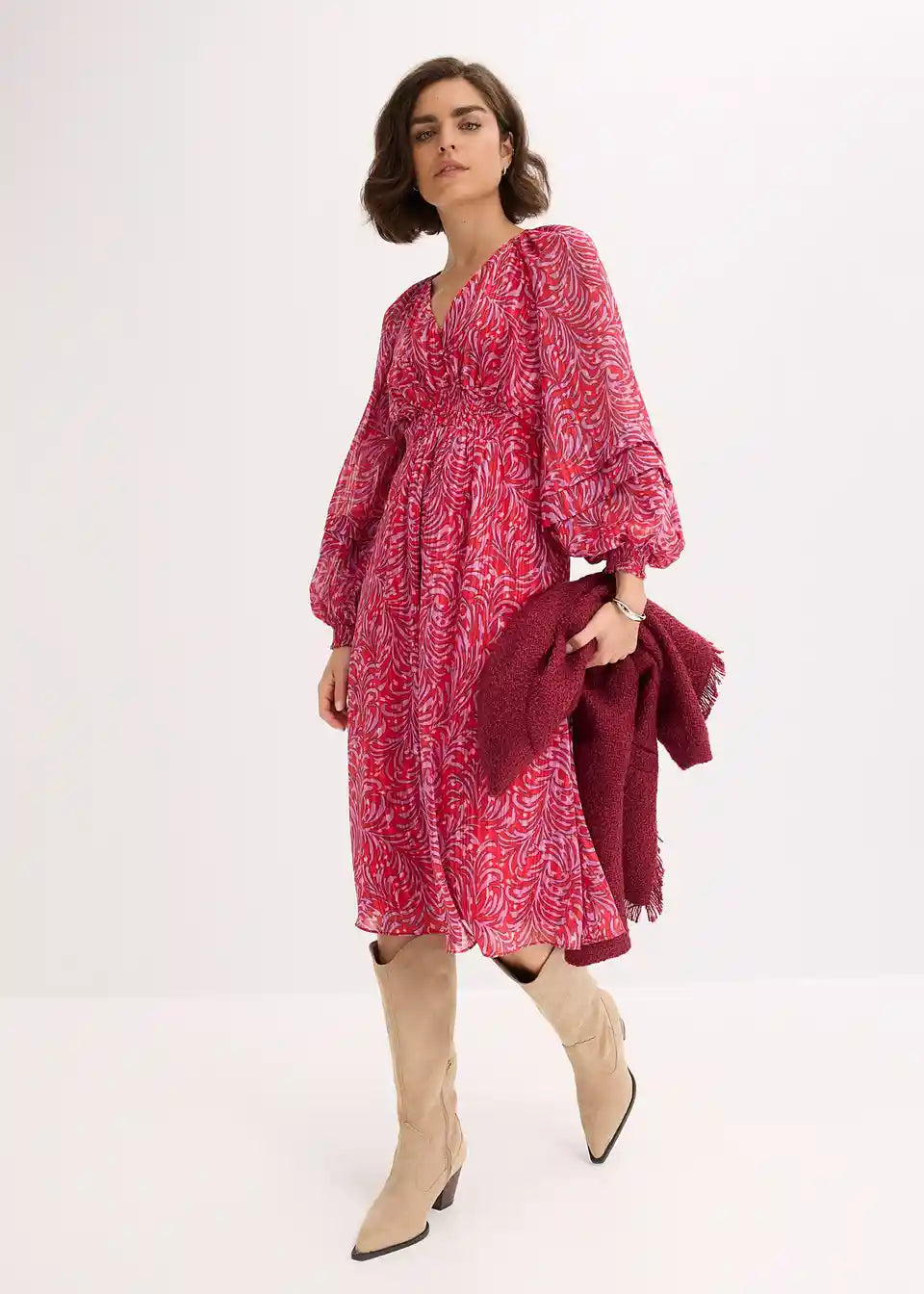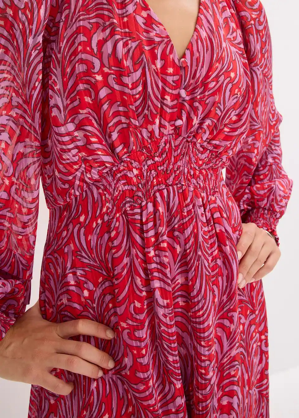 modna midikleid s smock detajlom v pasu, širokimi rokavi in dekorativnimi gumbi spredaj na zgornjem delu