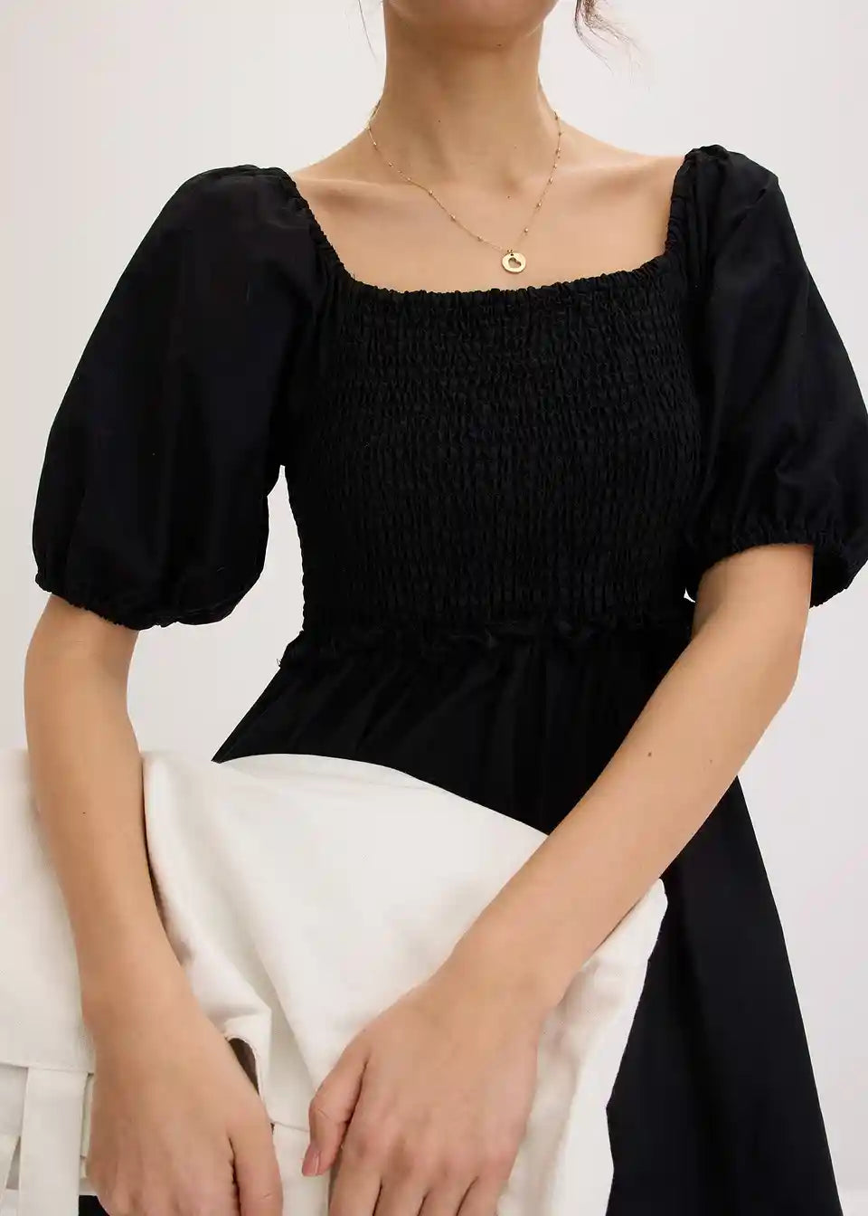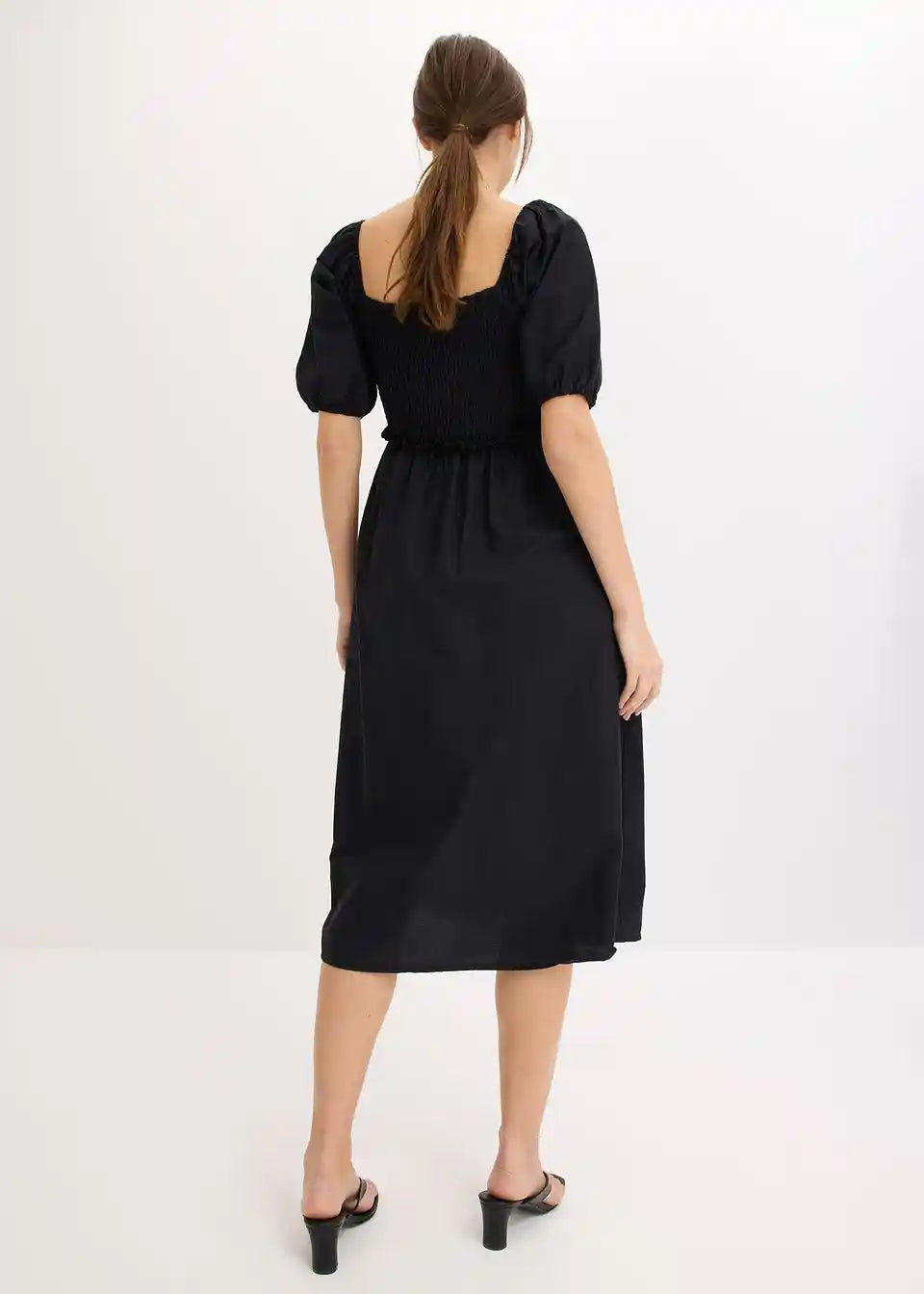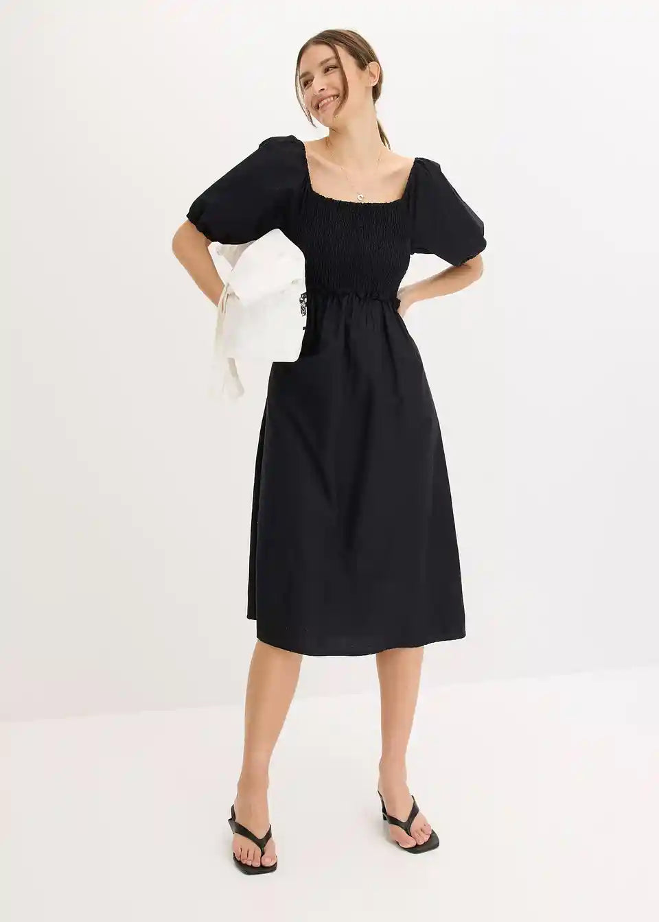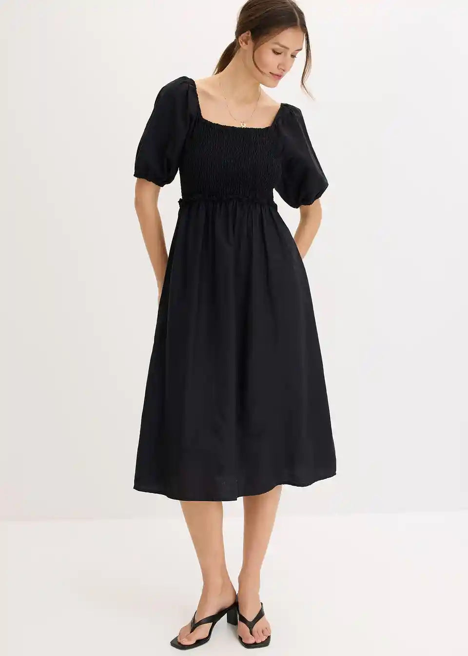Midi obleka z balonastimi rokavi in gosto nabranim detajlom