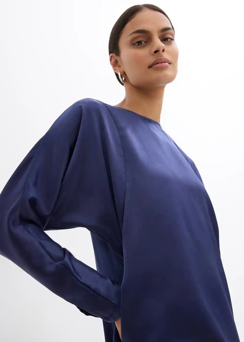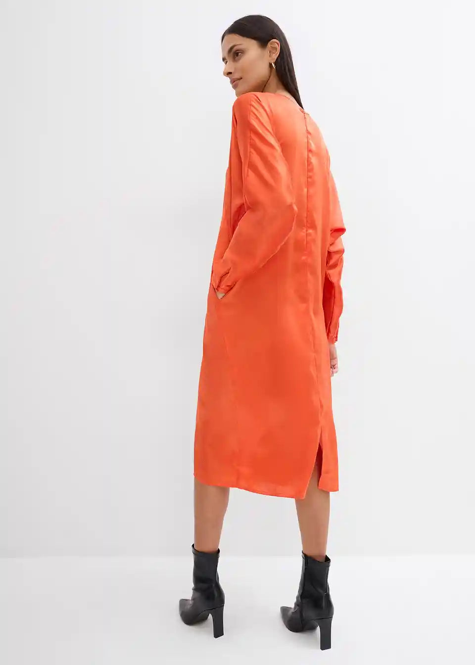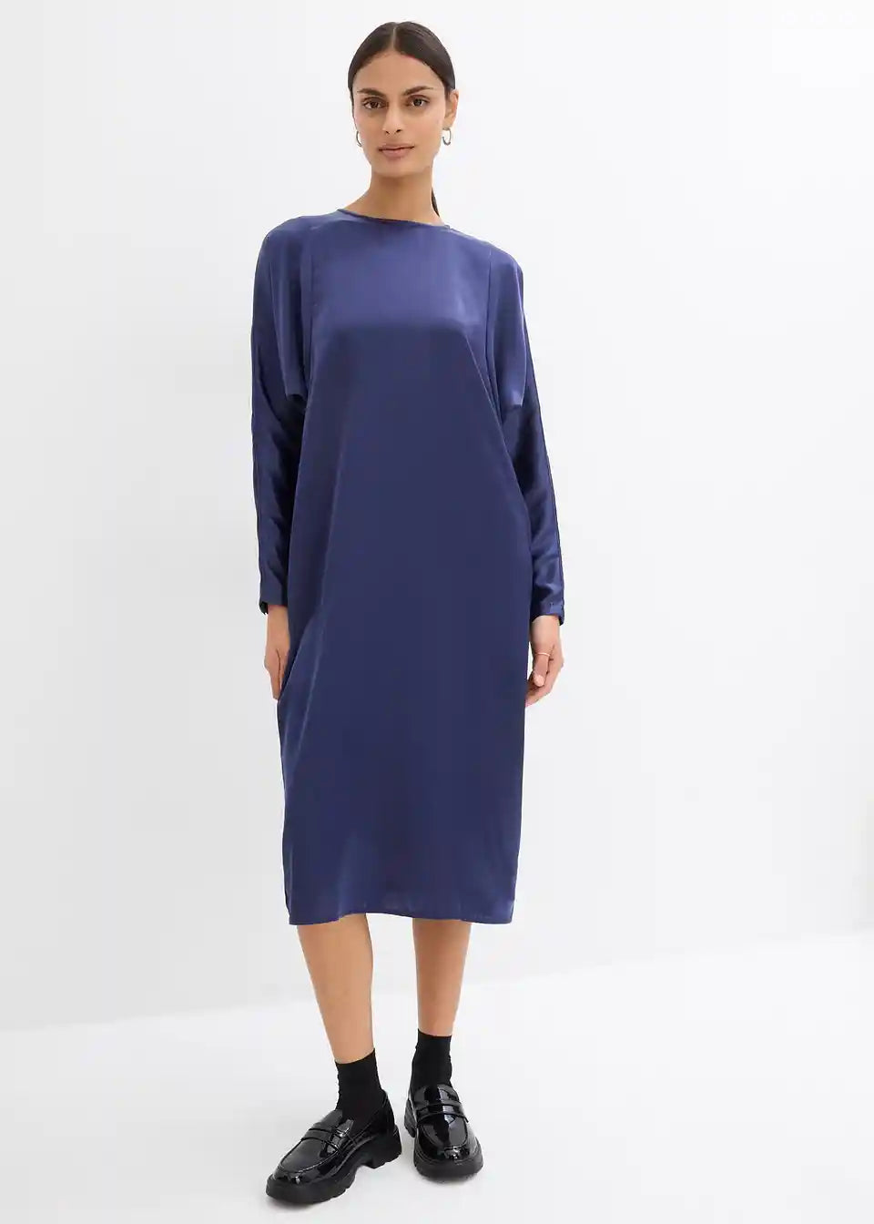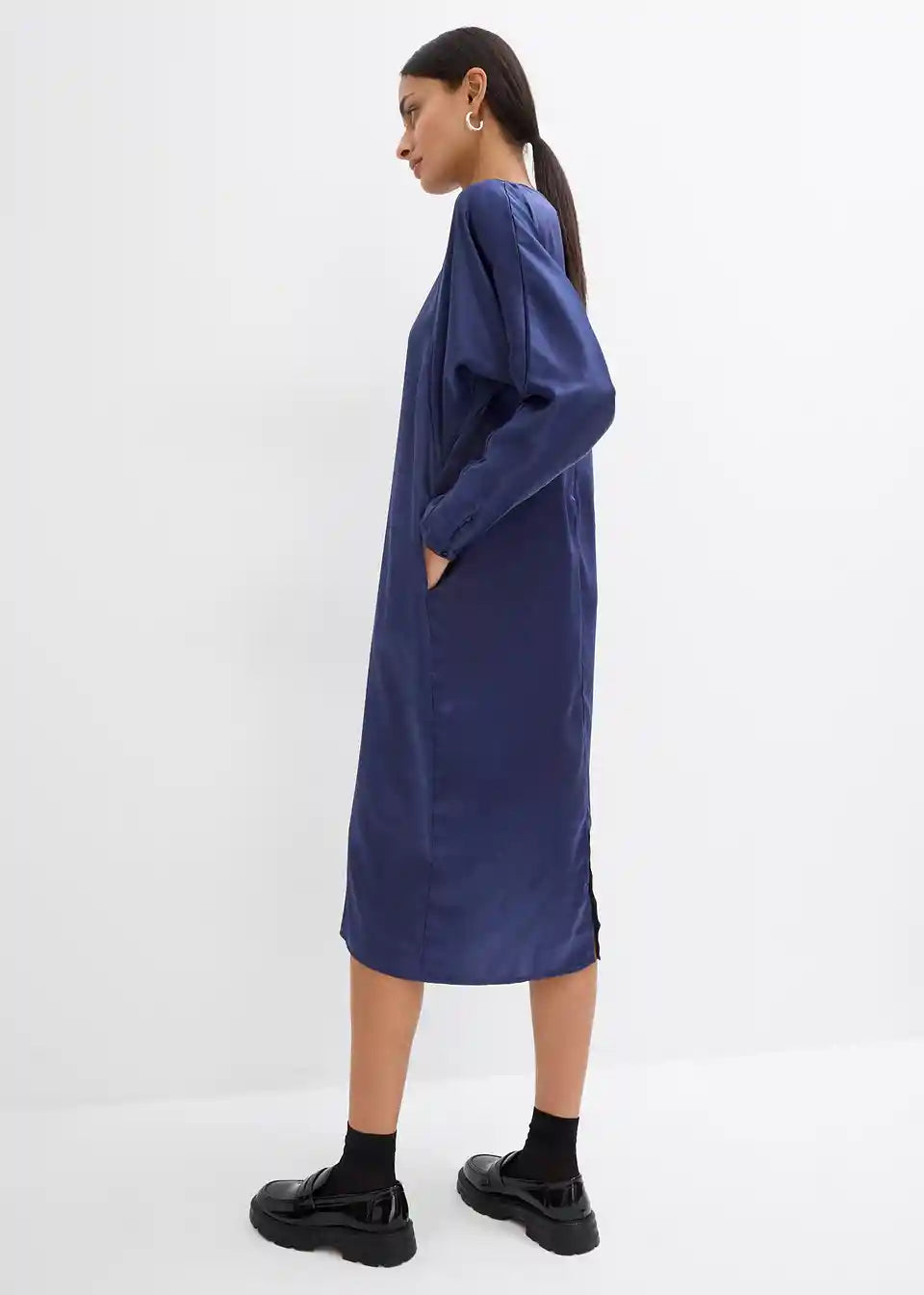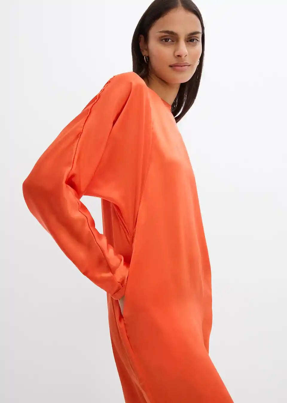Midikleid z ohlapnim krojem iz rahlo sijočega satena ter netopirskimi rokavi in razporkom zadaj za večjo svobodo gibanja