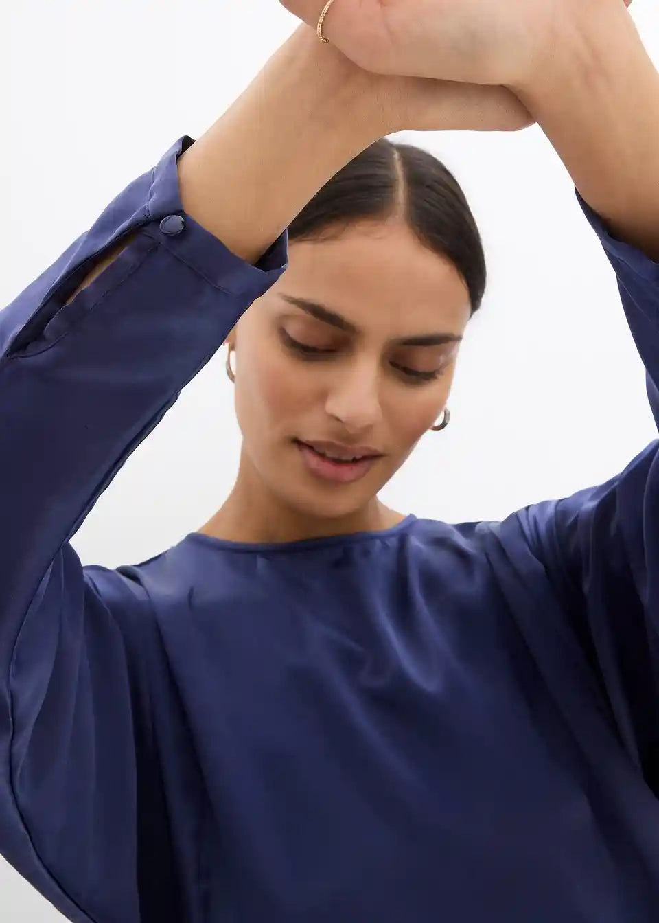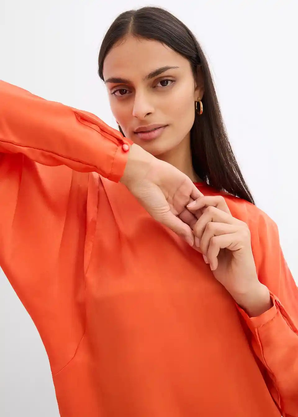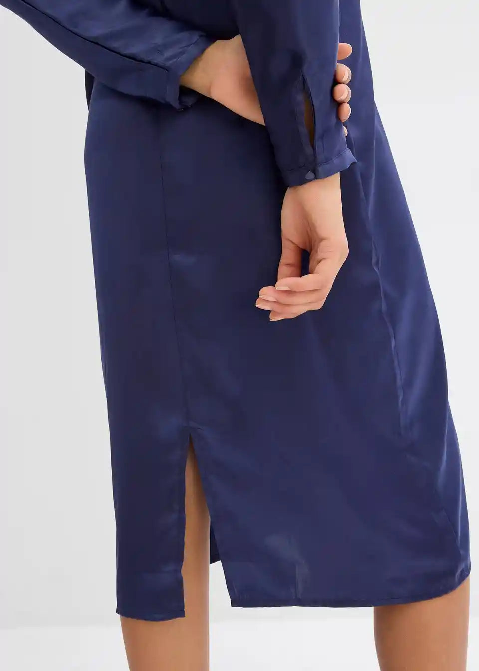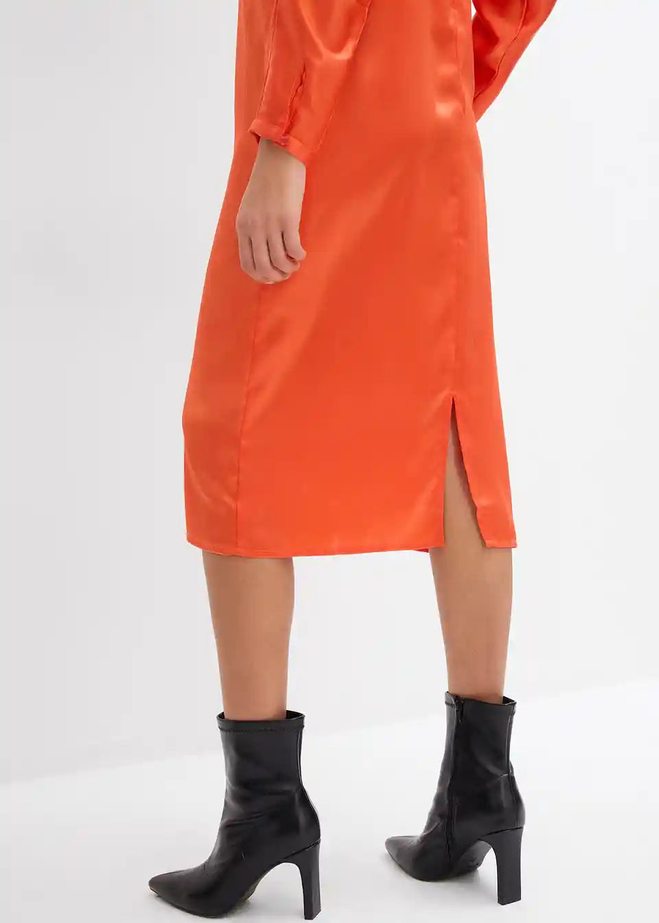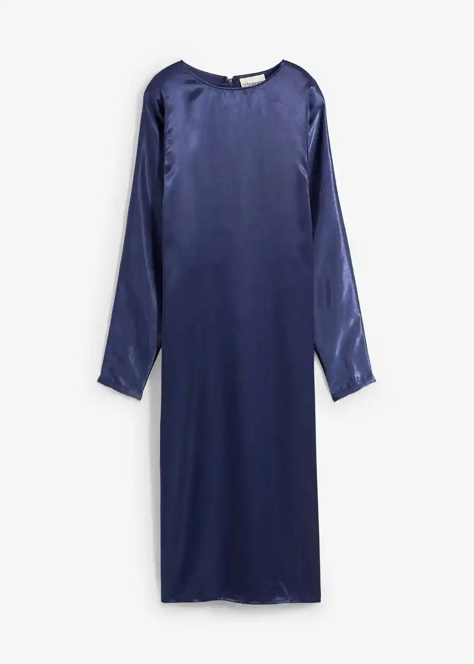 Midikleid z ohlapnim krojem iz rahlo sijočega satena ter netopirskimi rokavi in razporkom zadaj za večjo svobodo gibanja