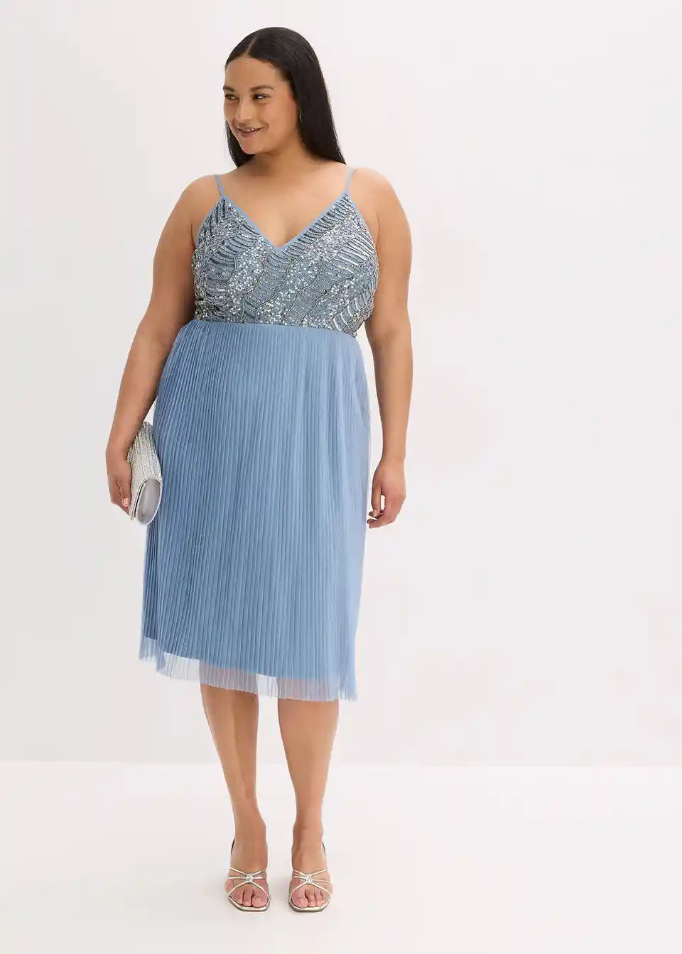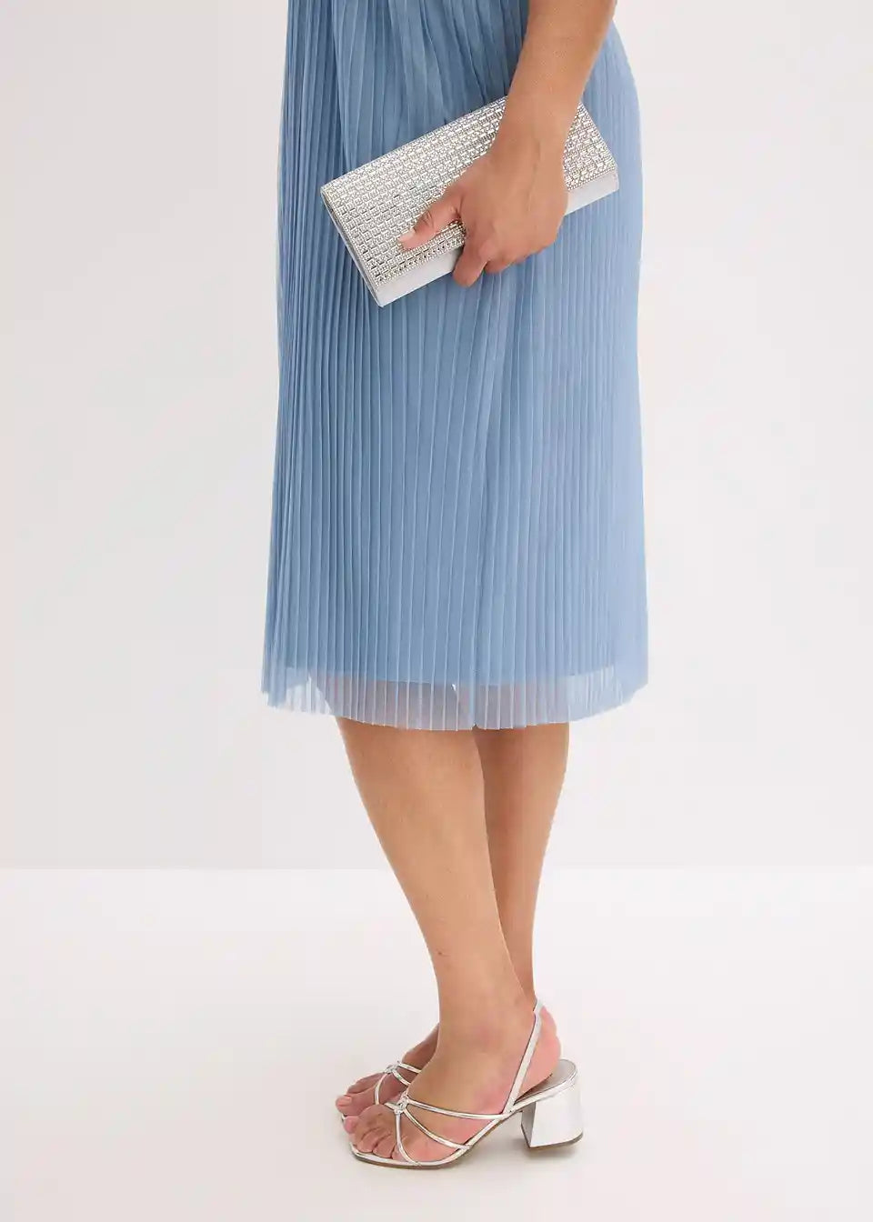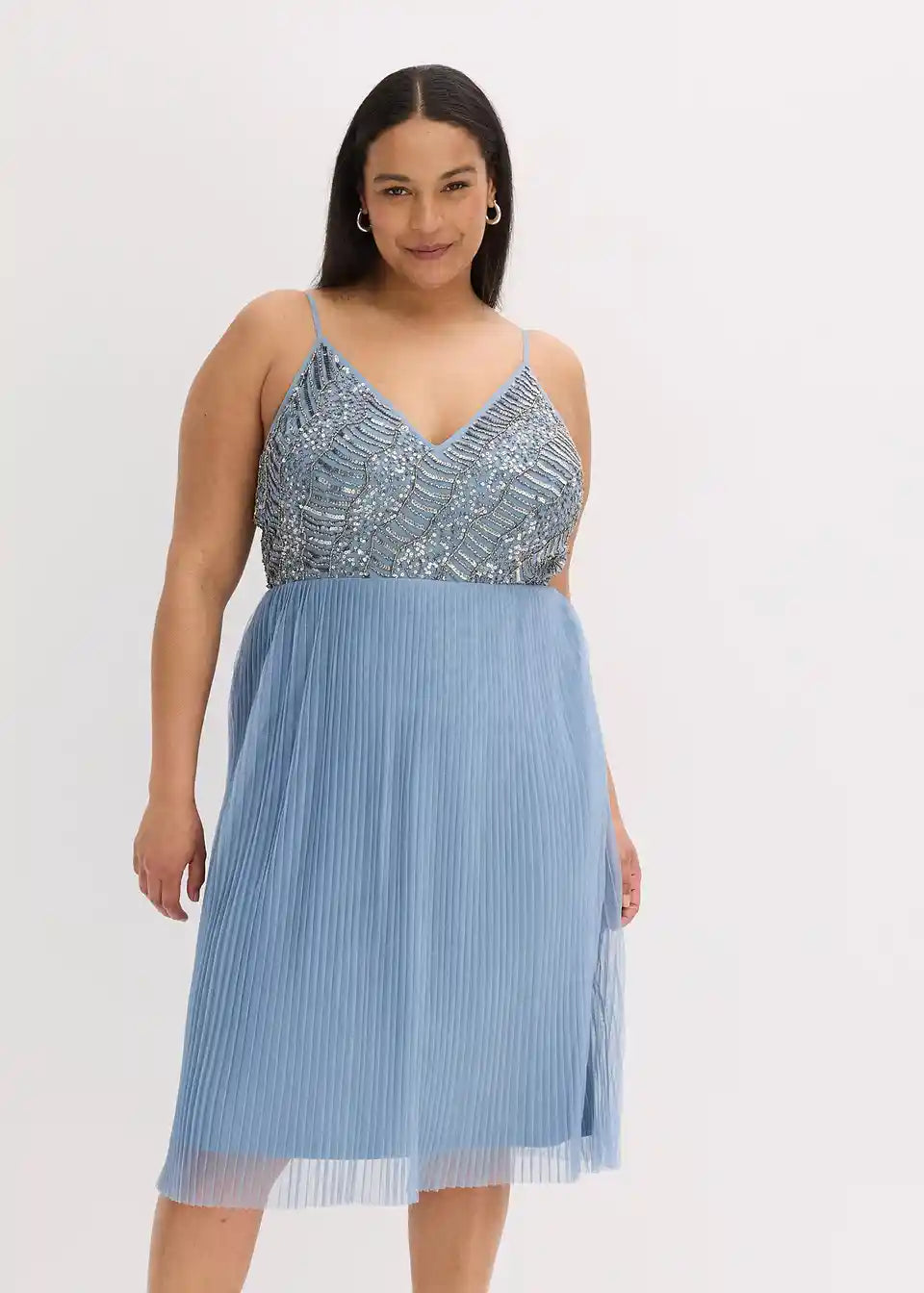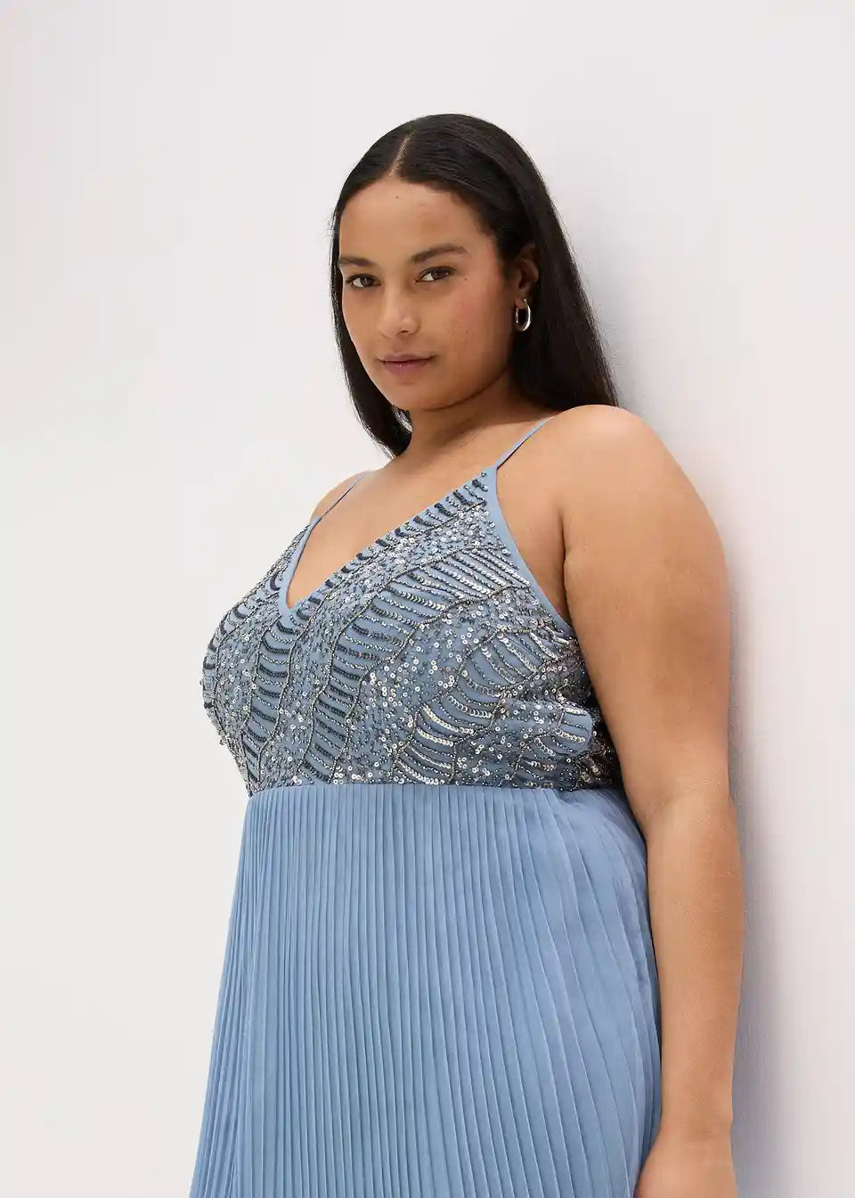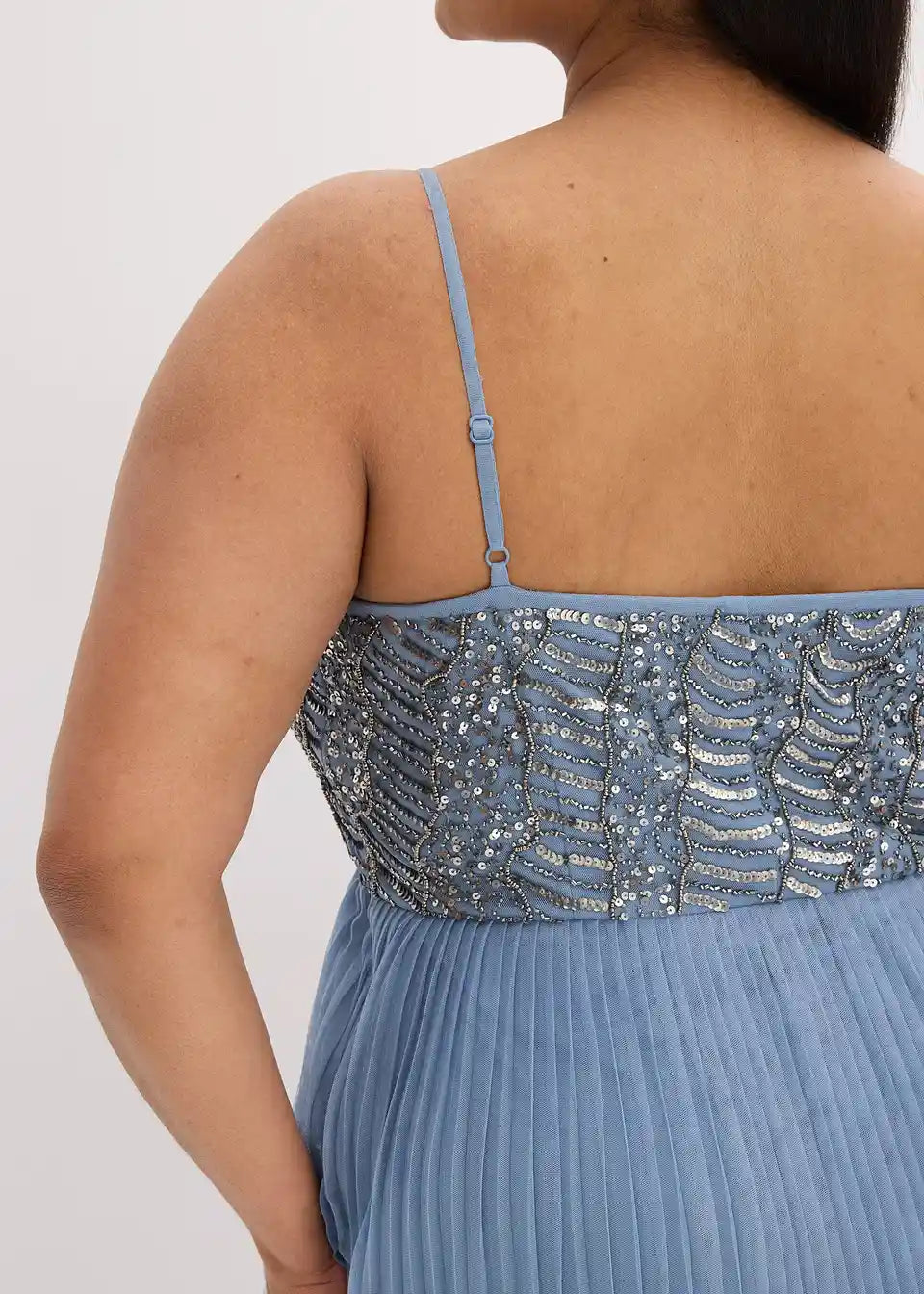 Moderna in ženstvena: večerna obleka s plisiranim krilom in vzorčastim bleščečim vezenjem na zgornjem delu