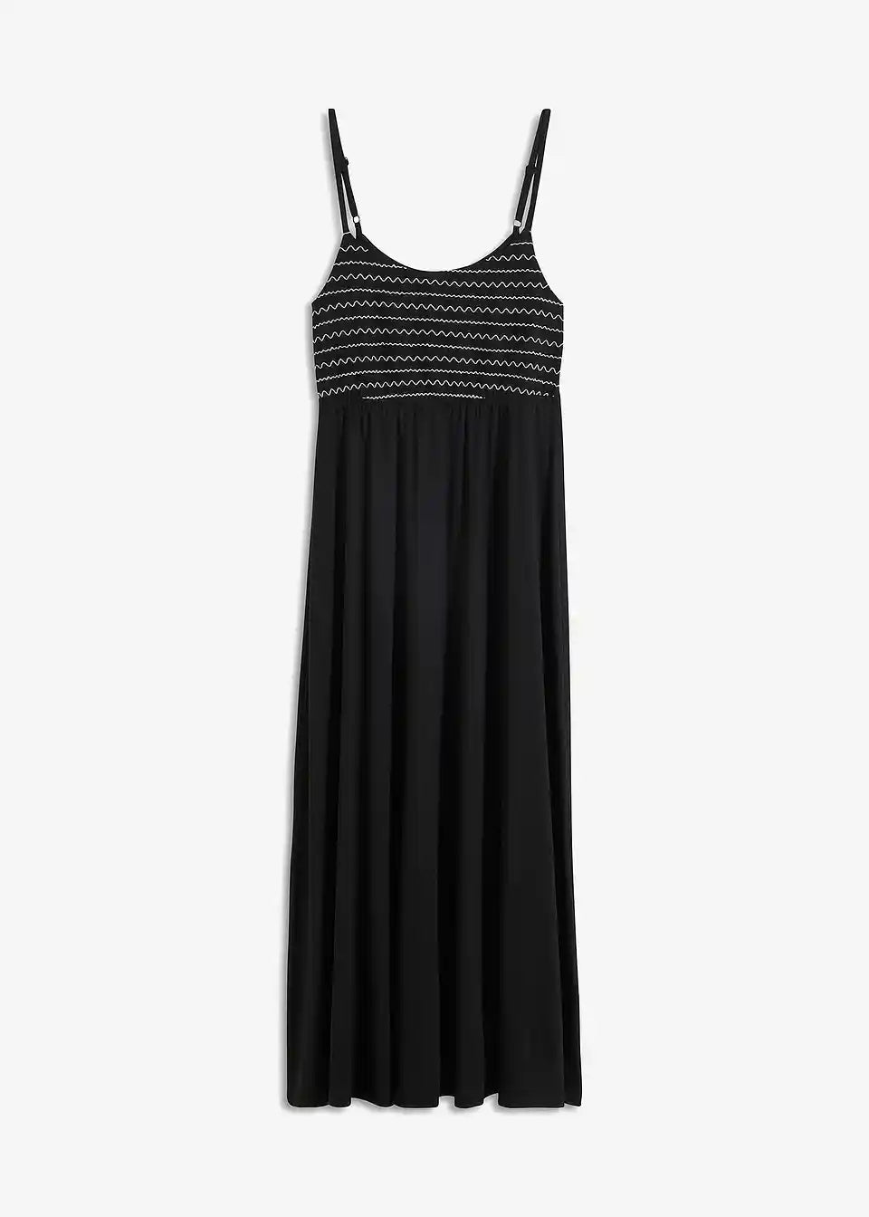 Jersey obleka s špageti naramnicami in nabranimi okrasnimi šivi na zgornjem delu