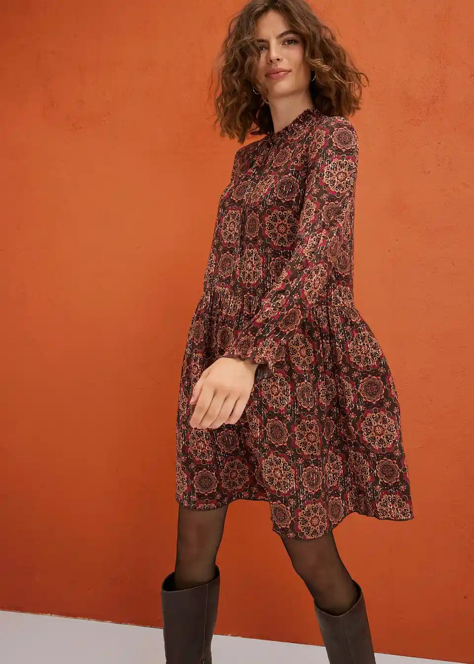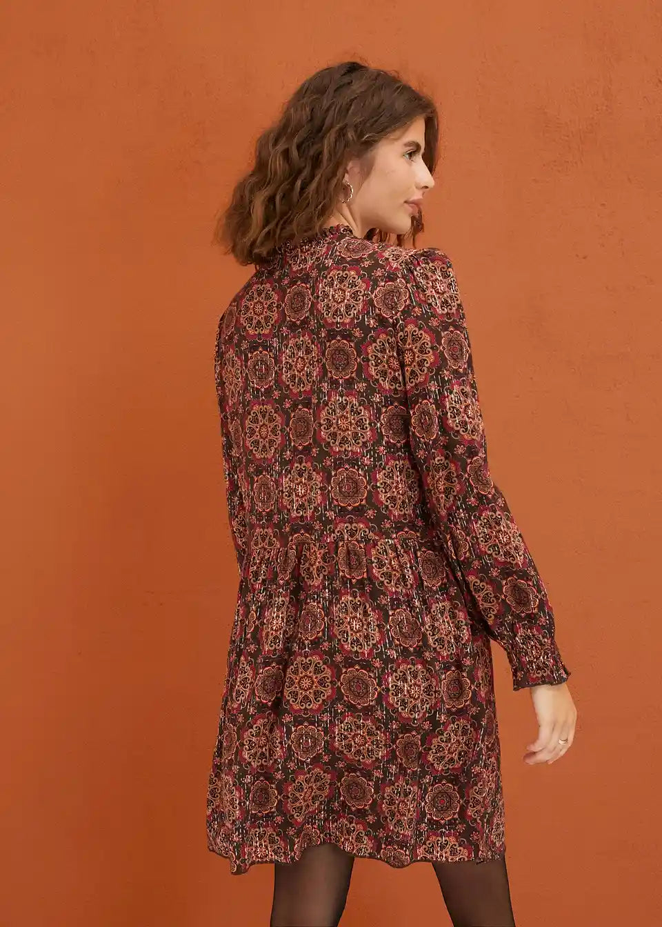 Kratka, potiskana tkaninska obleka z volančki in V-izrezom