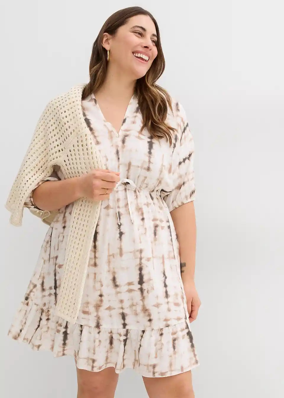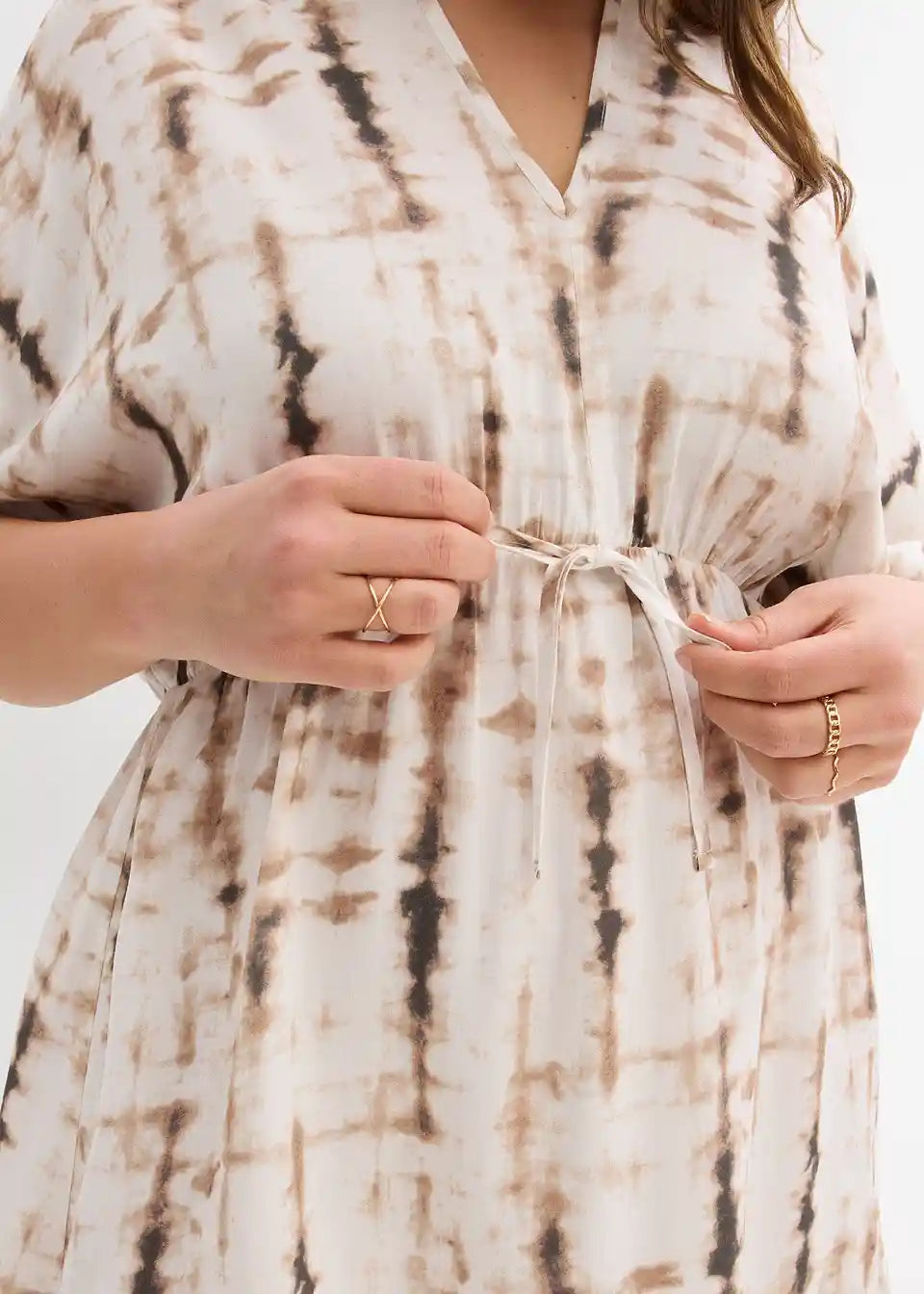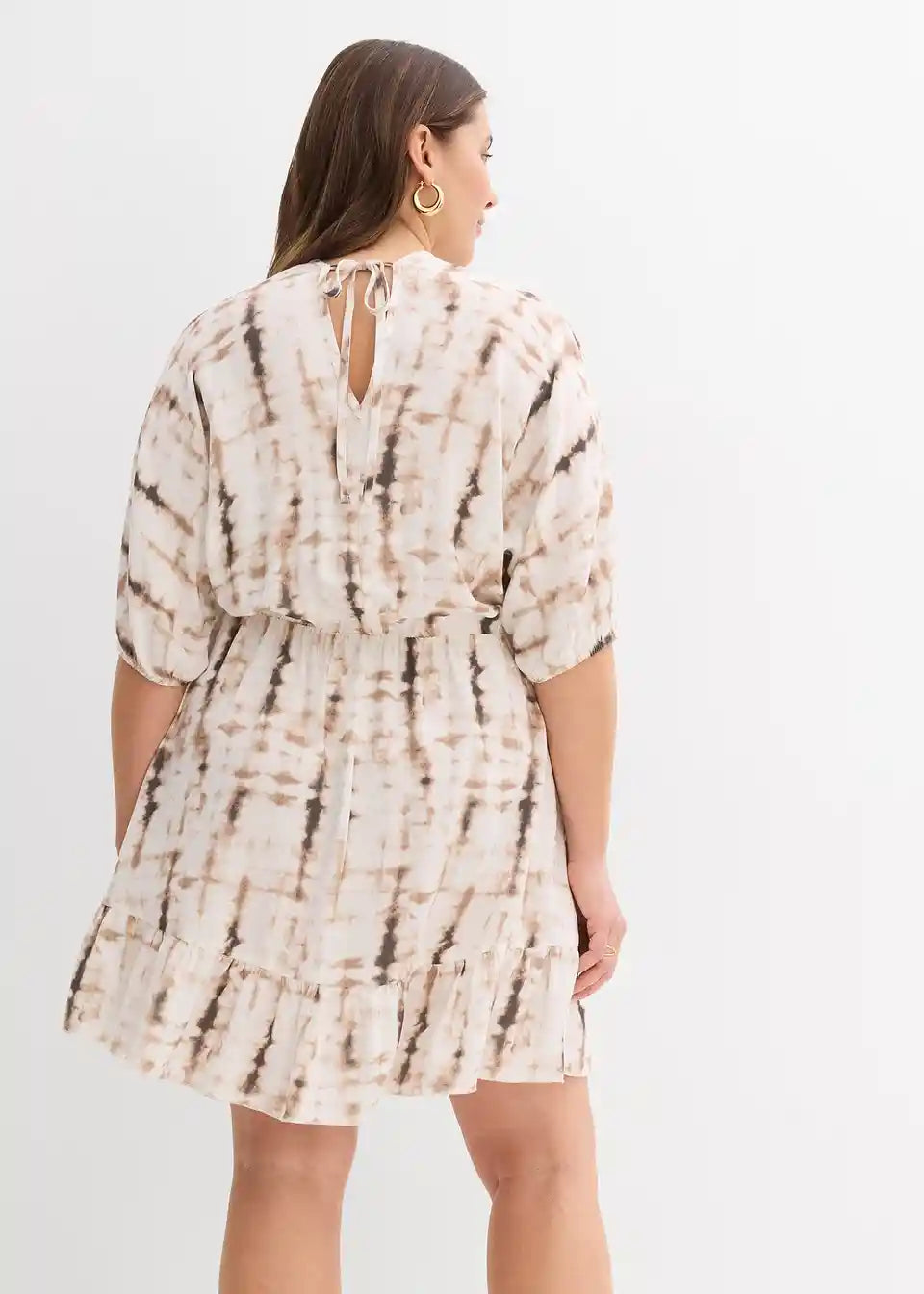Modna mini obleka iz mehke viskoze z batik vzorcem in detajlom zavezovanja