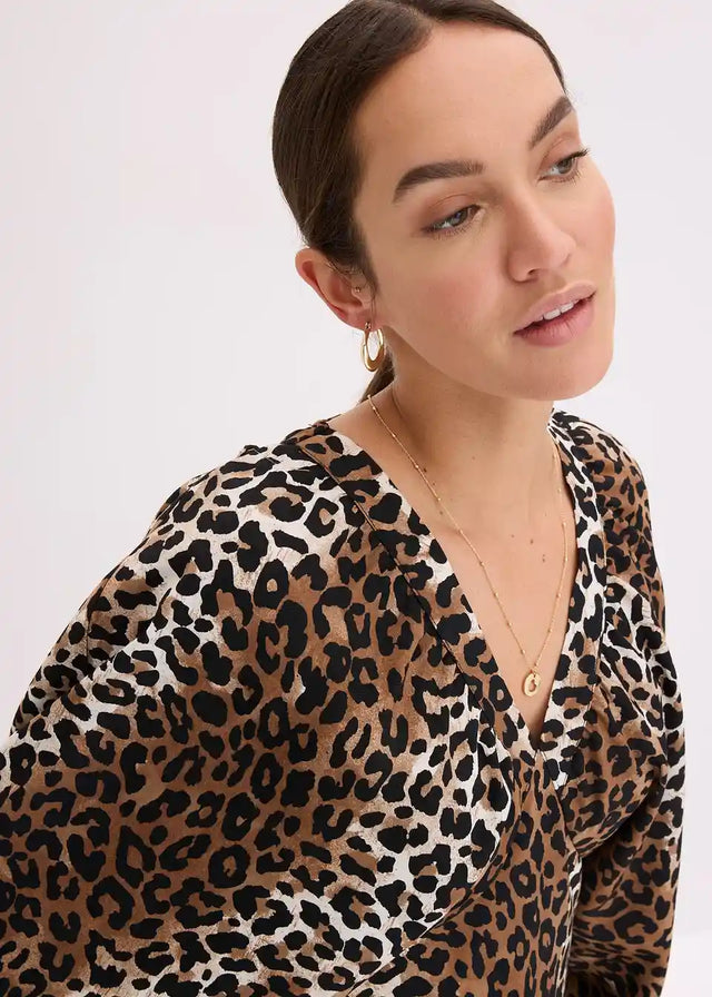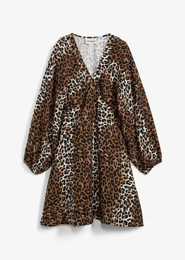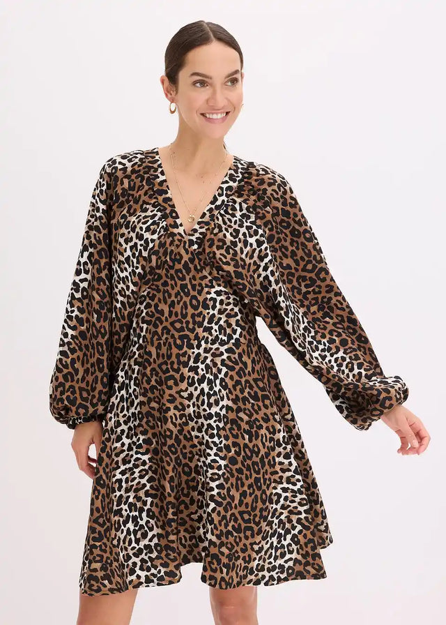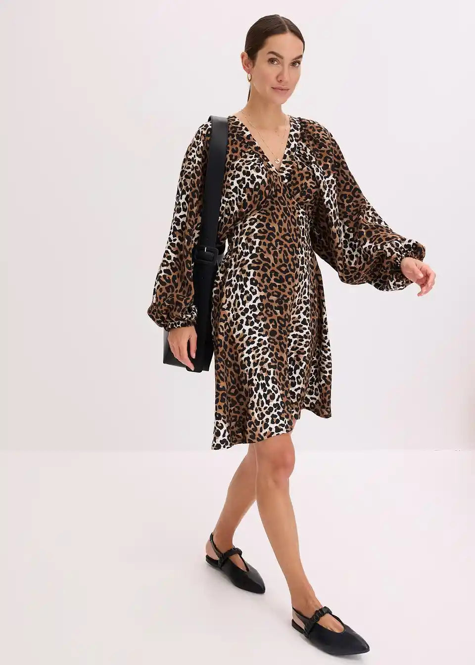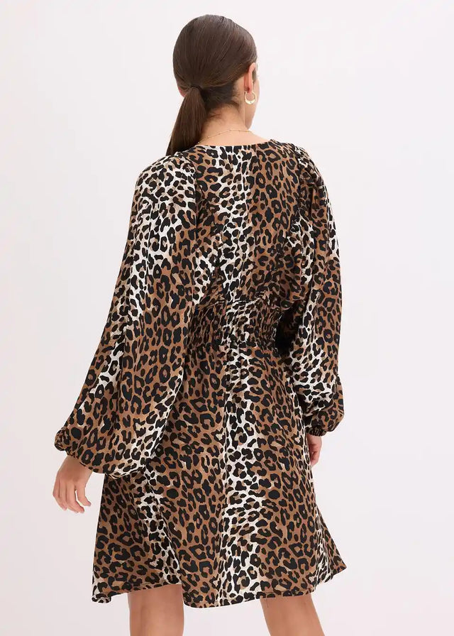 Modna obleka z živalskim potiskom z poudarjenim pasom in voluminoznimi rokavi