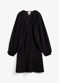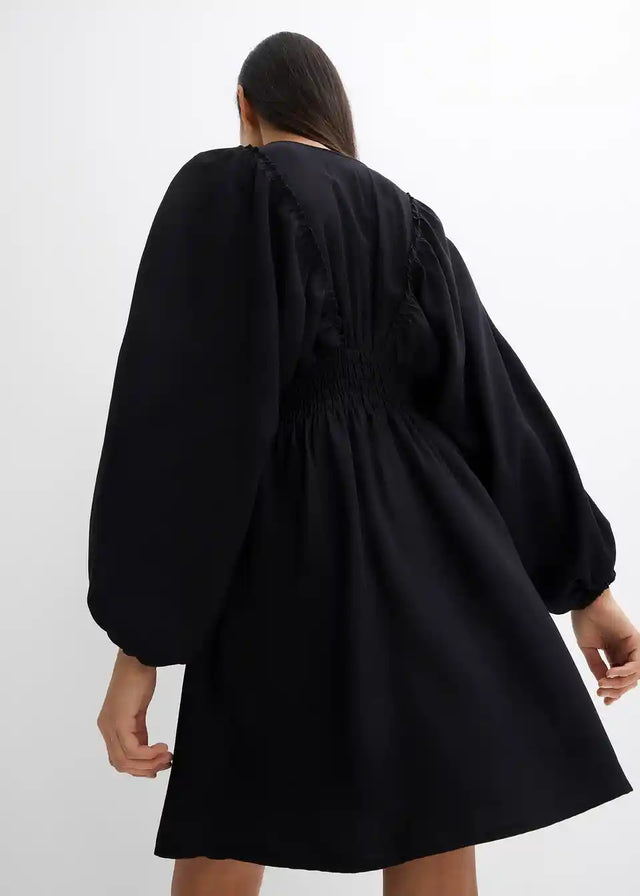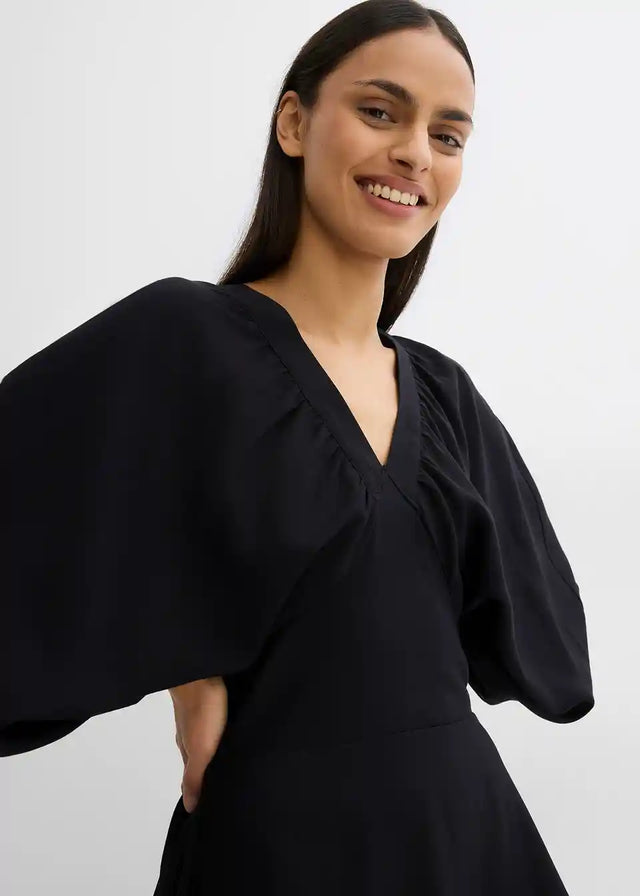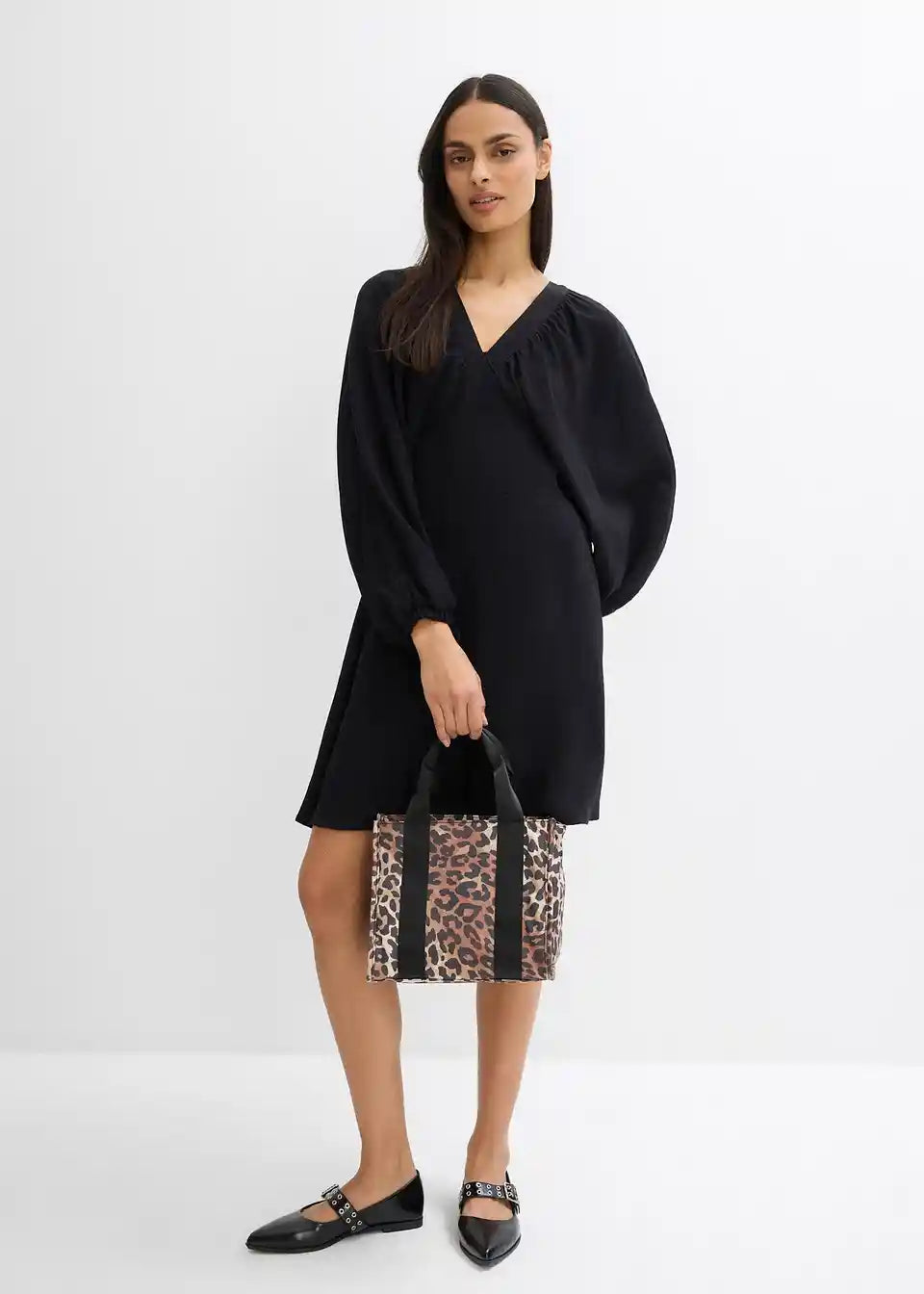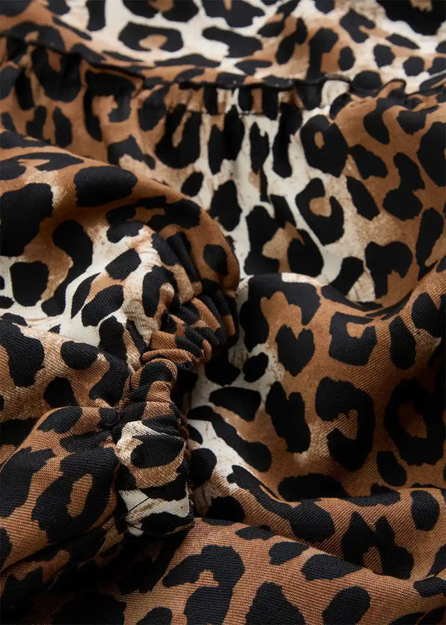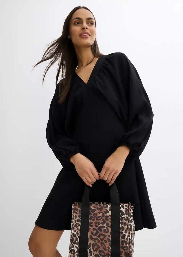 Modna obleka z živalskim potiskom z poudarjenim pasom in voluminoznimi rokavi