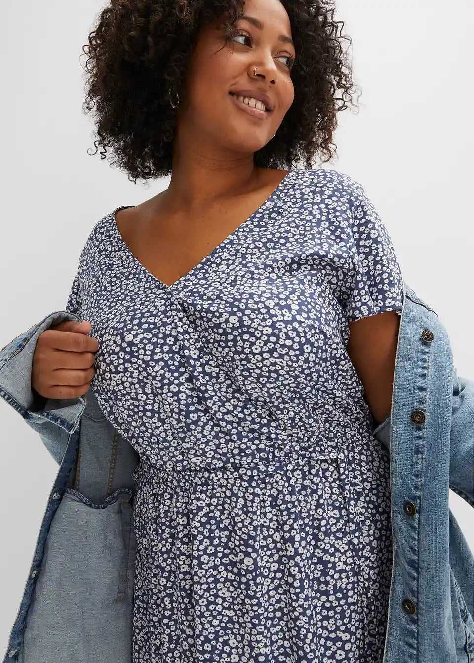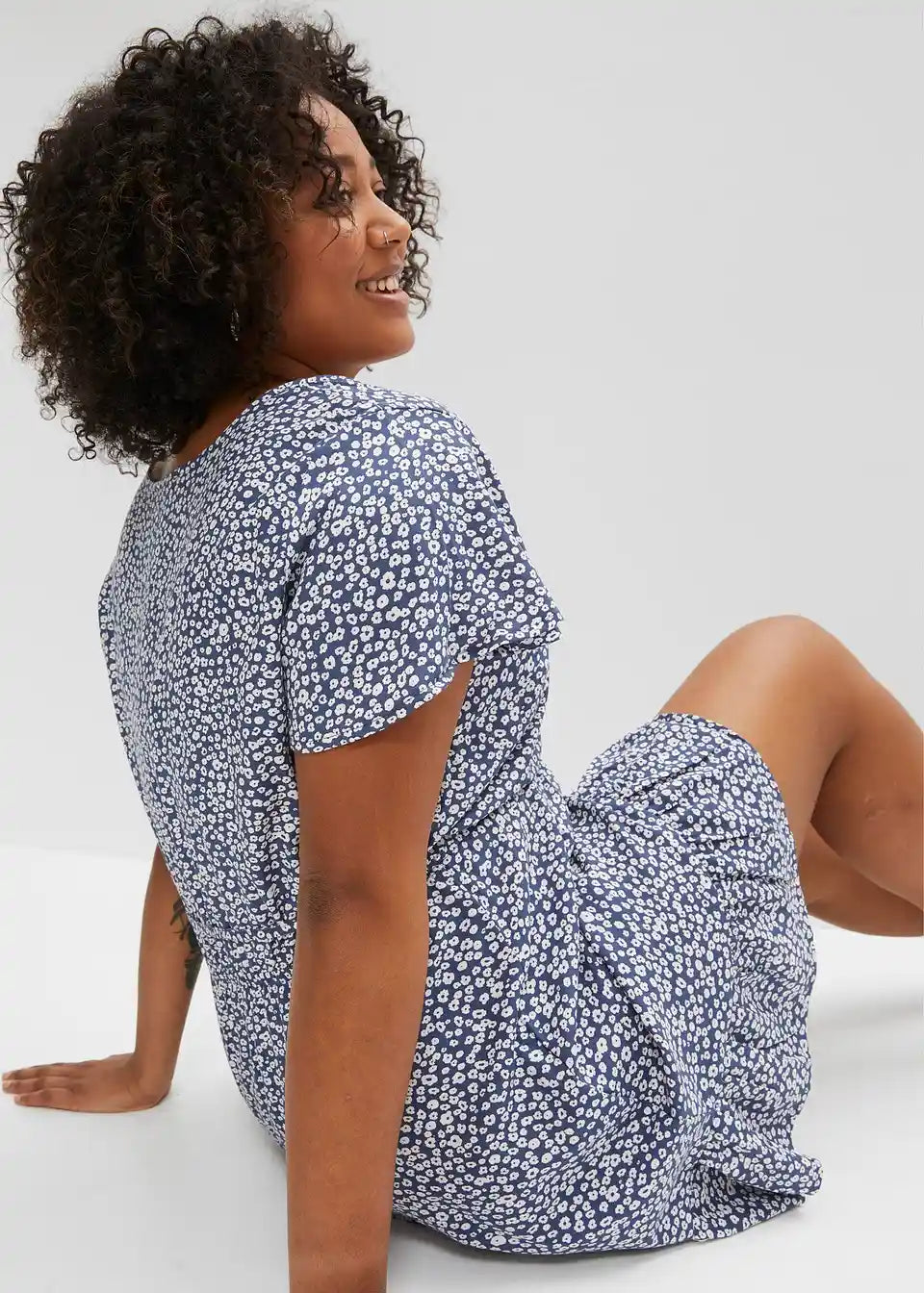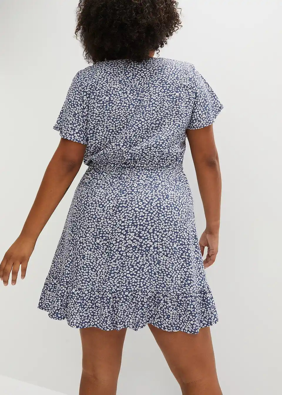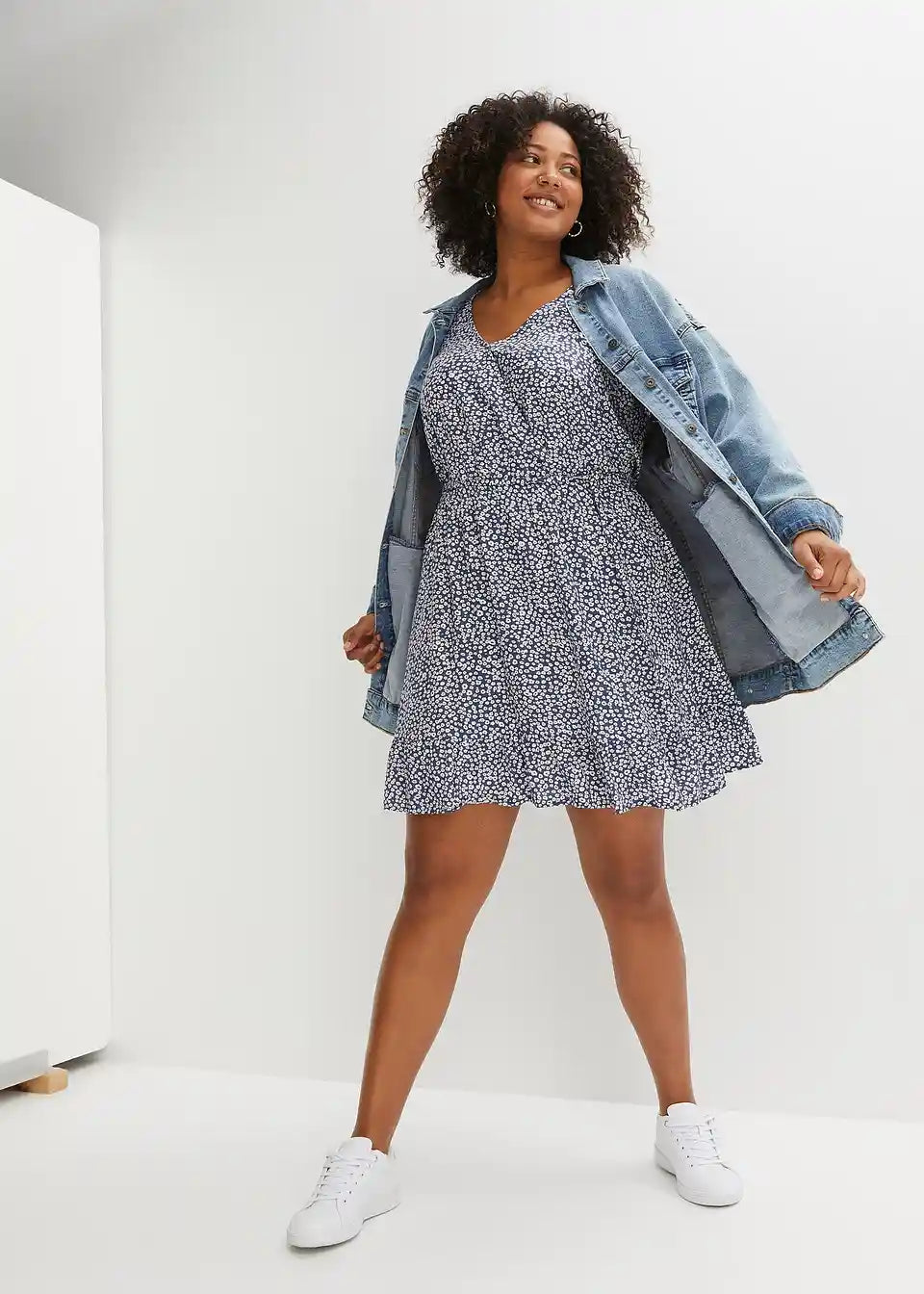 Z volančki in V-izrezom. Skupna dolžina velikosti 38 je približno 92 cm.