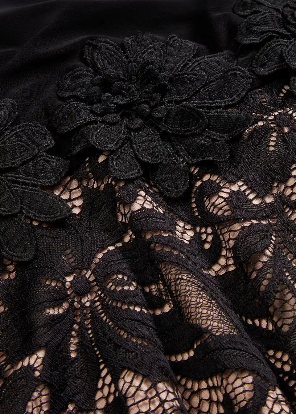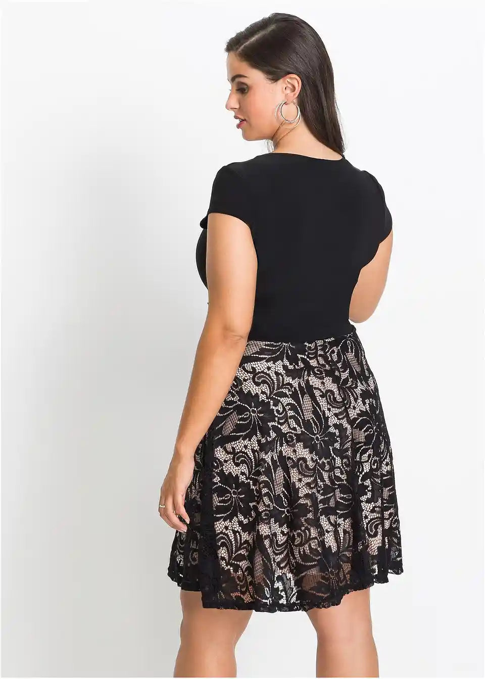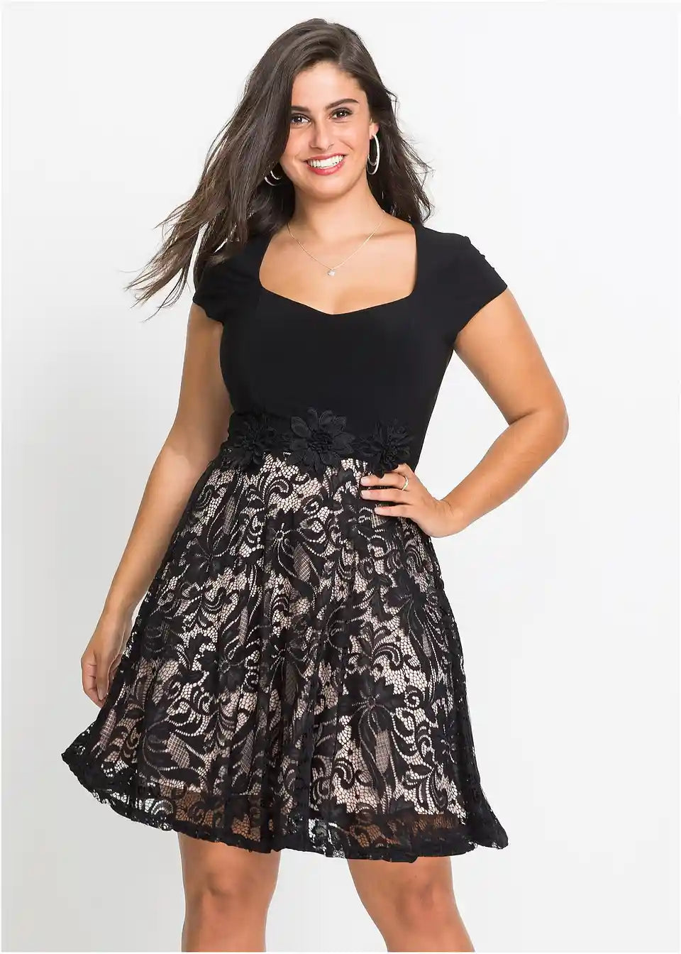 Naj bo to krst, poseben rojstni dan ali poroka – s to romantično obleko znamke BODYFLIRT bodo ženske samozavestno in elegantno nastopile. Kratka obleka v laskavi A-liniji očara z oprijetim zgornjim delom in globokim, srčastim izrezom. Lahek, razširjeni spodnji del je v celoti izdelan iz plemenite cvetlične Čipke. Na pasu tri velike aplikacije cvetov privabijo poglede. Izstopajoča obleka s Čipko najbolje deluje z elegantnimi visokimi petami.