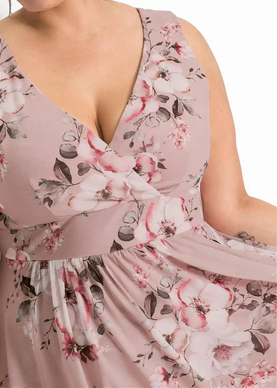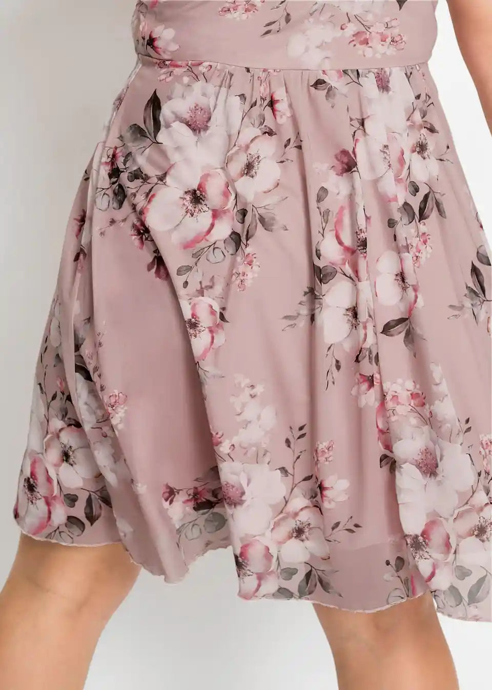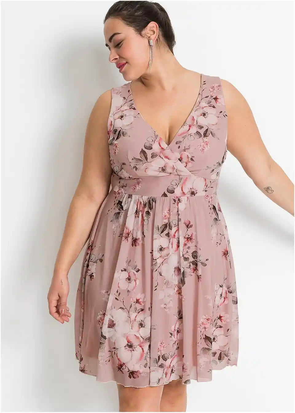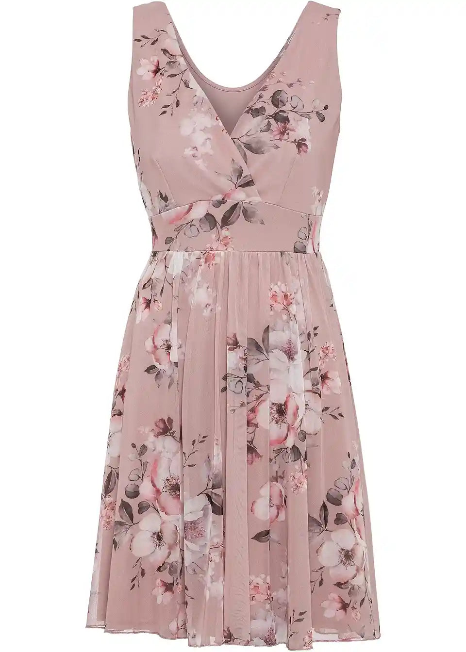 Ženstvena obleka znamke BODYFLIRT. Obleka iz mrežastega materiala ima globok izrez. Dolžina pri velikosti 36/38 je približno 94 cm.