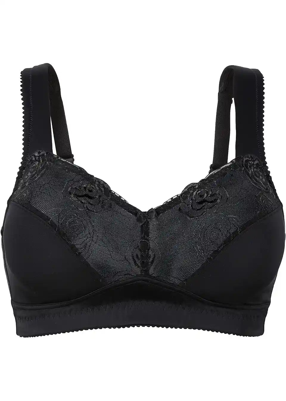 Ta Minimizer nedrček znamke bpc selection je posebej primeren za večje prsi. Posebna krojna oblika optično zmanjša videz prsi in nudi dobro oporo. Široke, podložene naramnice razbremenijo hrbet in preprečujejo rezanje materiala. Nepregleden nedrček brez kosti se ponaša z nežno cvetlično vezenino na zgornjem delu košarice. Pri večjih velikostih so zaponke in naramnice tega elegantnega modela širše.