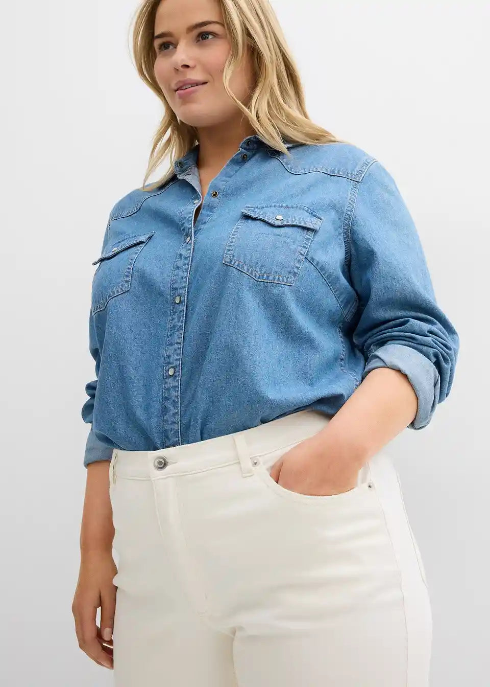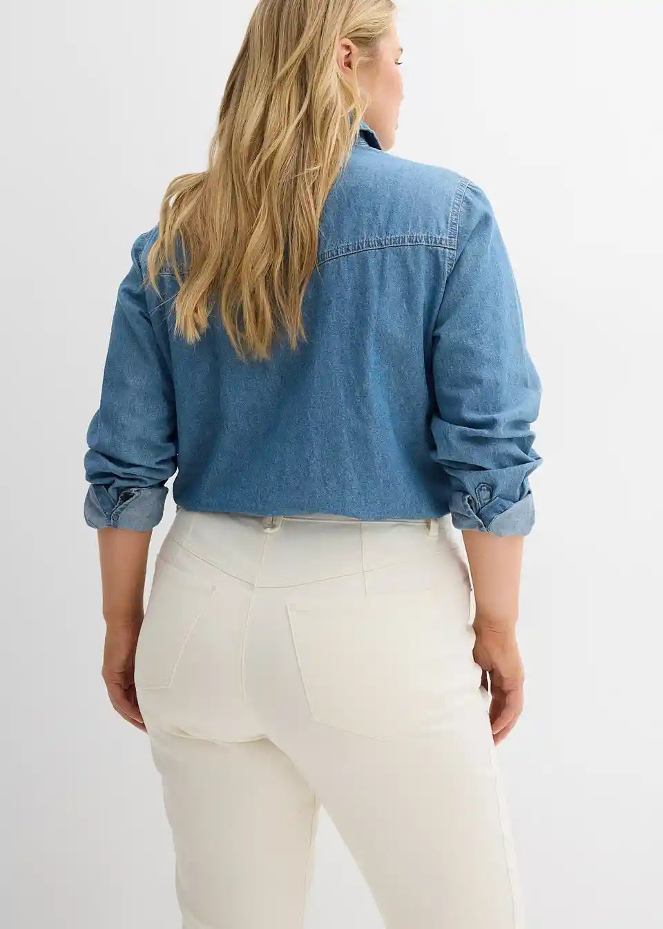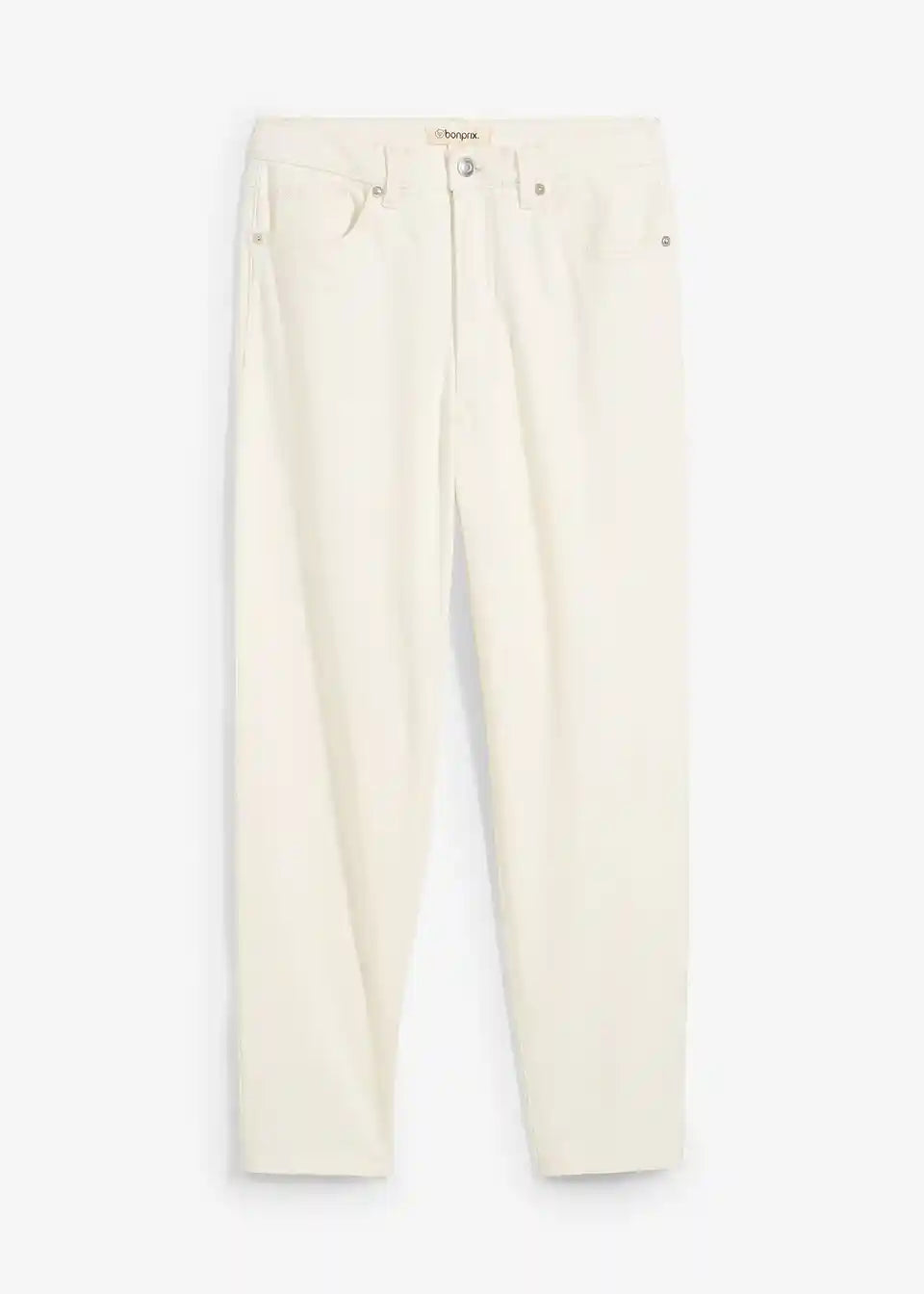 Svetlo modre jeans hlače s 5 žepi iz trpežnega bombažnega denima, ki je sprva nekoliko tog, a s pogostim nošenjem postane mehkejši in bolj prožen. Volnene bele jeans hlače s 5 žepi iz raztegljivega bombažnega denima. Dolžina notranjega šiva pri vel. 42 cca 64,5 cm, primerno za strojno pranje.