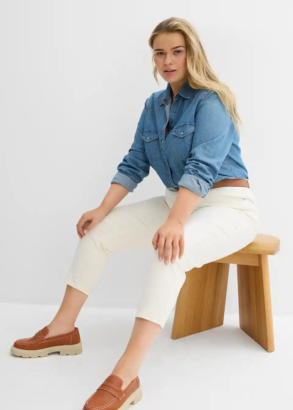 Mom kavbojke z zelo visokim udobnim pasom iz rahlo raztegljivega materiala v krajšem kroju