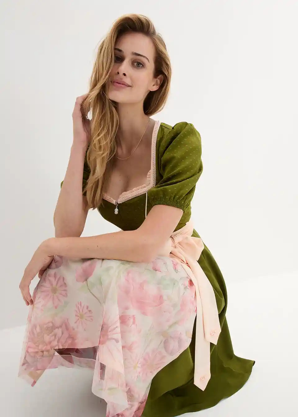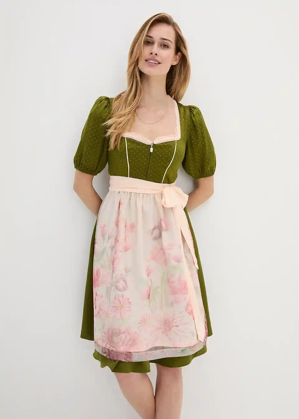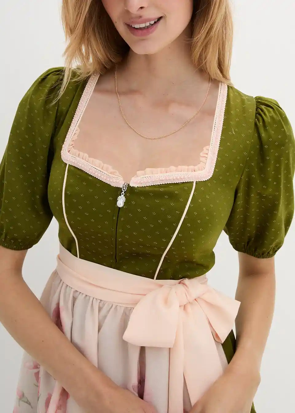 Dirndl z lepimi volančki, nežno potiskano predpasnikom in napihnjenimi rokavi, lahko se nosi brez bluze