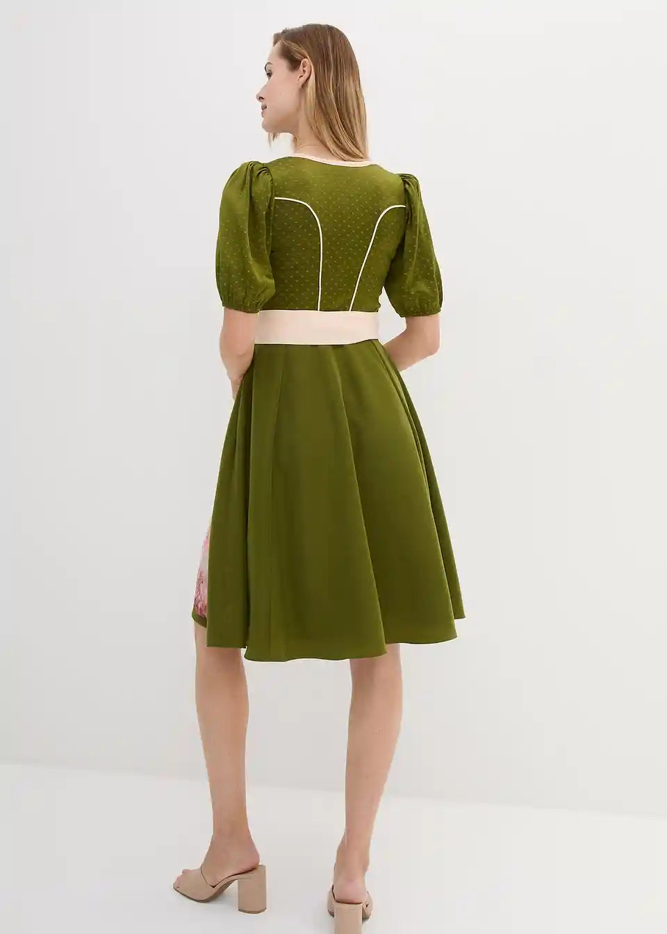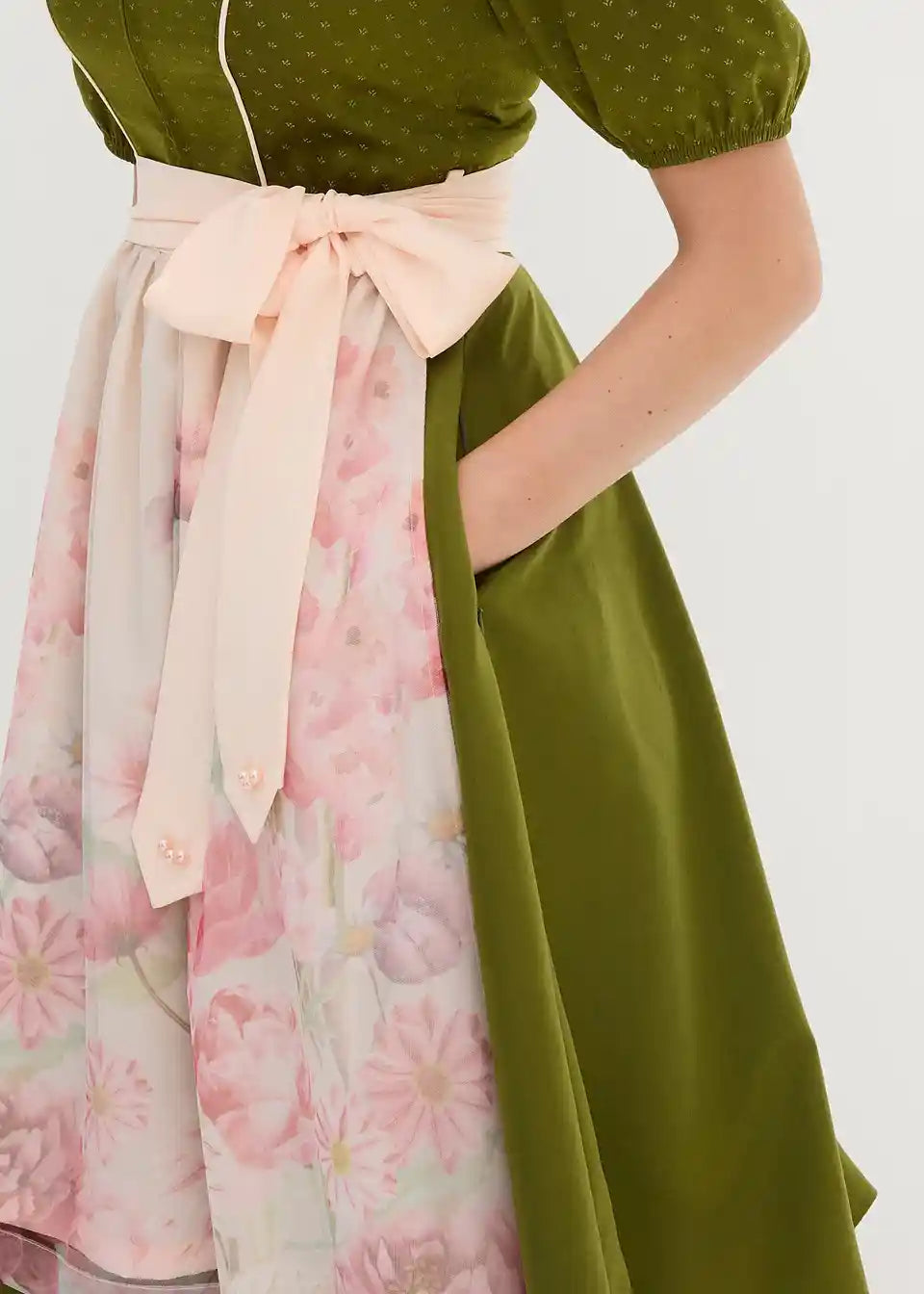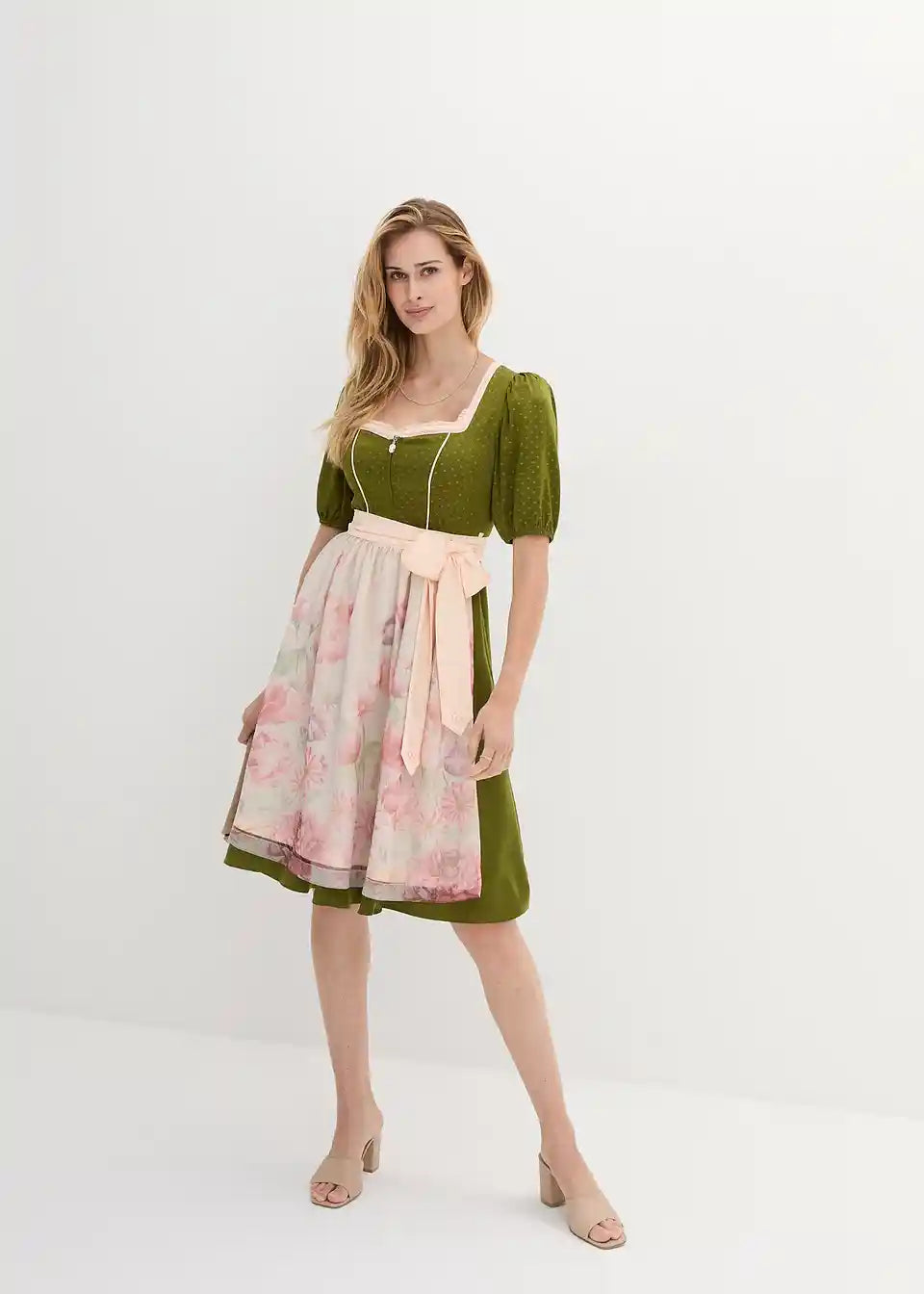 Dirndl z lepimi volančki, nežno potiskano predpasnikom in napihnjenimi rokavi, lahko se nosi brez bluze