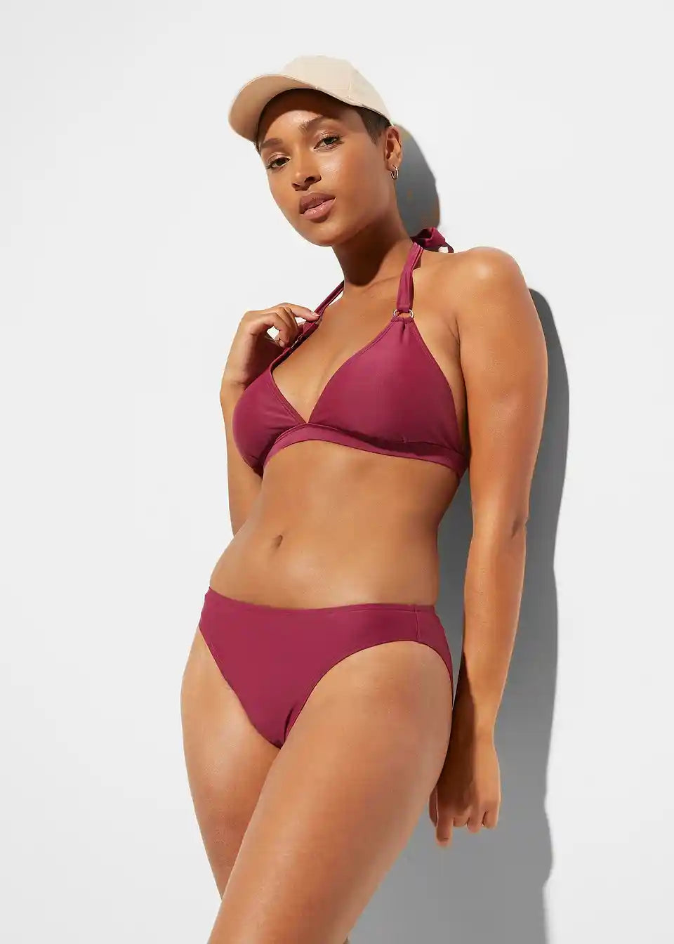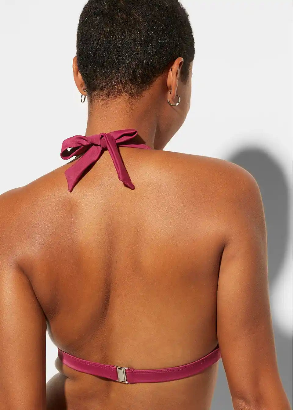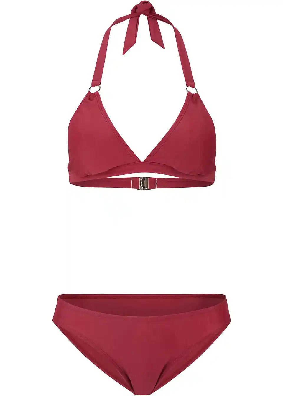 Ta moderen Neckholder-bikini znamke bpc vas bo navdušil za kopanje. Naramnice, ki se zavežejo na vratu, so okrašene s srebrnimi obročki. Zgornji del je podložen. Mehki košarici, ki oblikujeta, je mogoče po potrebi odstraniti. Na hrbtni strani je praktična zaponka na klik. Bikini hlačke imajo sodoben kroj, sprednja stran je prav tako podložena.