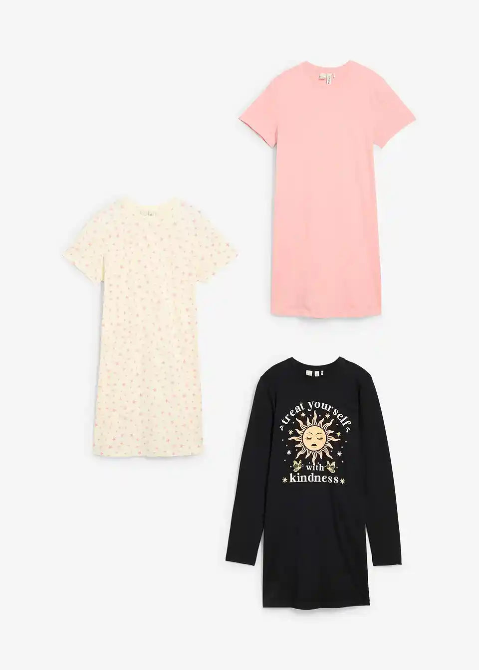 Dekliška nočna srajca iz čiste organske bombažne tkanine v pakiranju po 3. Dve s kratkimi rokavi in ena z dolgimi rokavi.